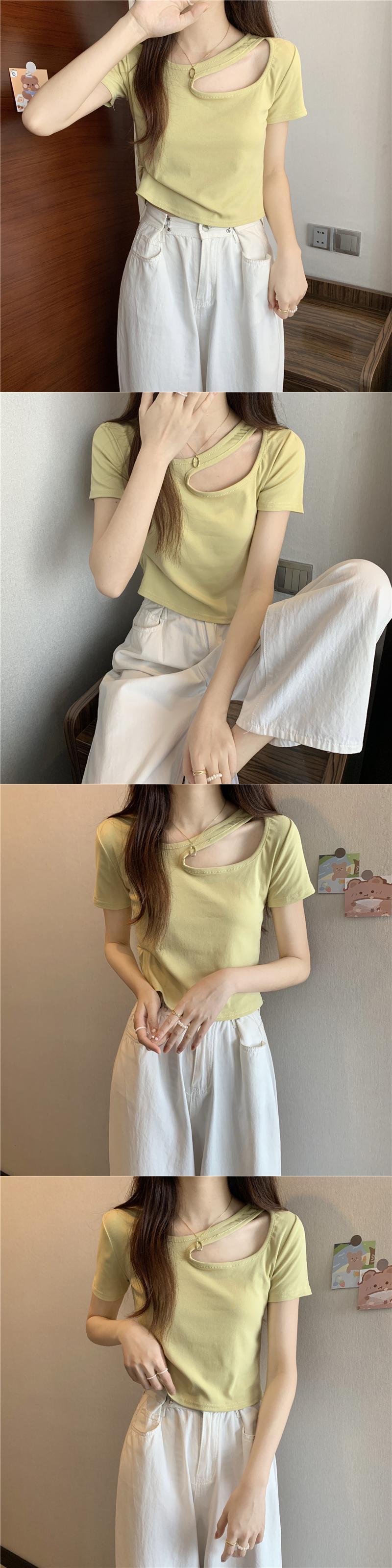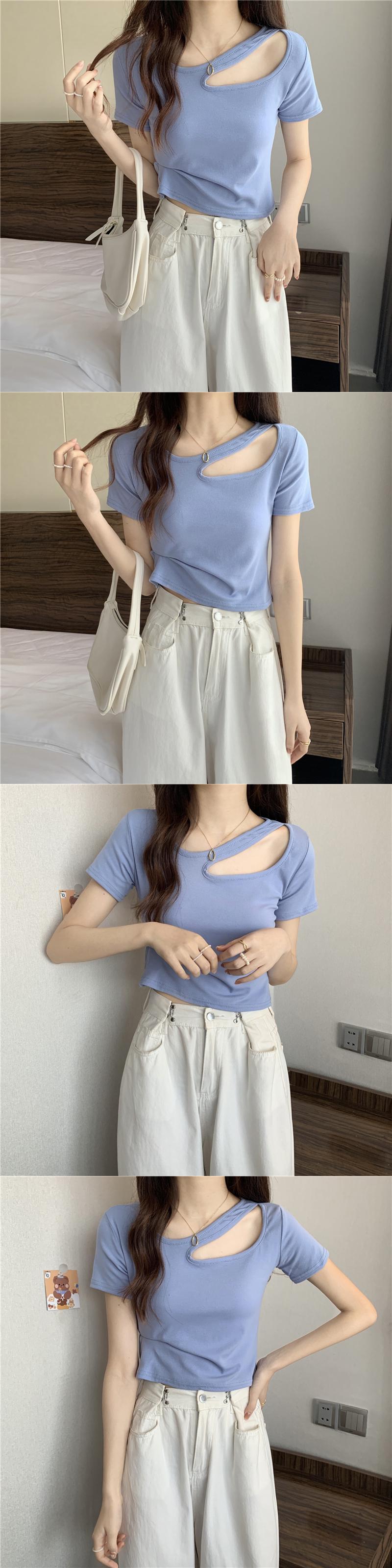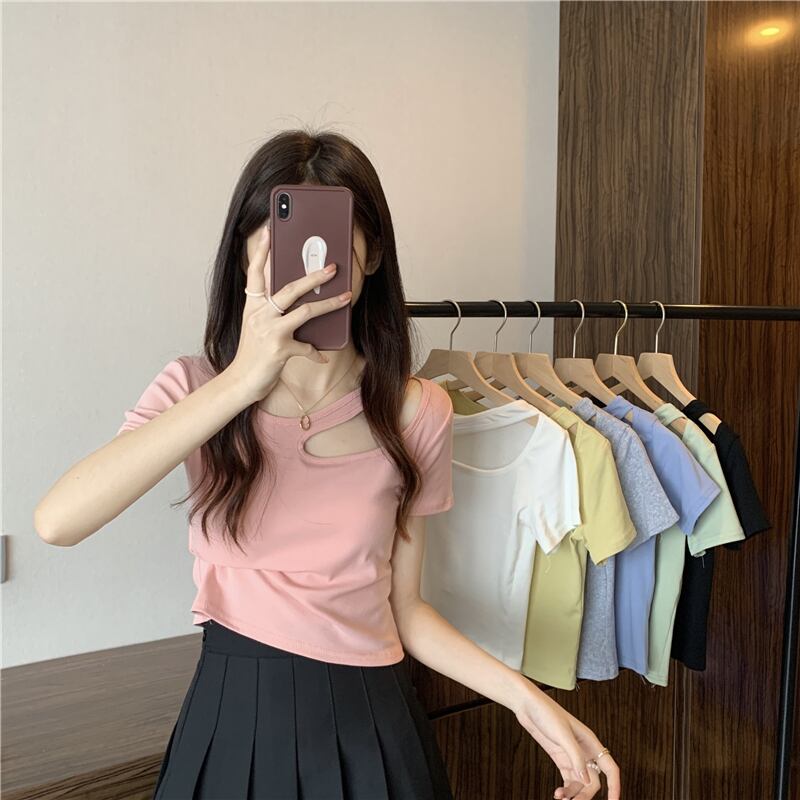 フロントショルダー半袖Tシャツレディースサマースモールホットガールスリムフィットシンウエストショートカットアウトショルダー鎖骨トップ ハーフスリーブ 夏物 7460074804329407 | framboise21