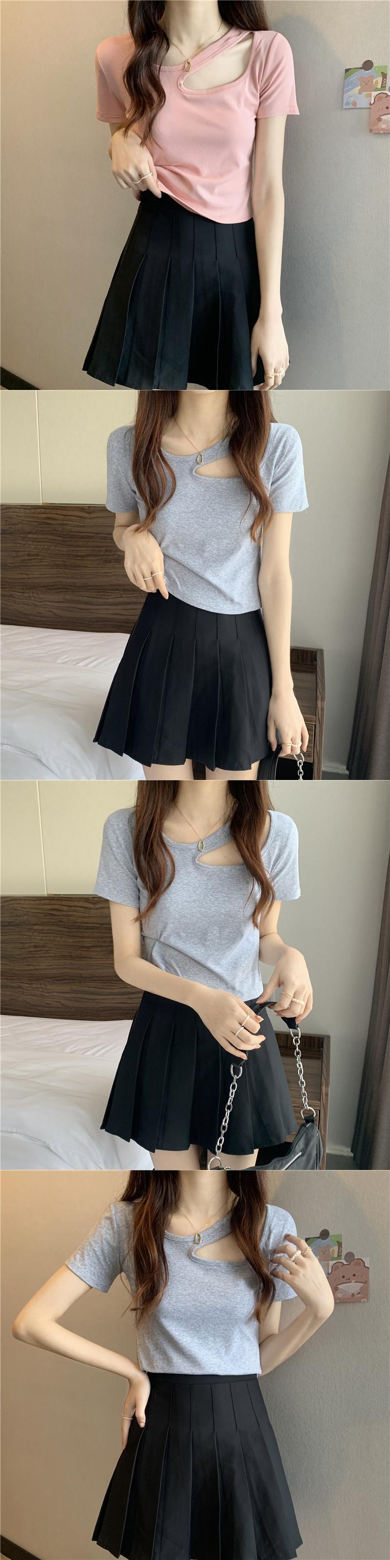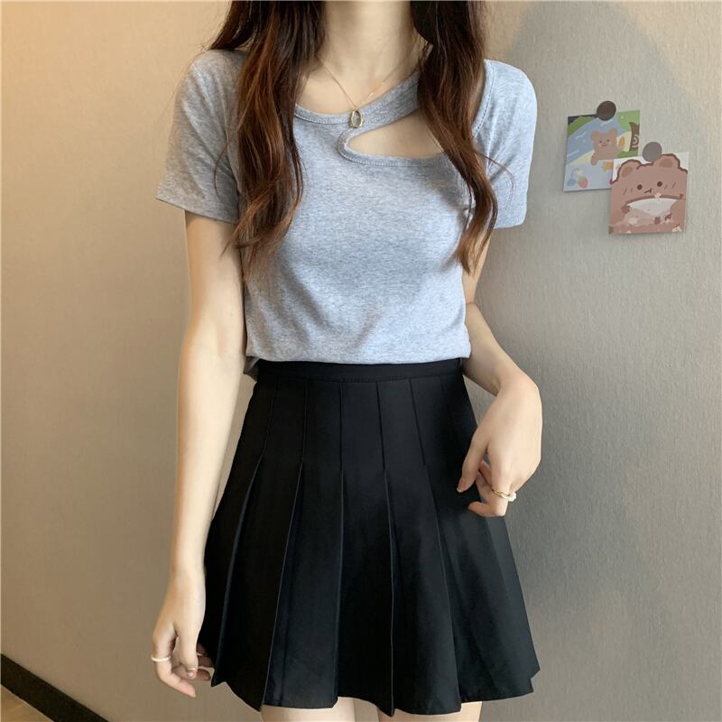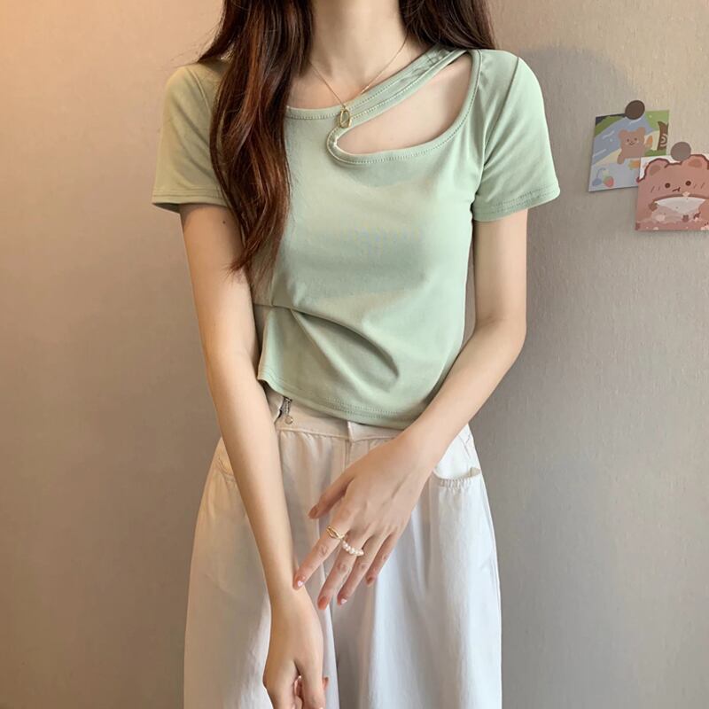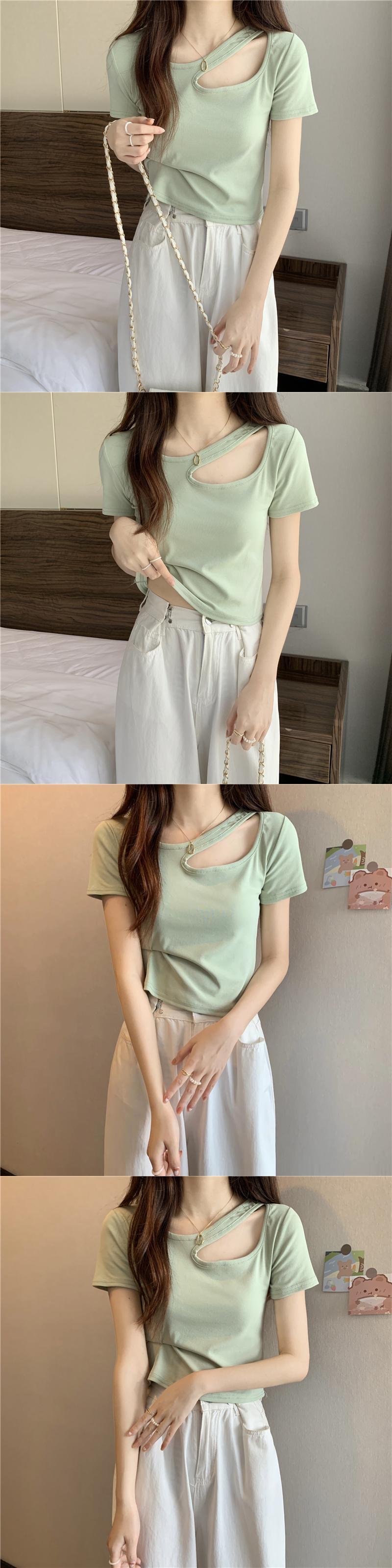 フロントショルダー半袖Tシャツレディースサマースモールホットガールスリムフィットシンウエストショートカットアウトショルダー鎖骨トップ ハーフスリーブ 夏物 7460074804329407 | framboise21