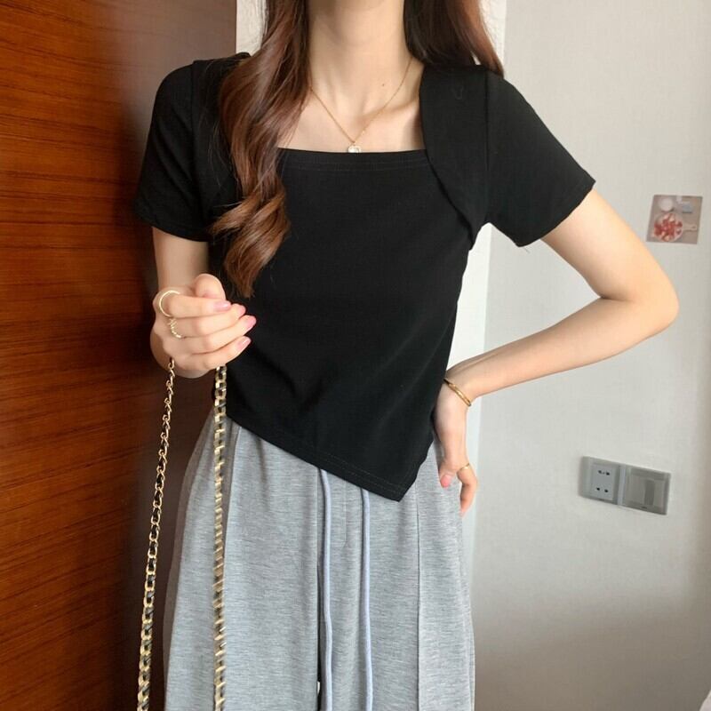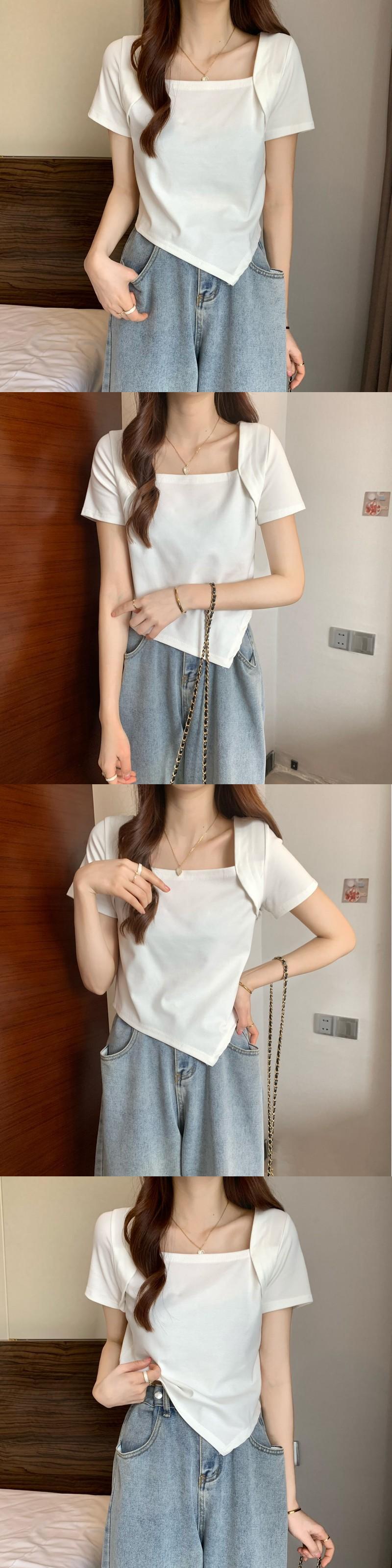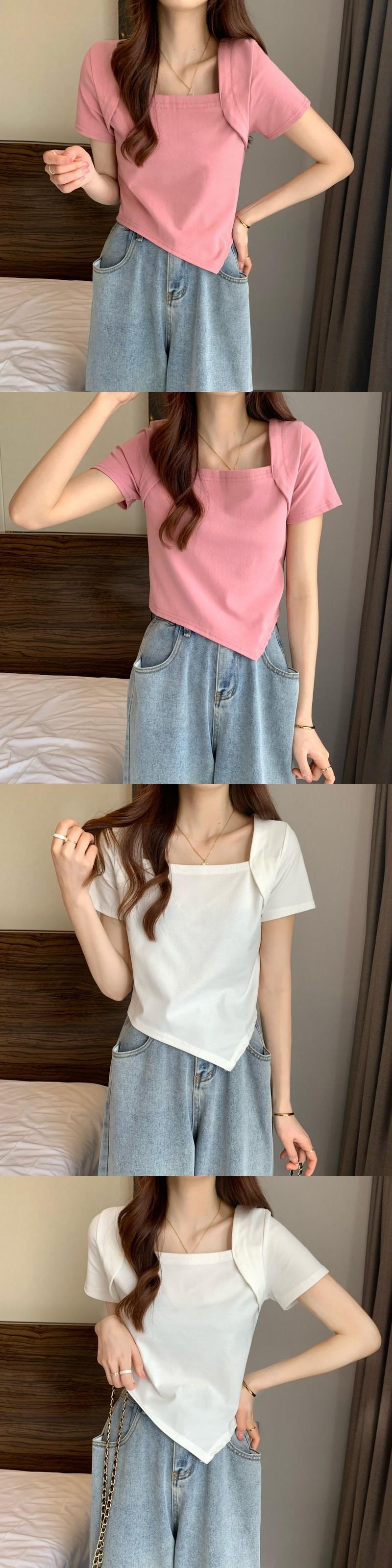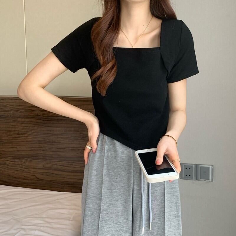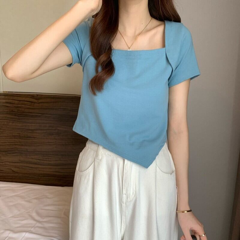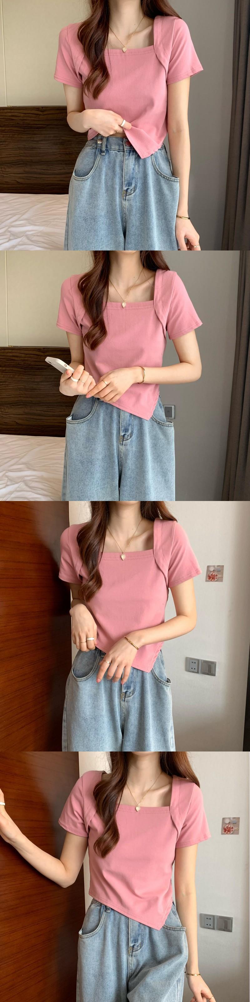 スクエアカラー不規則なデザインセンスニッチショートトップレディースサマー薄切片インスーパーハイウエストピンク半袖Tシャツ ハイウェスト 夏物 スクウェア 7460082650110523 | framboise21