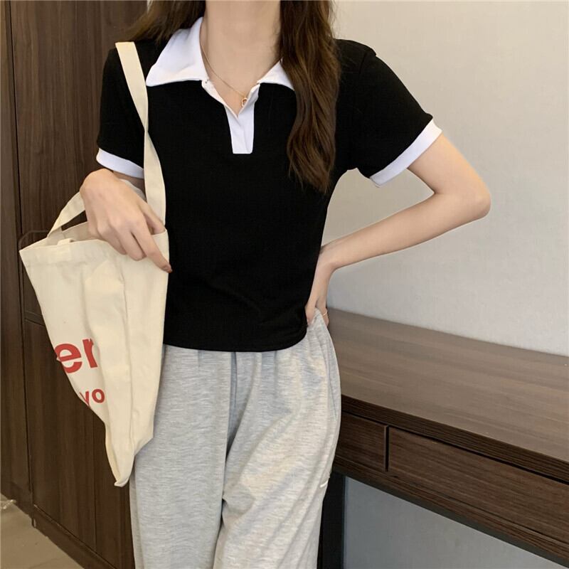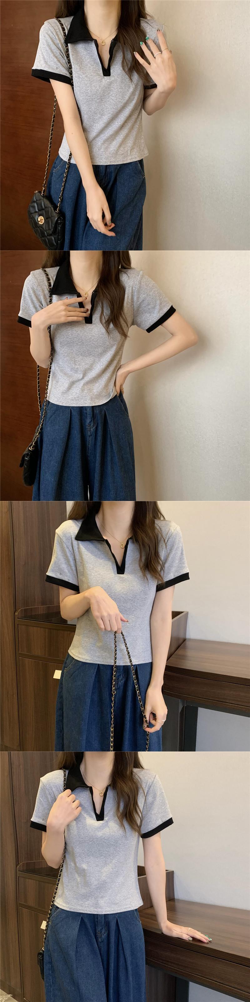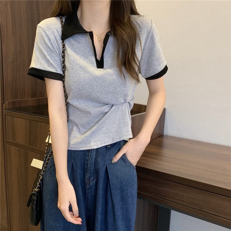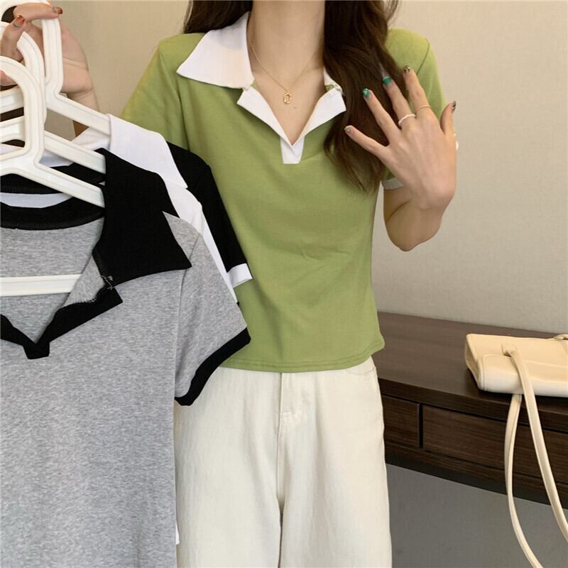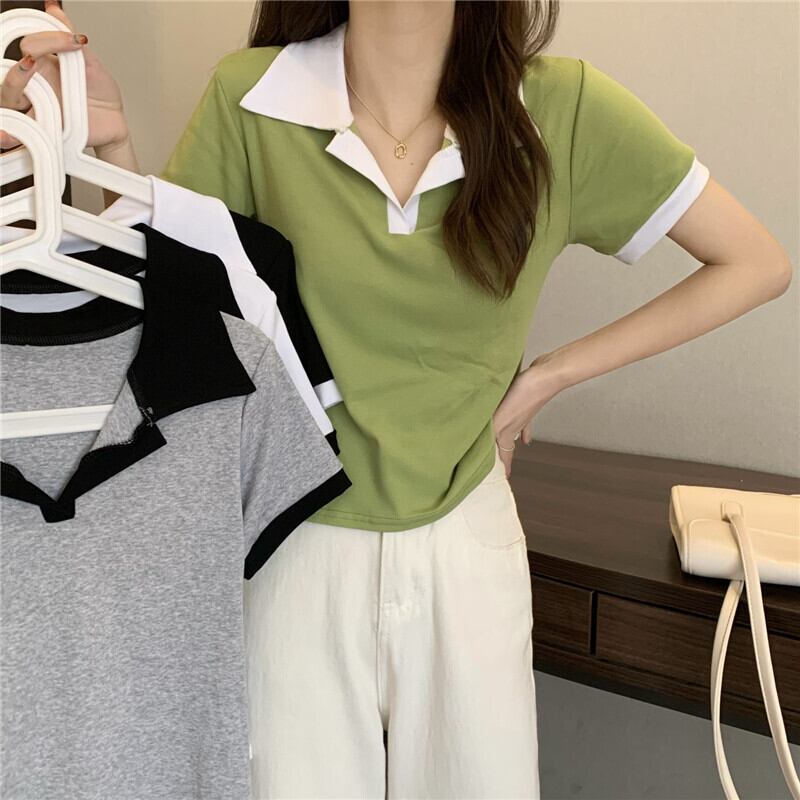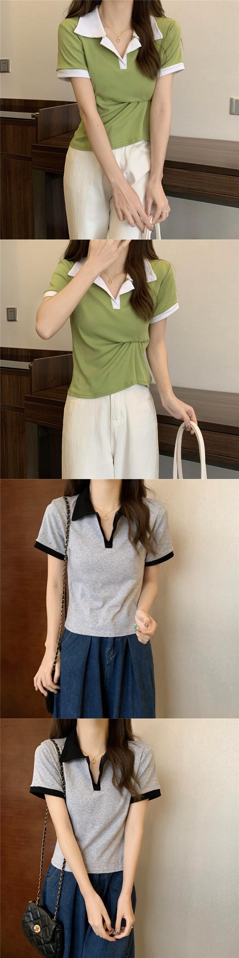 Vネックポロシャツアボカドグリーン半袖フロントショルダーTシャツレディースサマースリムフィットオールマッチカラーブロッキングクロップドトップ、ワイドレッグパンツ 夏物 7460062142762596 | framboise21