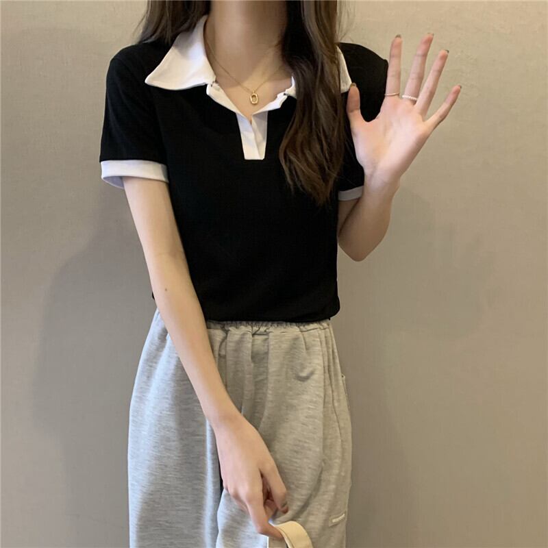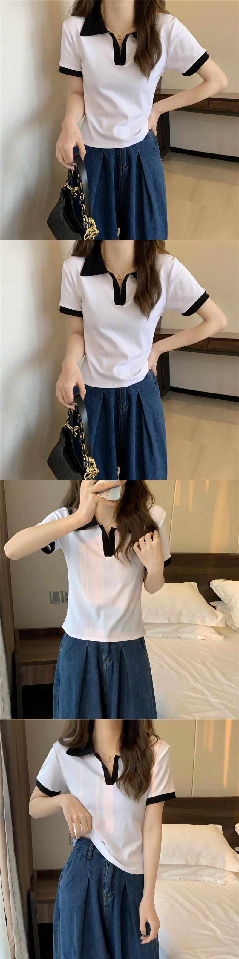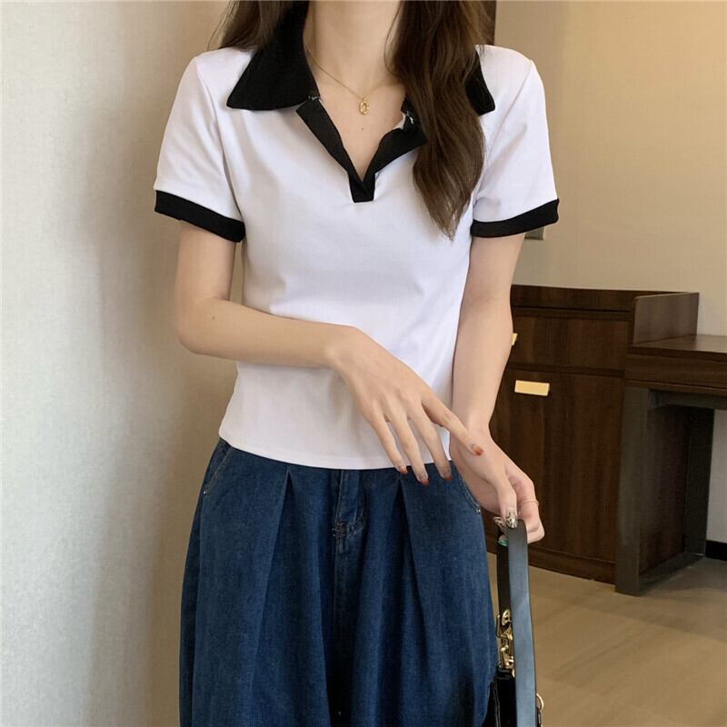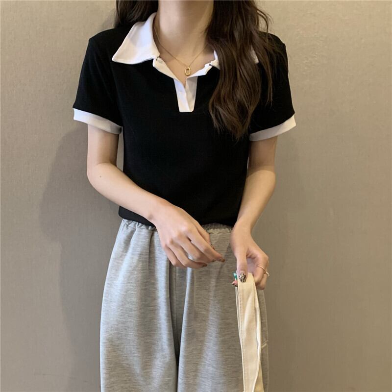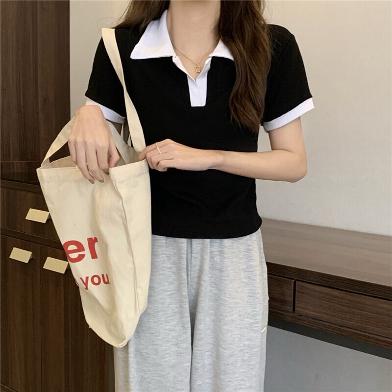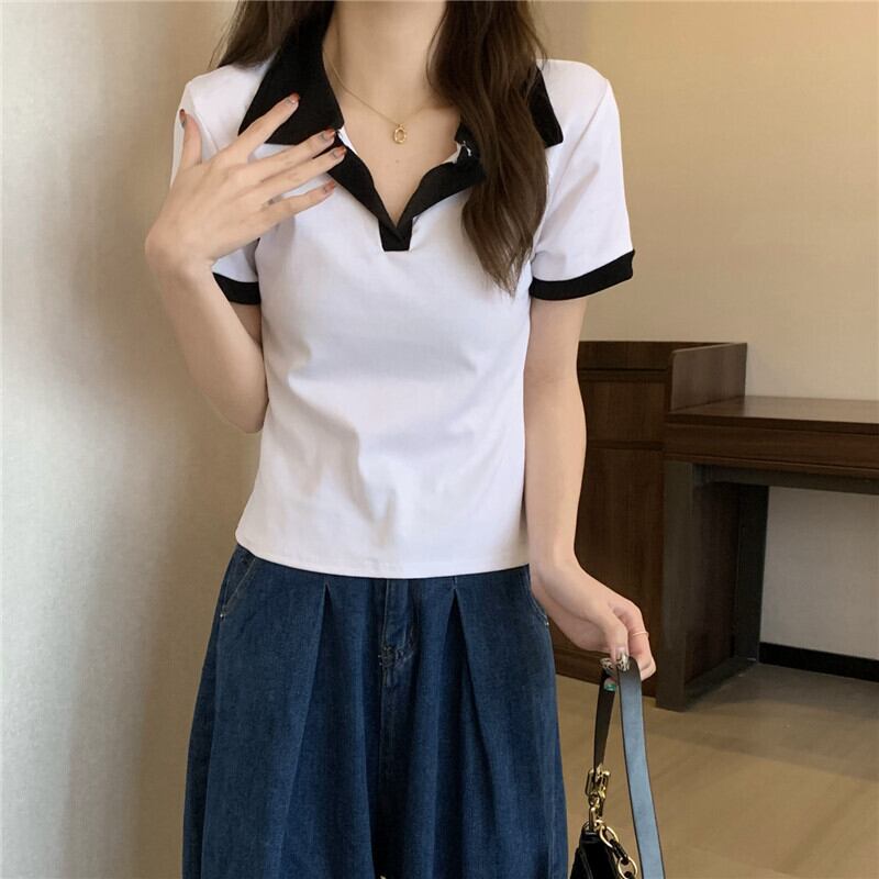 Vネックポロシャツアボカドグリーン半袖フロントショルダーTシャツレディースサマースリムフィットオールマッチカラーブロッキングクロップドトップ、ワイドレッグパンツ 夏物 7460062142762596 | framboise21