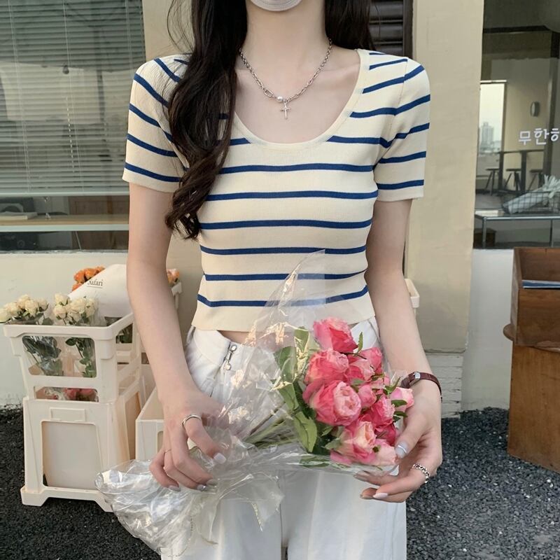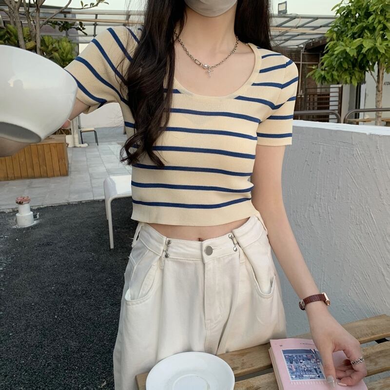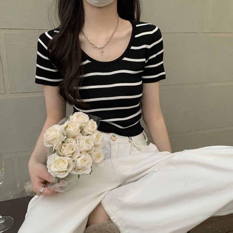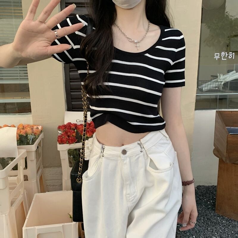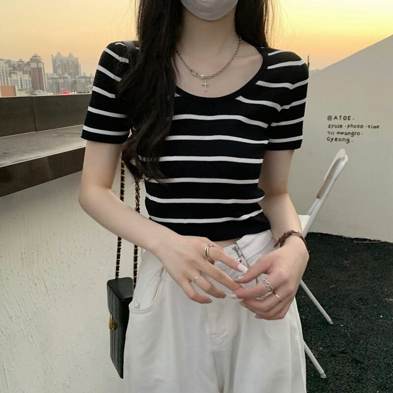 黒と白のストライプのTシャツ女性の半袖2022年の新しい夏の自己栽培ハイウエストデザインセンスニッチショートトップ ホワイト ブラック サマー 夏物 746001813912913 | framboise21