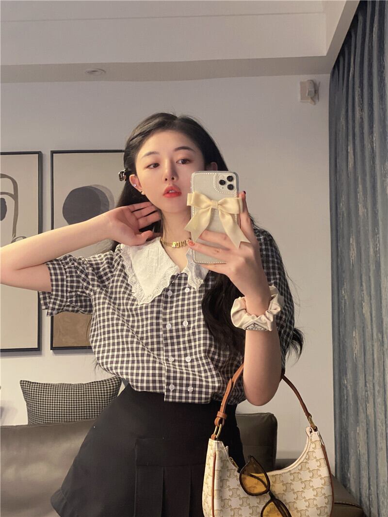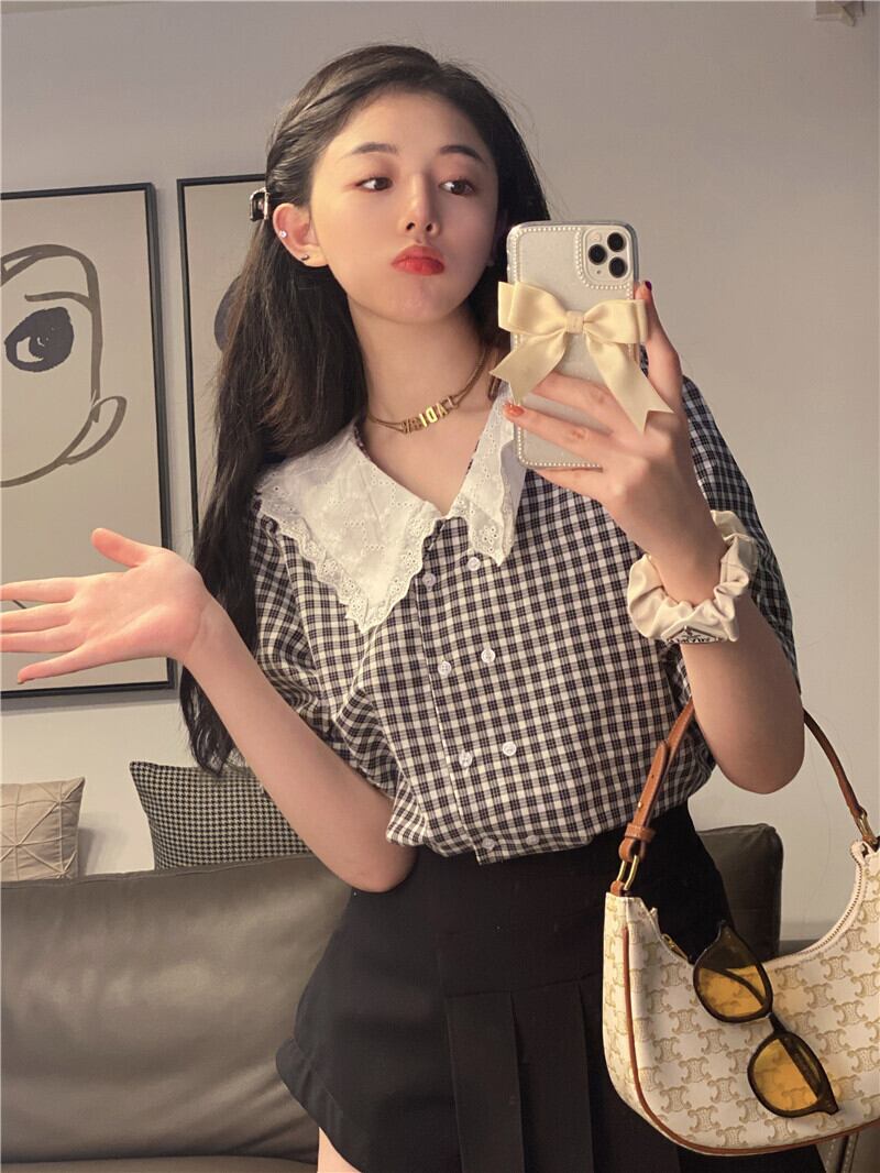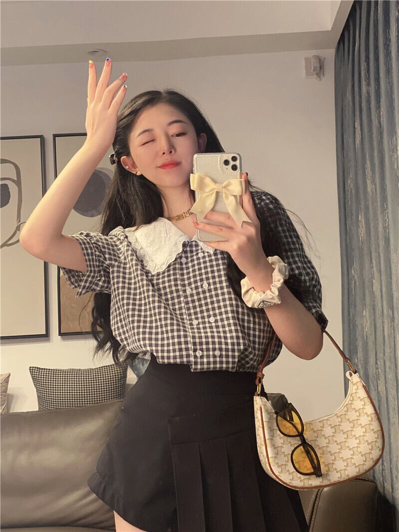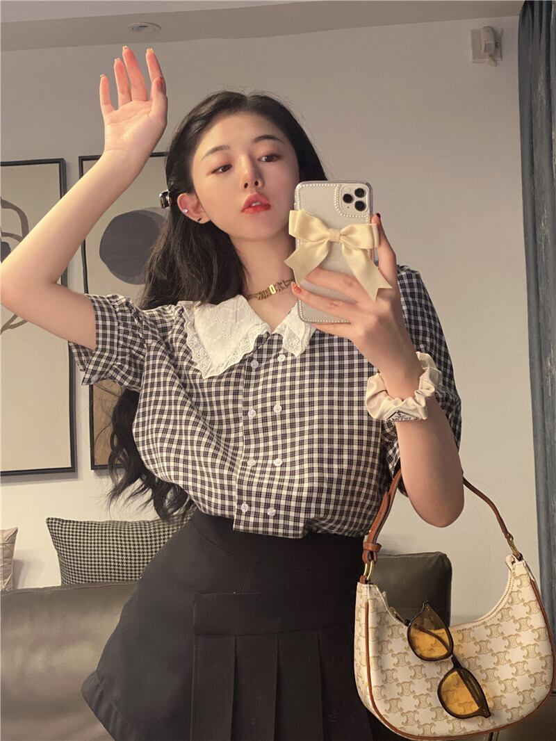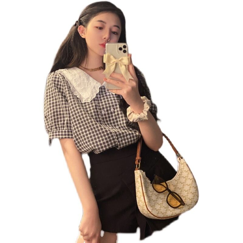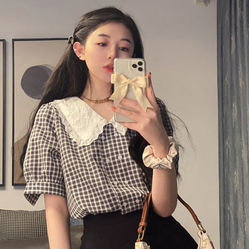 パフスリーブスウィートトップレディース夏2022年新作ドールカラーデザインセンススモールチェック柄半袖シャツ夏 大人ガーリー キュート カジュアル サマー 夏物 7460062160112040 | framboise21