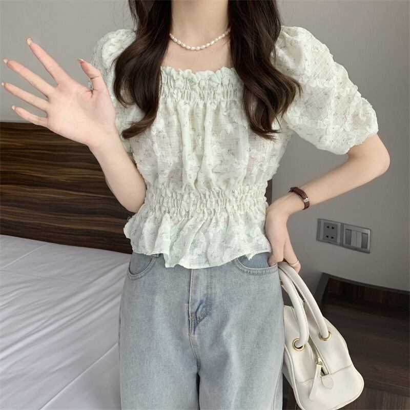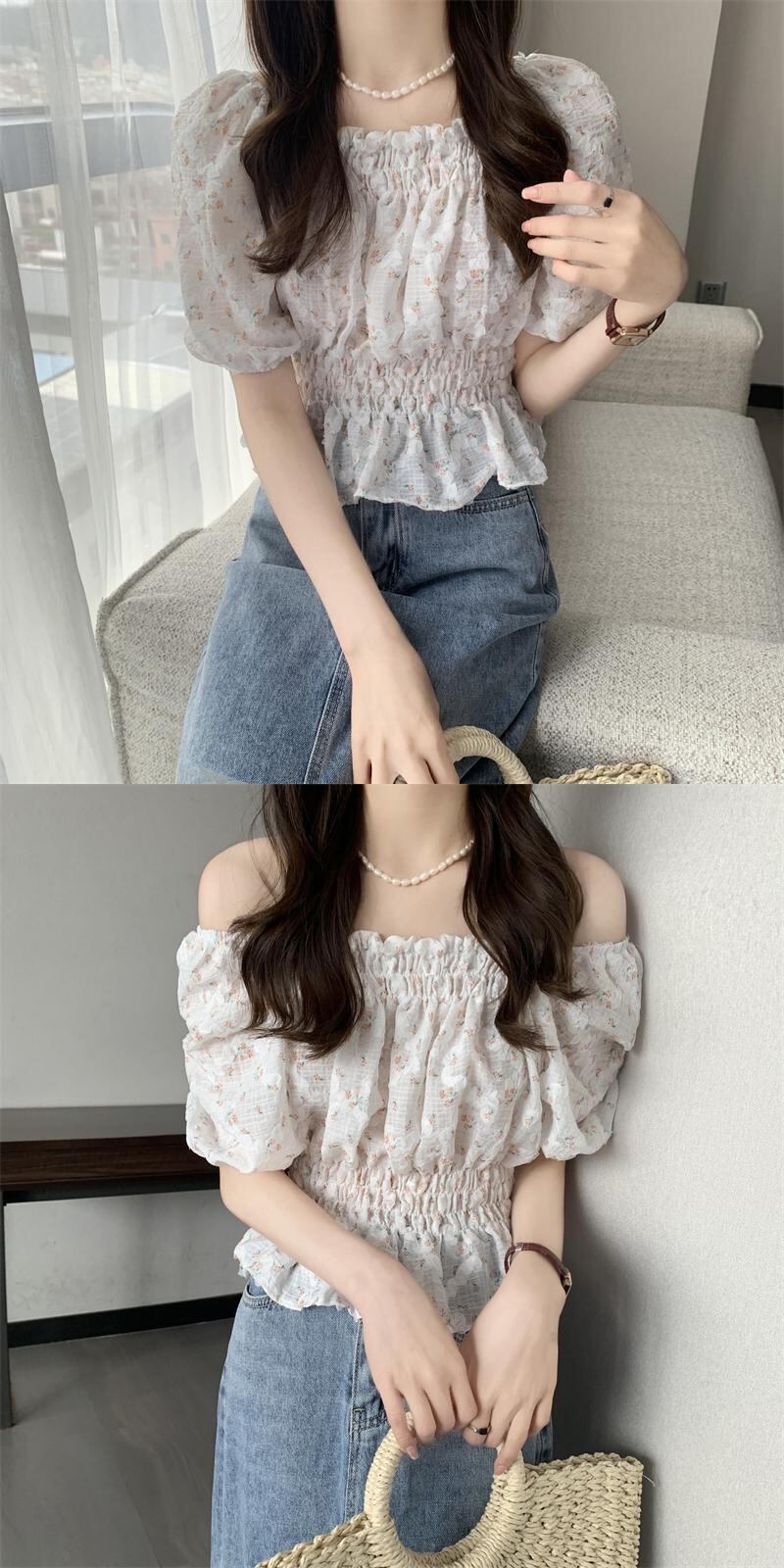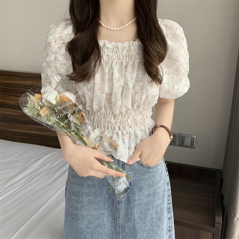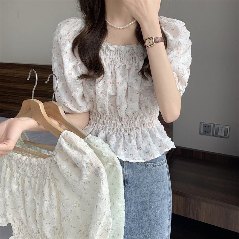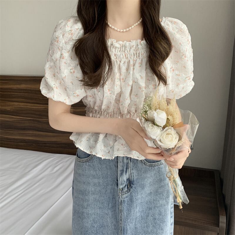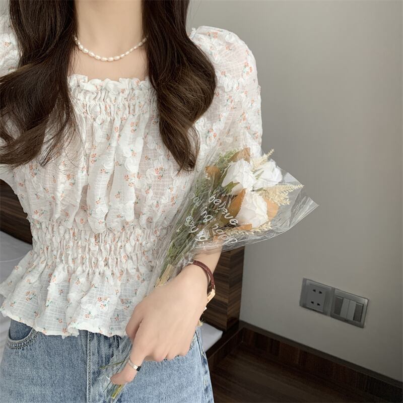 フレンチカラーボーンスクエアカラーフローラルシャツ半袖レディースサマーシックウエストスモールシャツパフスリーブショートシフォントップス 夏物 花柄 スクウェア 7460042649463122 | framboise21