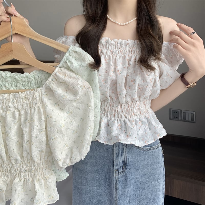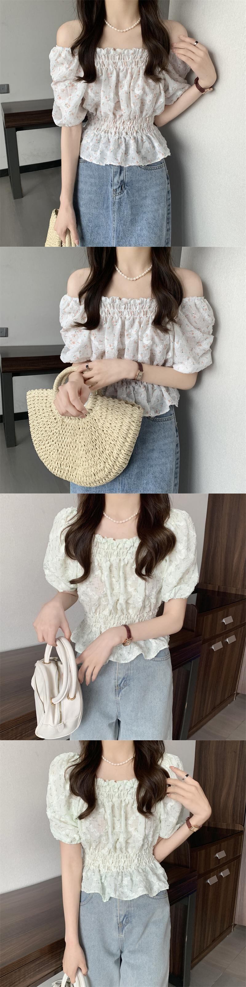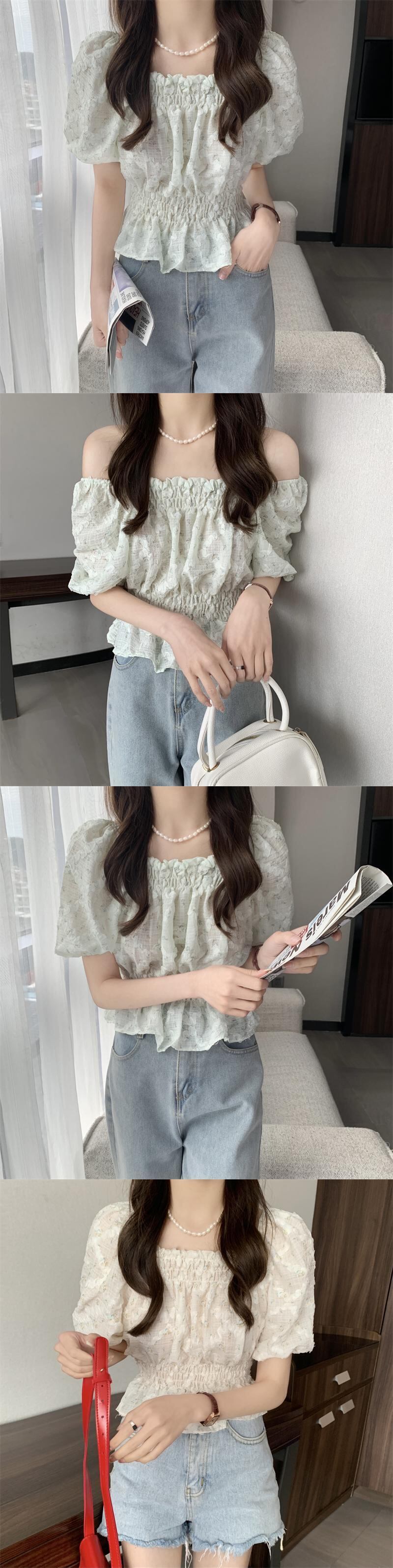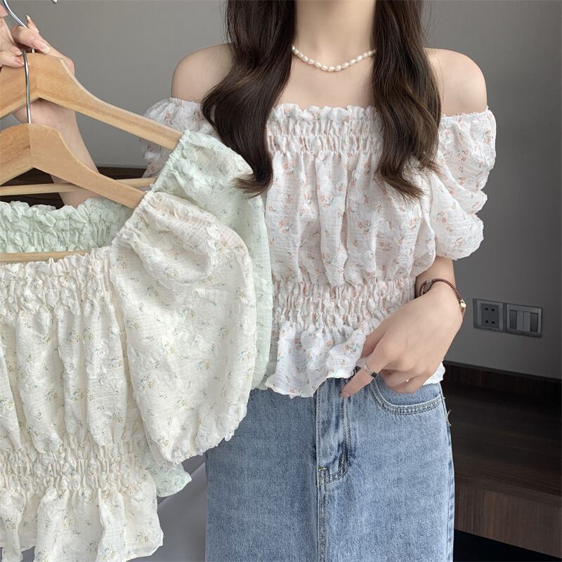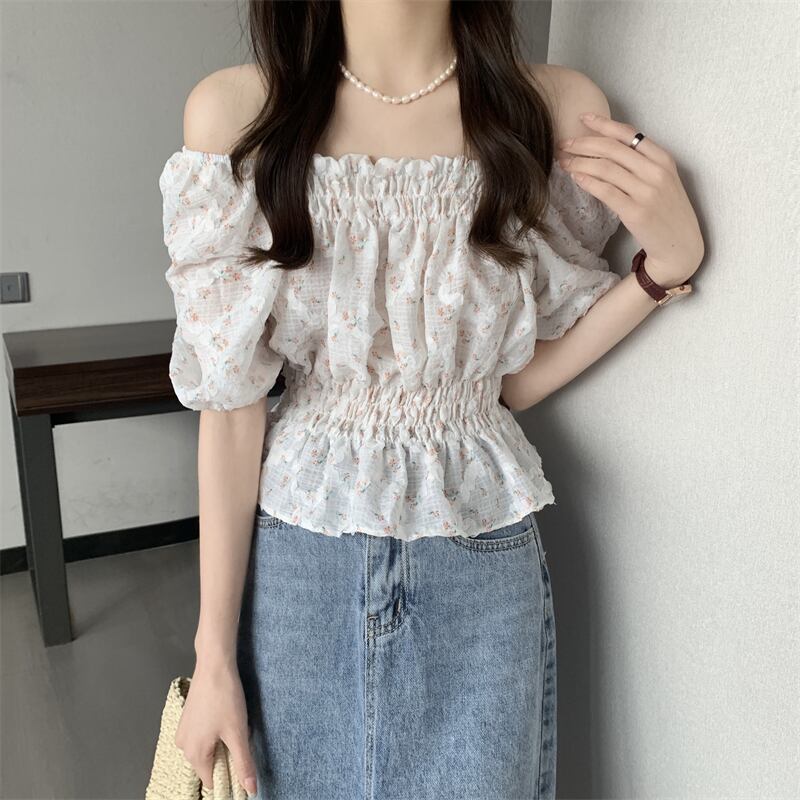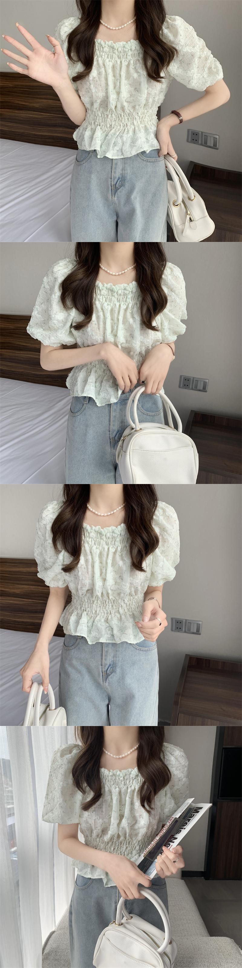 フレンチカラーボーンスクエアカラーフローラルシャツ半袖レディースサマーシックウエストスモールシャツパフスリーブショートシフォントップス 夏物 花柄 スクウェア 7460042649463122 | framboise21
