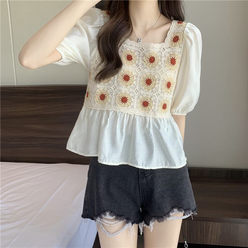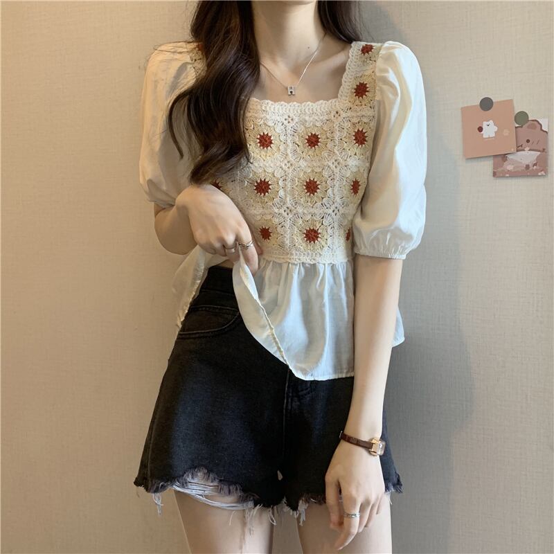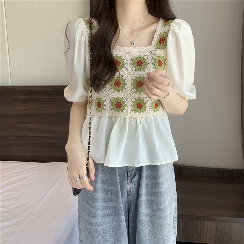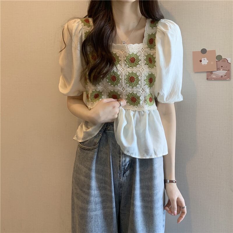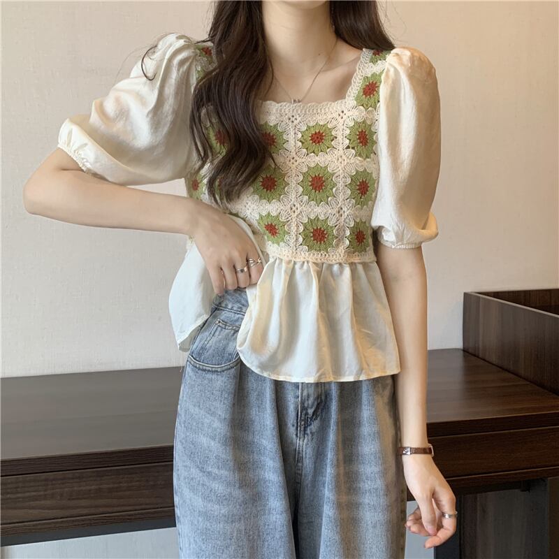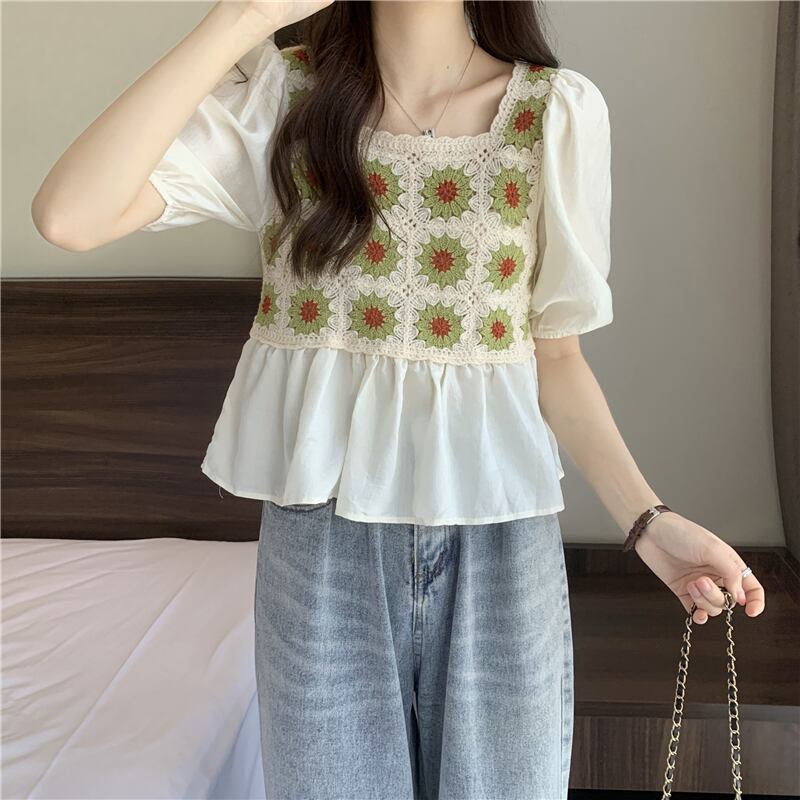 ベビーブラウス半袖シャツレディースサマーフレンチカラーボーンスクエアカラーウエスタンスタイルならではのパフスリーブショートシフォントップ 夏物 スクウェア 7460035385256845 | framboise21