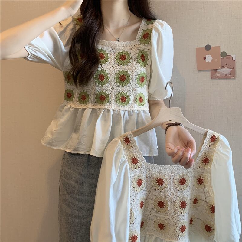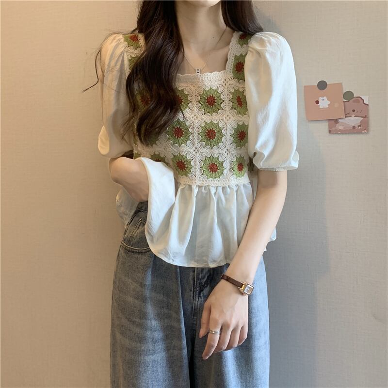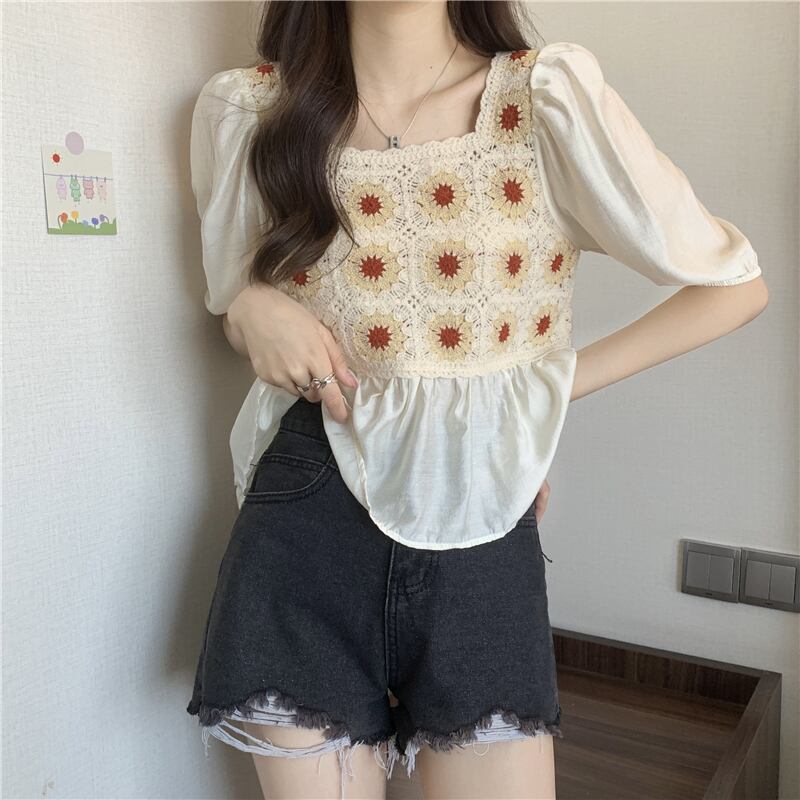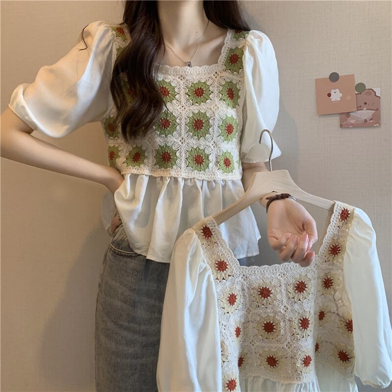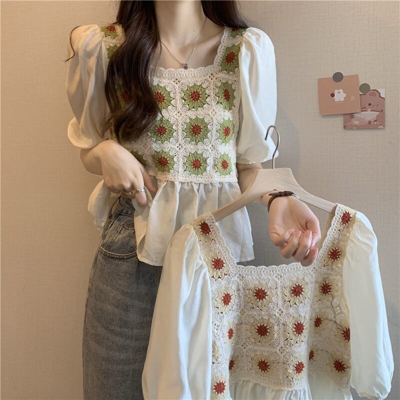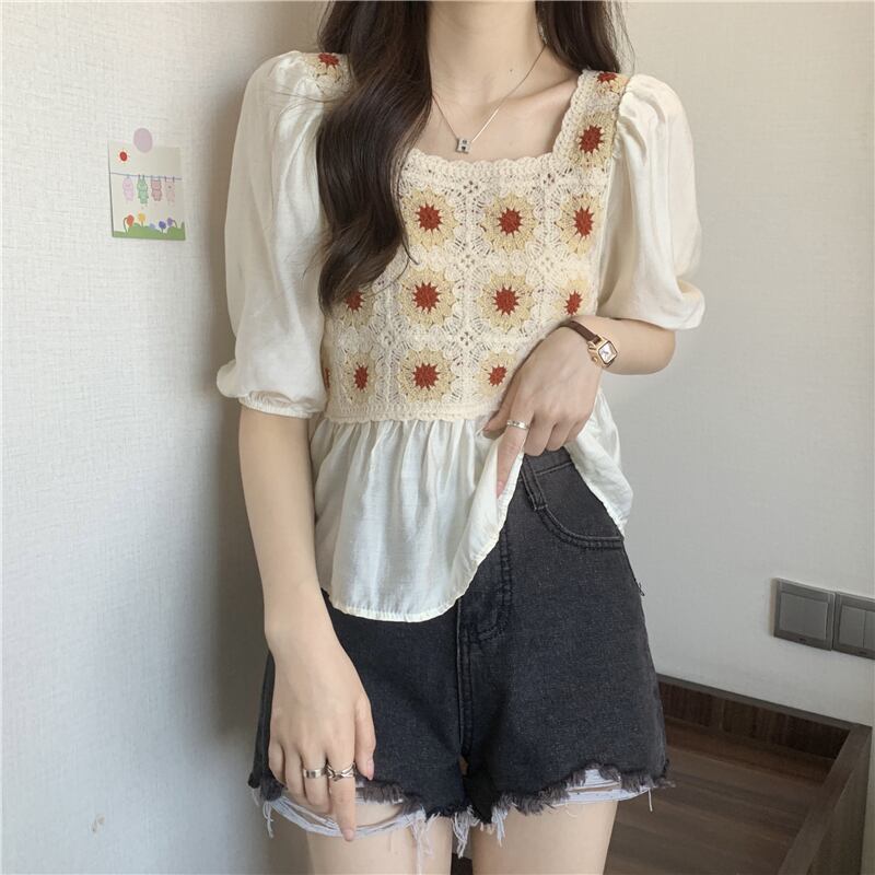 ベビーブラウス半袖シャツレディースサマーフレンチカラーボーンスクエアカラーウエスタンスタイルならではのパフスリーブショートシフォントップ 夏物 スクウェア 7460035385256845 | framboise21