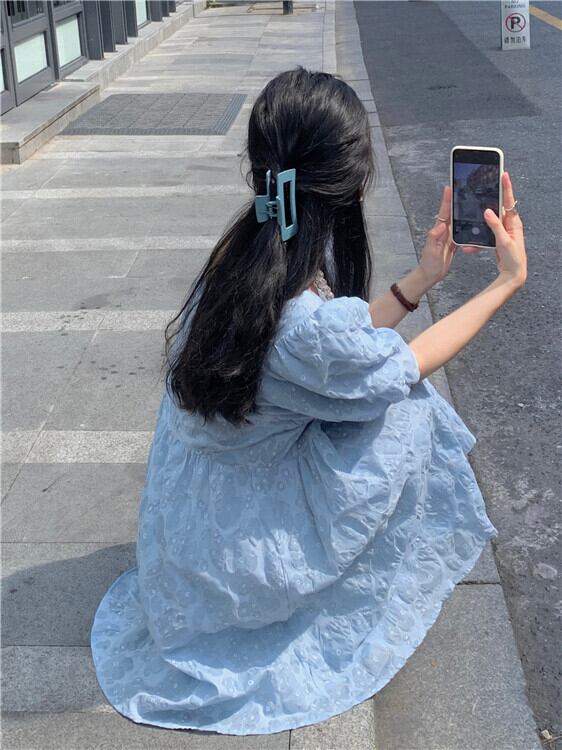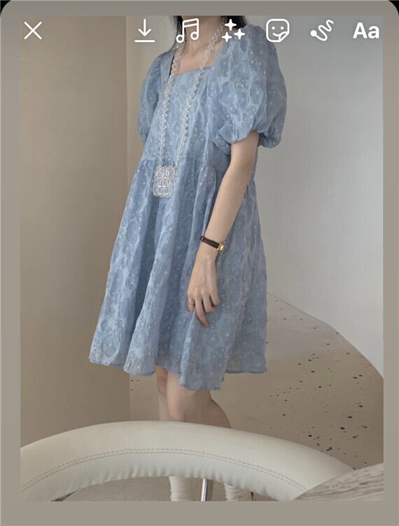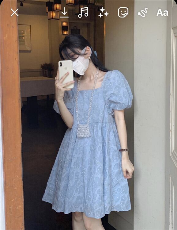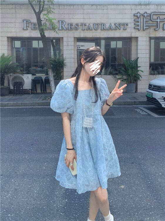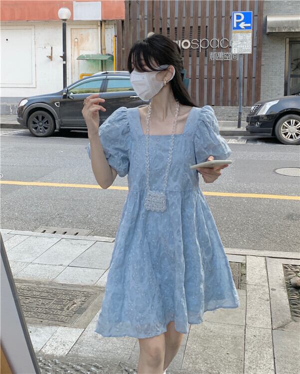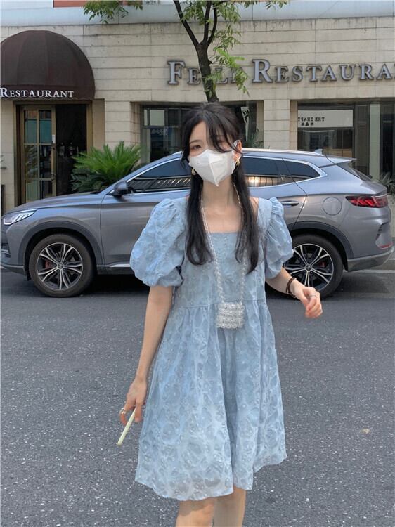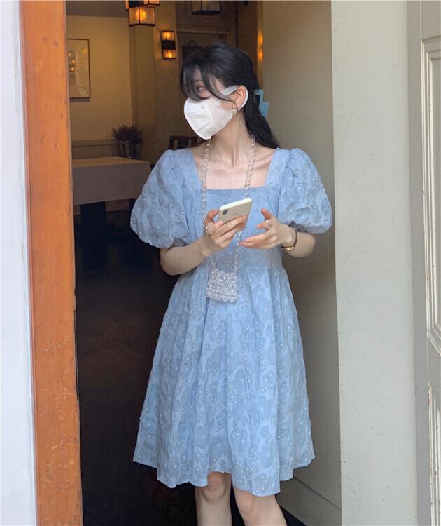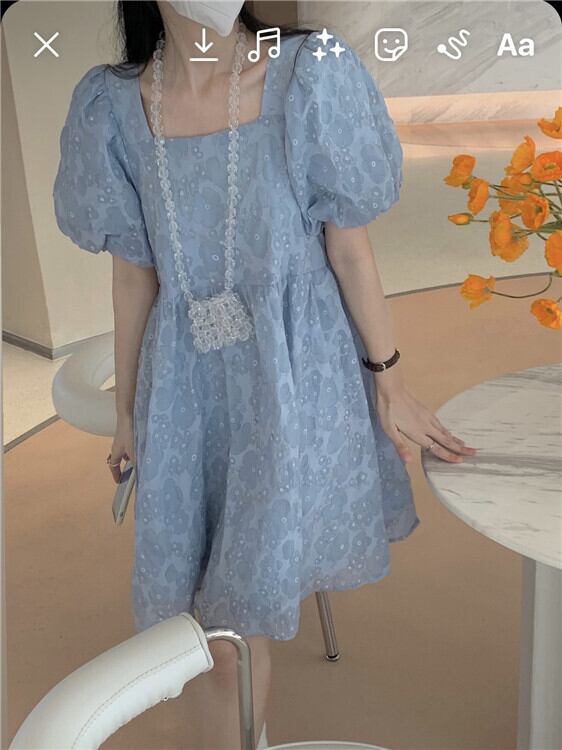 青い花柄ドレス女性夏バブル半袖人形スカート小さな四角い首初恋プリンセスチュチュスカート ブルー サマー 夏物 パニエ ペチコート スクウェア 746007468643441 | framboise21