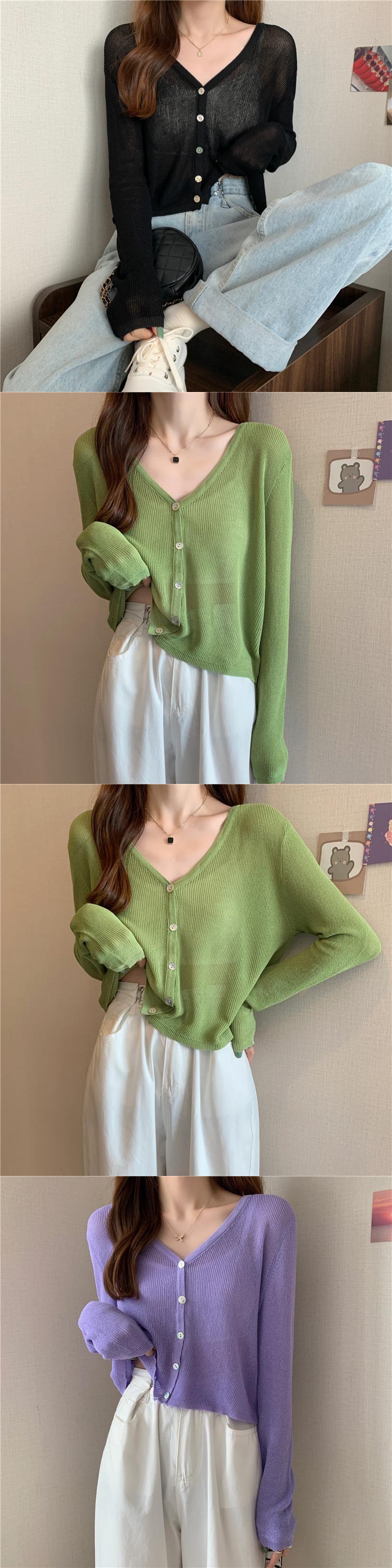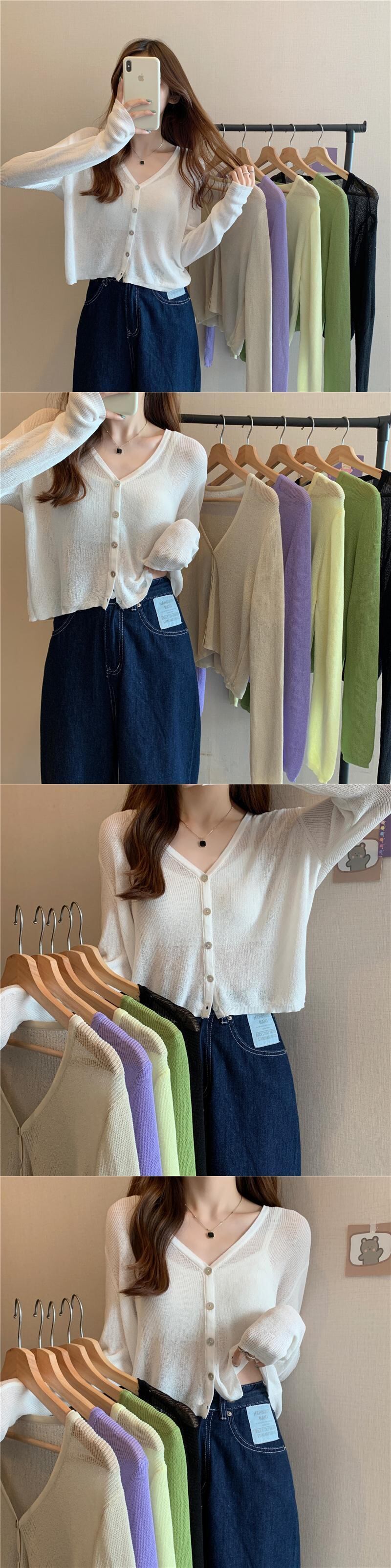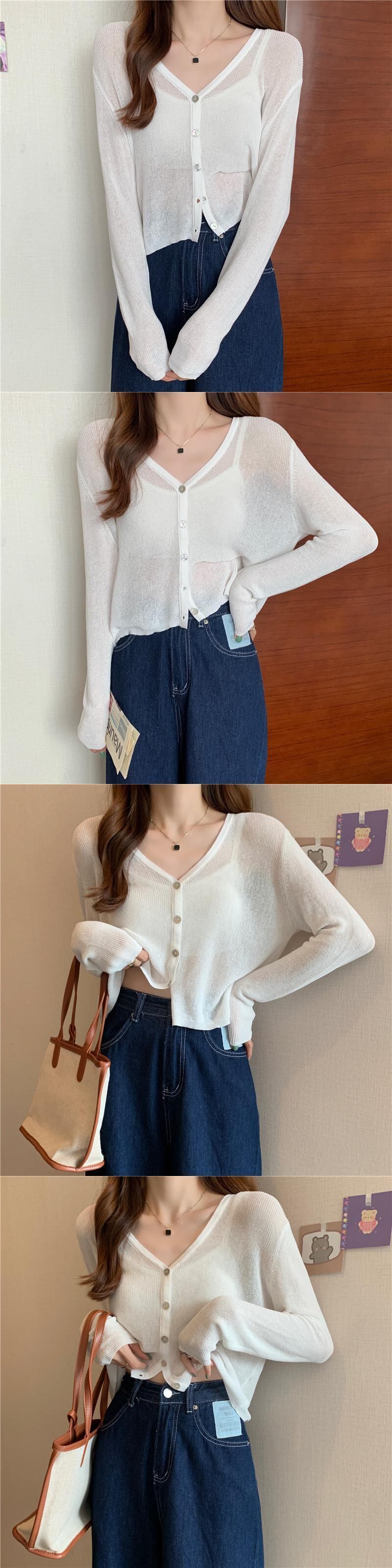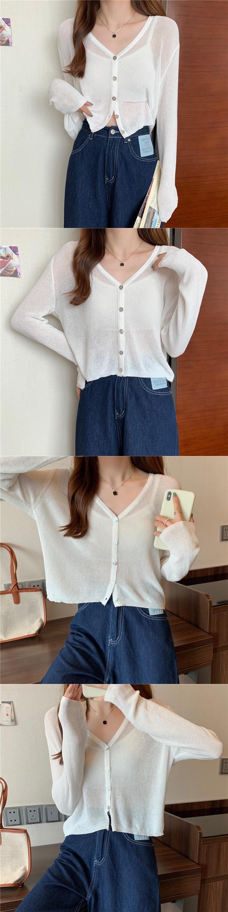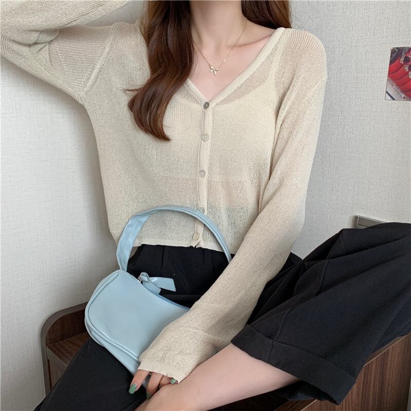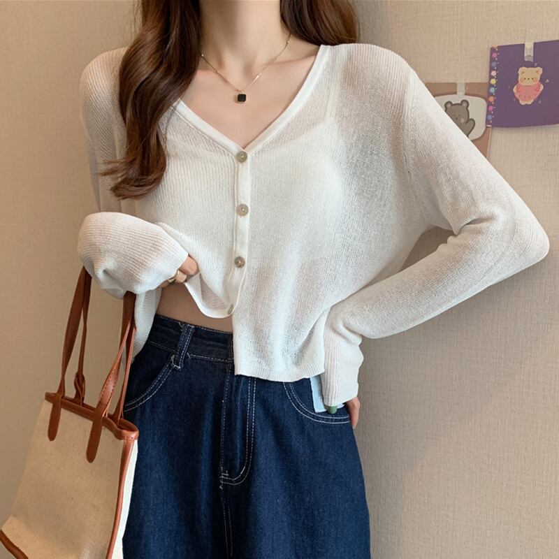 日焼け止めニットカーディガン女性の夏の薄いアイスシルクブラウスコート、外側にサスペンダー、白いVネック長袖エアコンシャツ ロング ホワイト サマー 夏物 7460016840609708 | framboise21