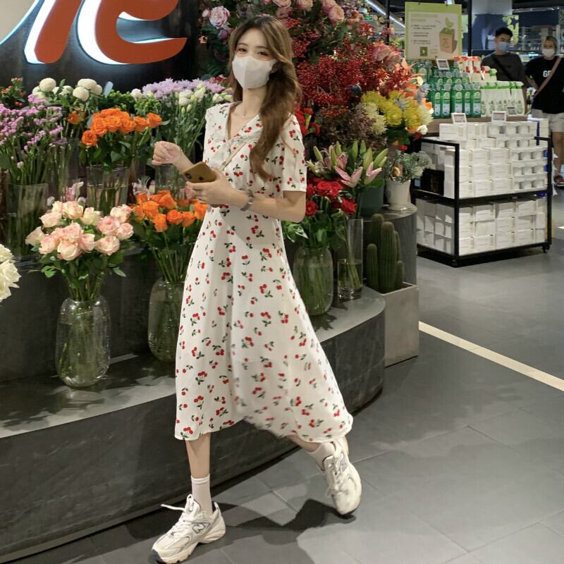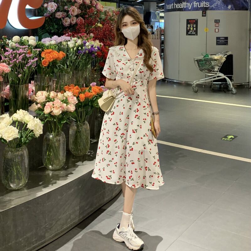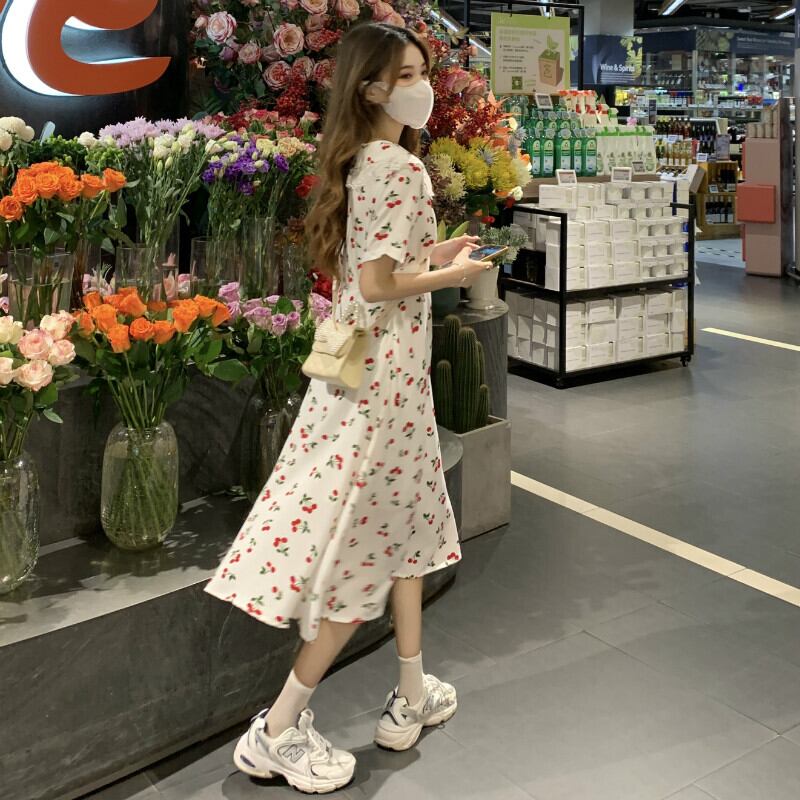 ドールカラードレス女性夏薄半袖フローラルスカートフレンチジェントルスタイルロングティーブレイクスカート ショート ハーフスリーブ サマー 夏物 花柄 746008477087376 | framboise21