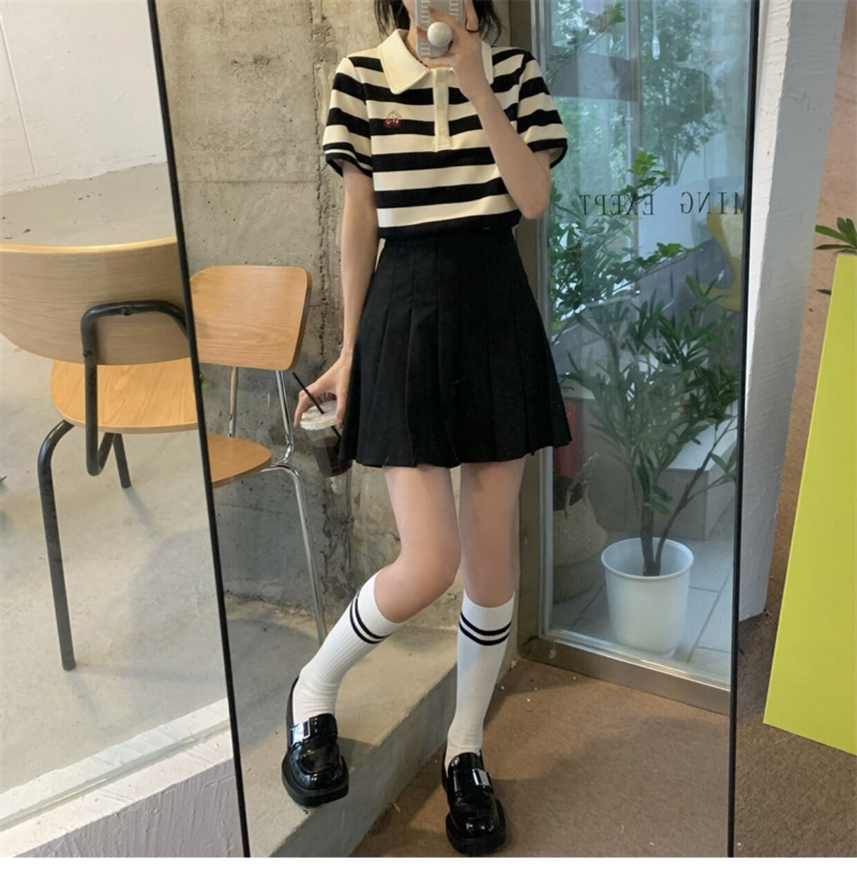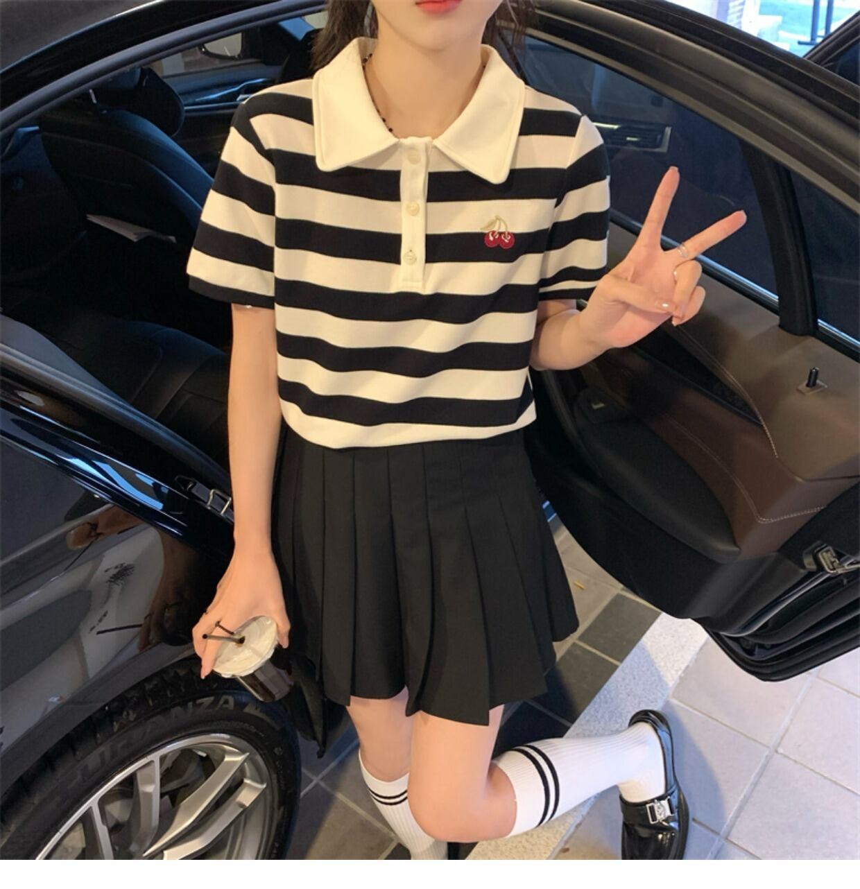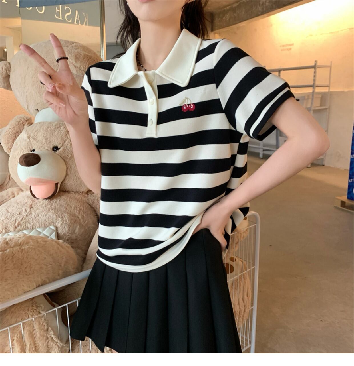 黒と白のストライプのポロカラー半袖Tシャツ女性の夏の薄いセクション2022新しいデザインセンスフロントショルダーラペルトップインタイド ホワイト ブラック サマー 夏物 7460011041161749 | framboise21
