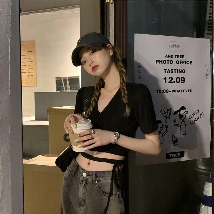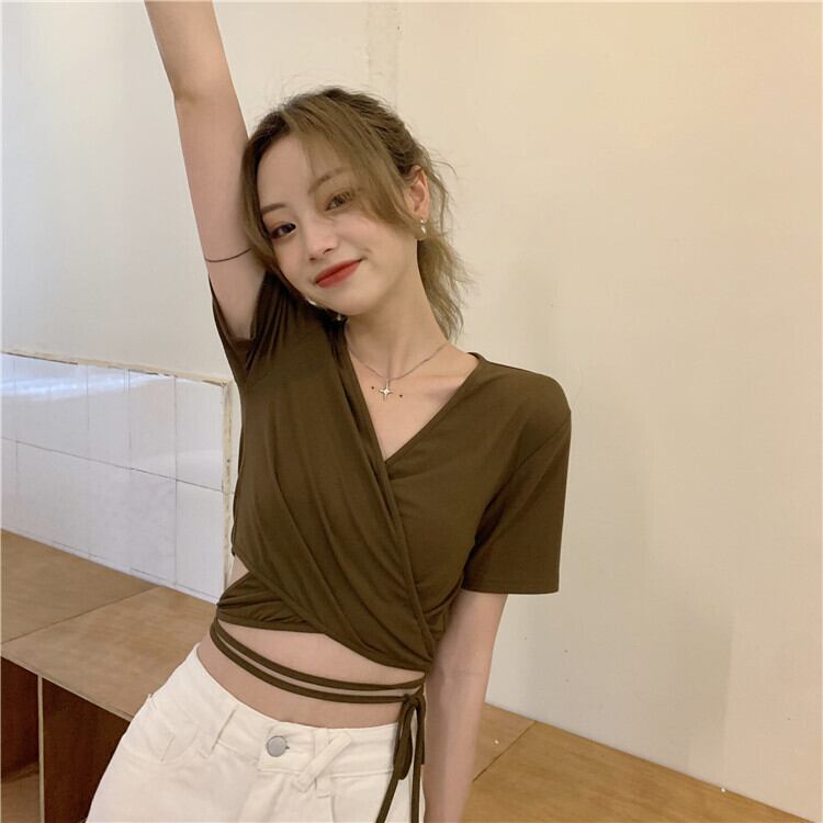 ショート半袖Tシャツレディース2022年夏新作スウィートデザインセンスネクタイハイウエストクロップドネーブルクロスVネックトップ ハイウェスト 大人ガーリー キュート カジュアル サマー 夏物 7460018893748420 | framboise21