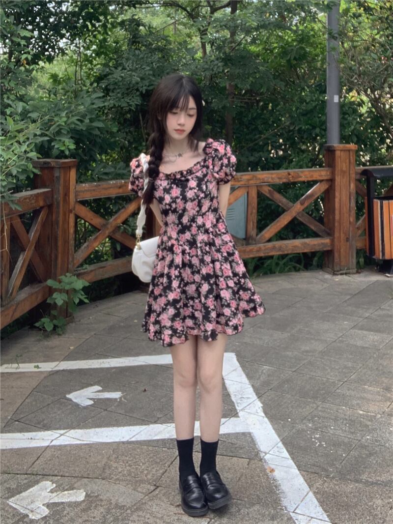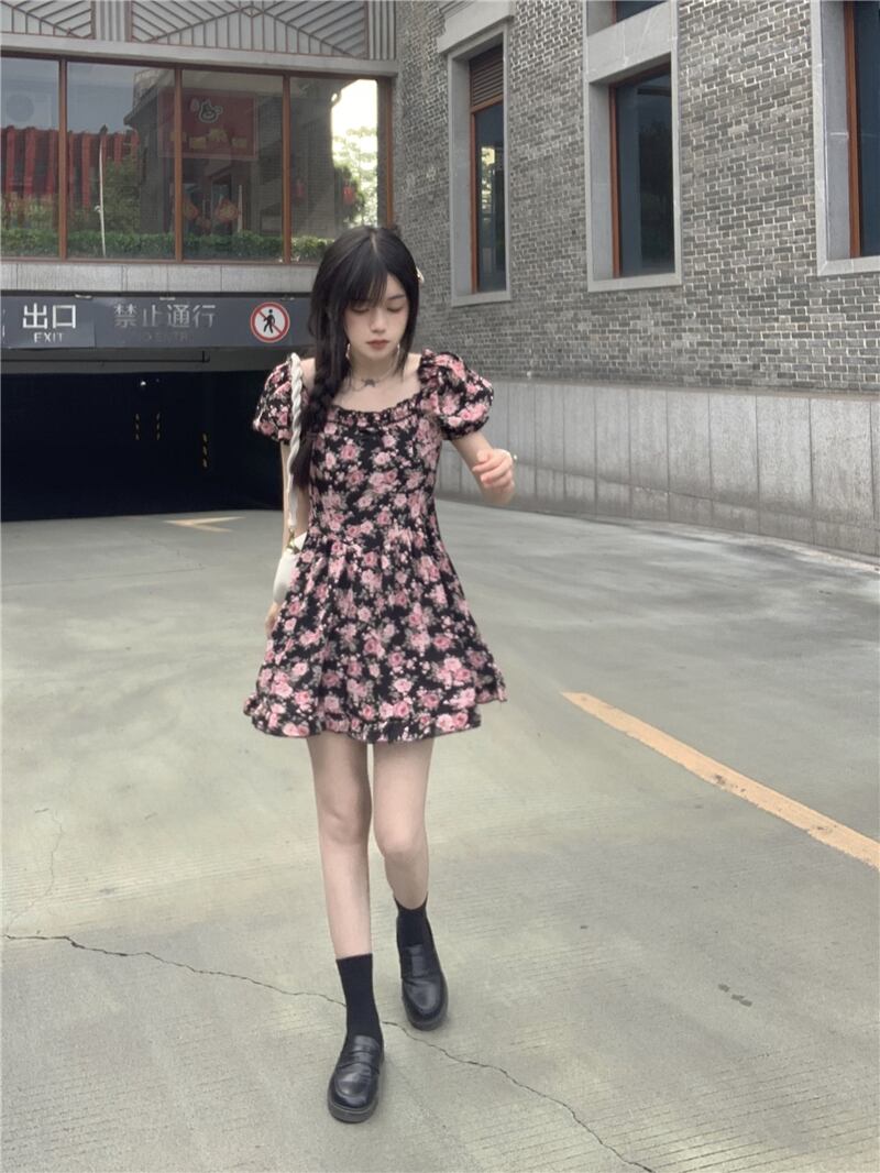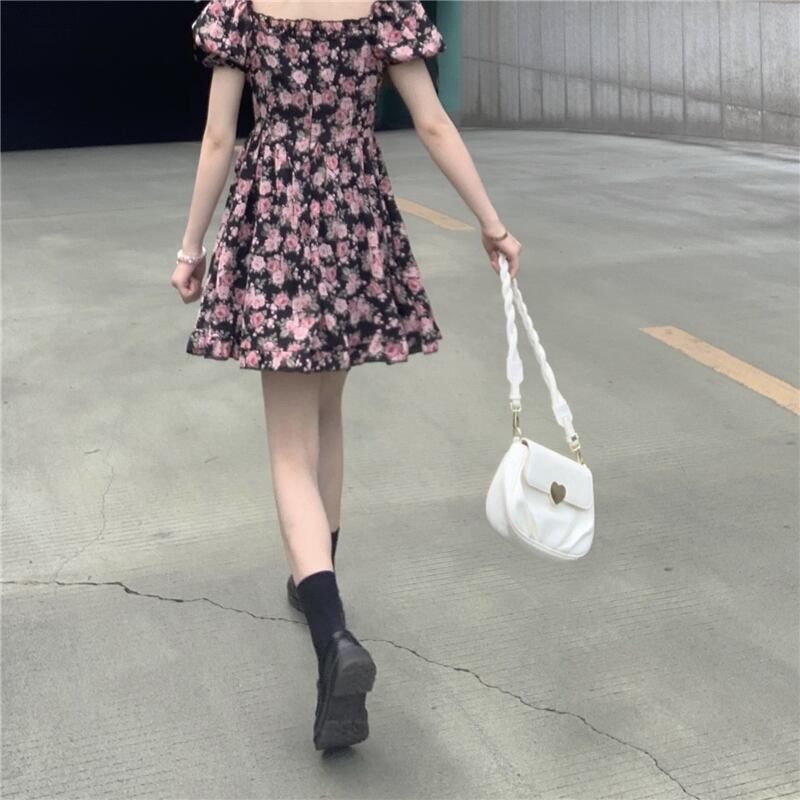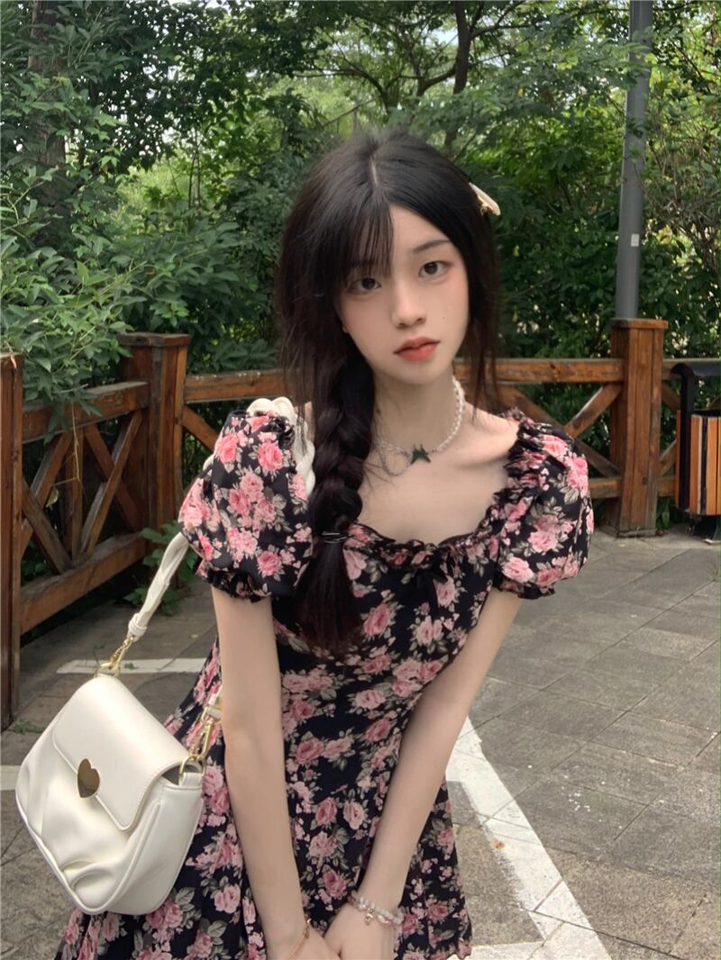 2022年の新しい夏のティーブレイクフレンチスクエアネックハイエンドシフォンフローラルドレスレディースデザインは小さくて優しい サマー 夏物 花柄 スクウェア 7460014325760446 | framboise21