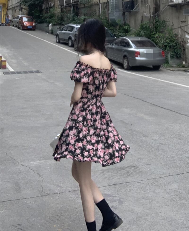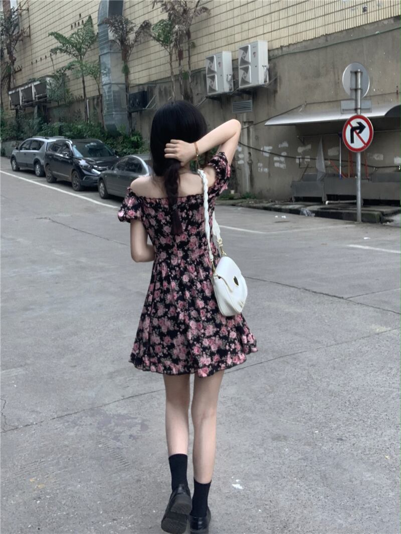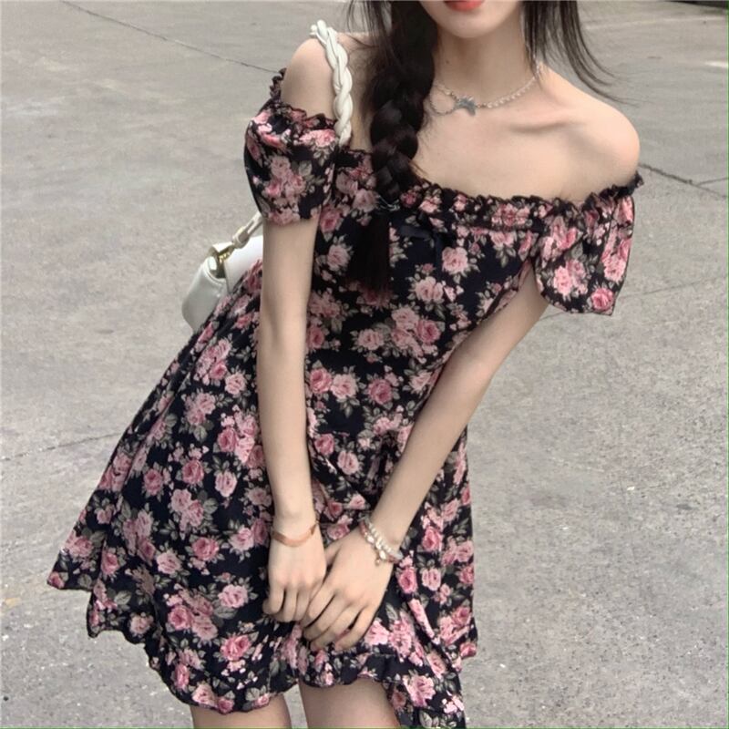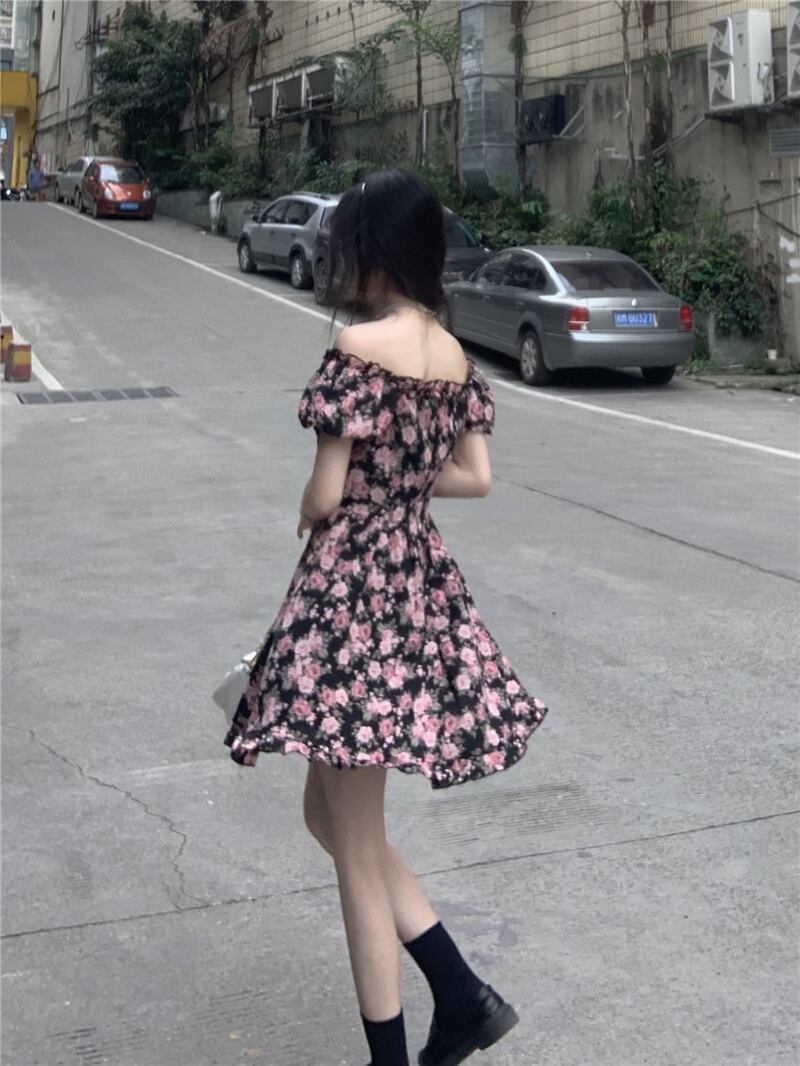 2022年の新しい夏のティーブレイクフレンチスクエアネックハイエンドシフォンフローラルドレスレディースデザインは小さくて優しい サマー 夏物 花柄 スクウェア 7460014325760446 | framboise21