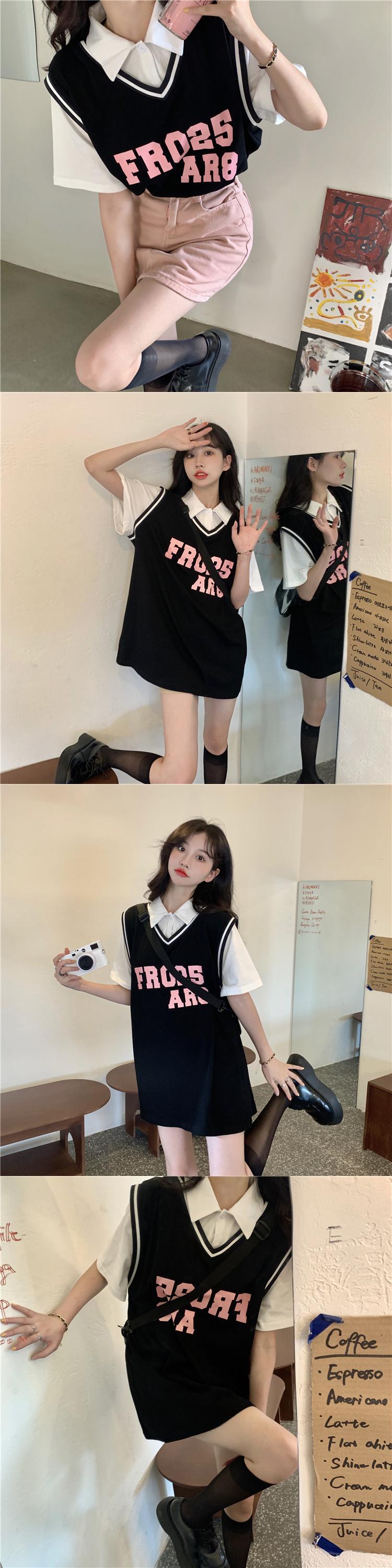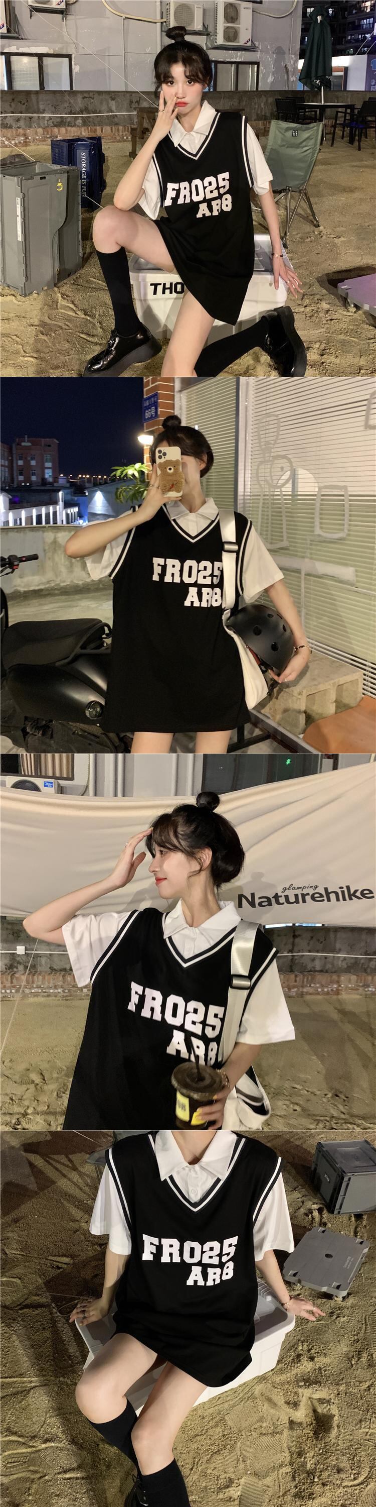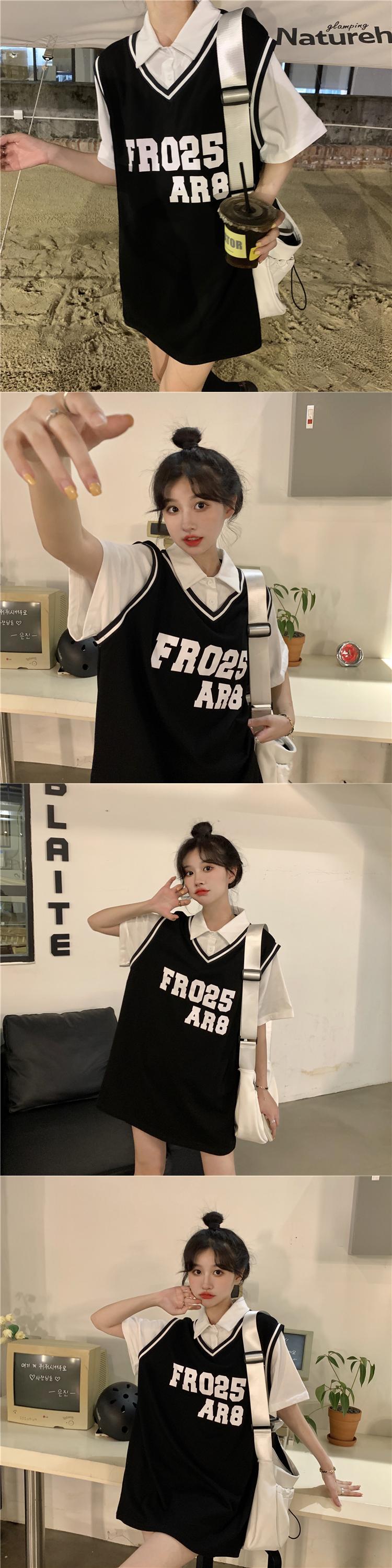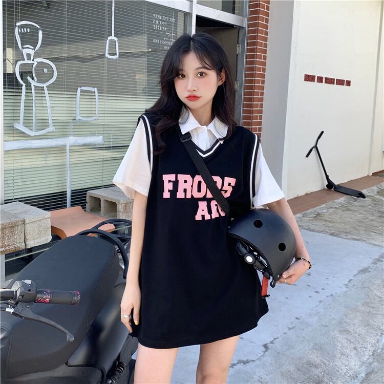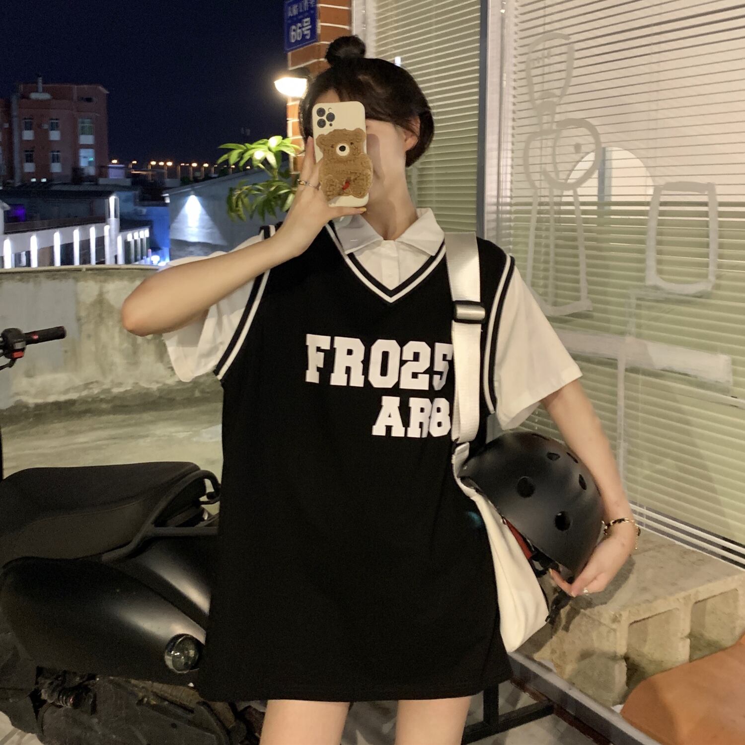 フェイクツーピース半袖Tシャツレディースサマーフロントショルダーポロカラーバスケットボールユニムルーズデザインスモールミディアムロングトップ 夏物 746003729536784 | framboise21