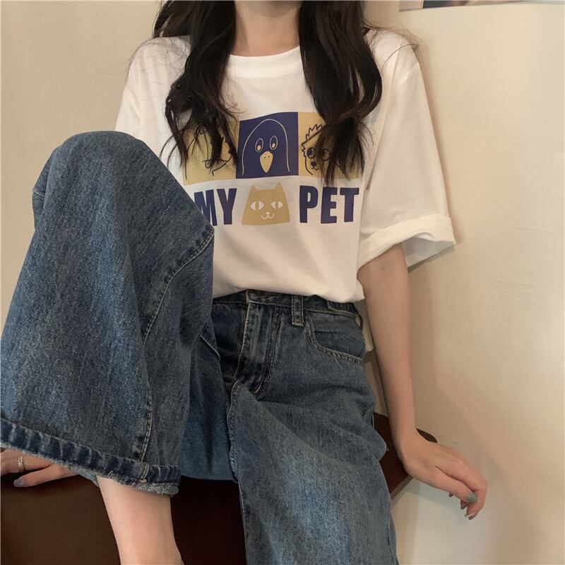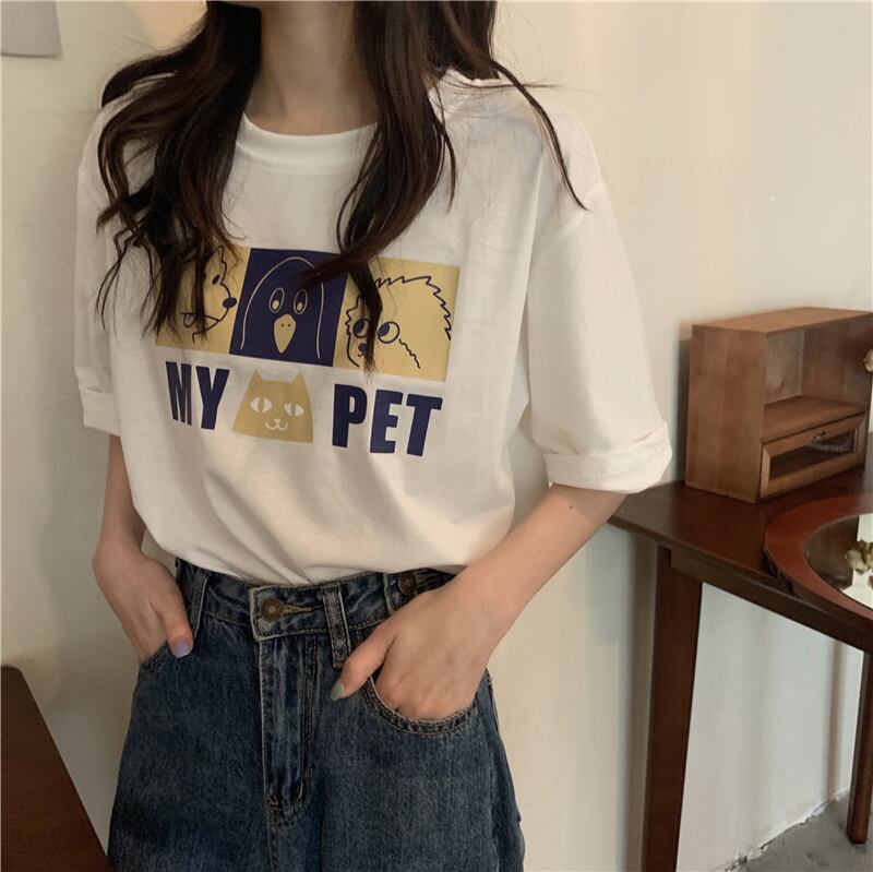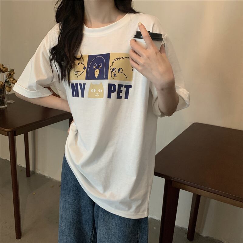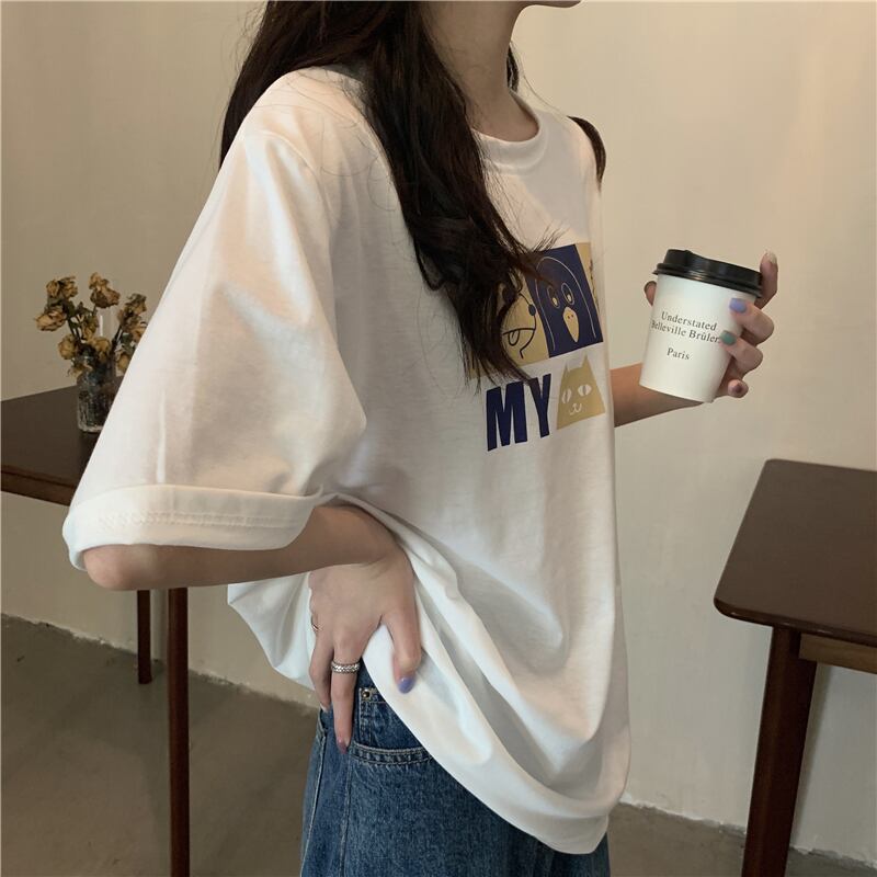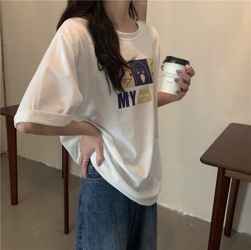 ホワイト半袖Tシャツ女子2022年夏新作ルーズデザインセンスニッチスチューデントプリントフロントショルダーハーフスリーブトップ サマー 夏物 746004952341001 | framboise21