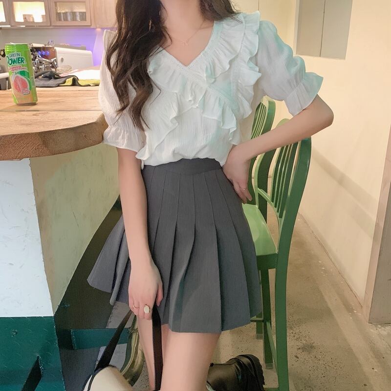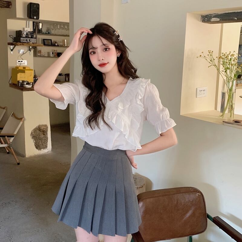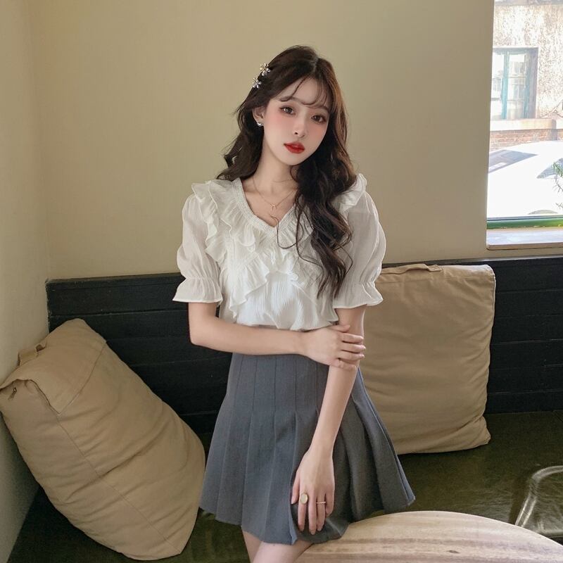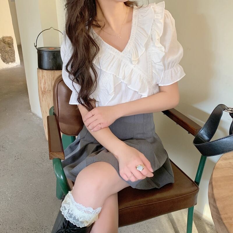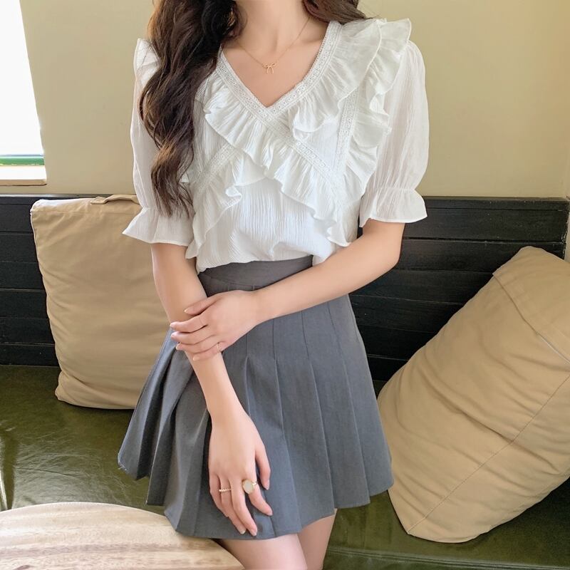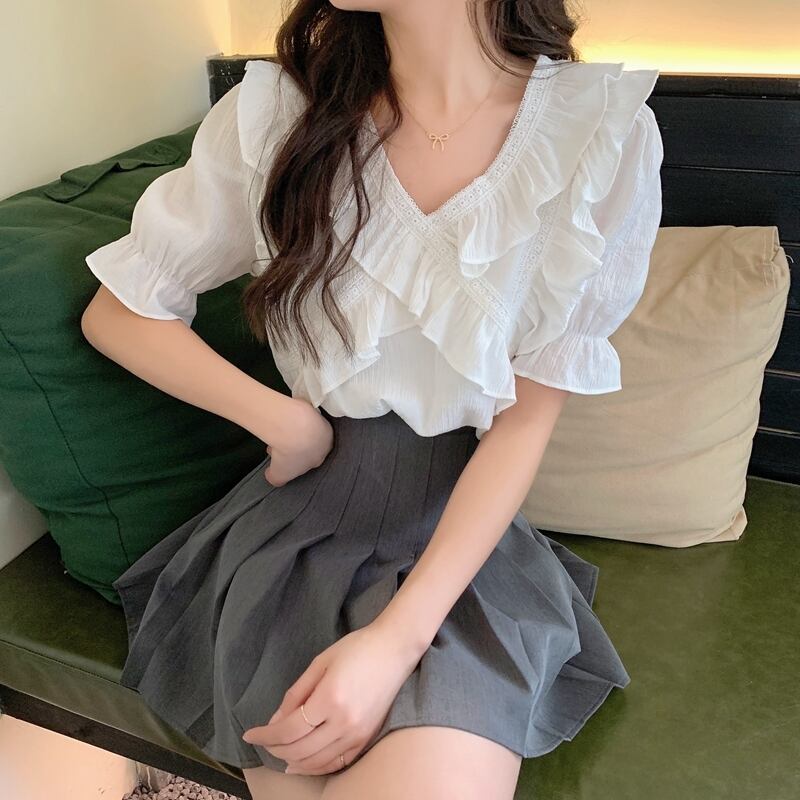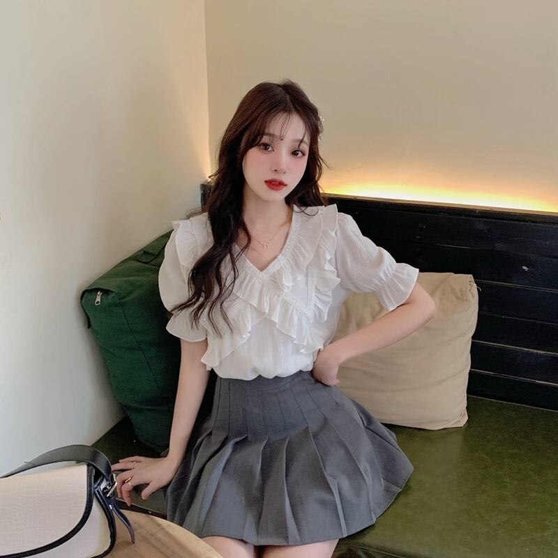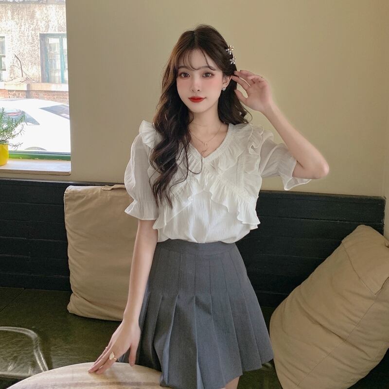 Vネックシフォンシャツレディースデザインセンスニッチサマースウィートでシックなカビエッジ半袖トップススカート付き 大人ガーリー キュート カジュアル 夏物 7460017233753613 | framboise21