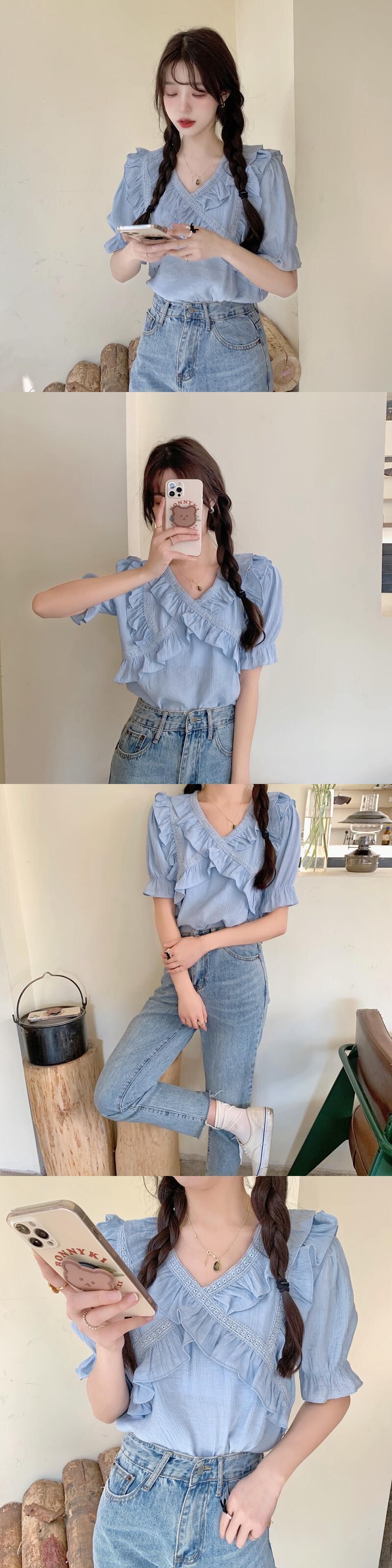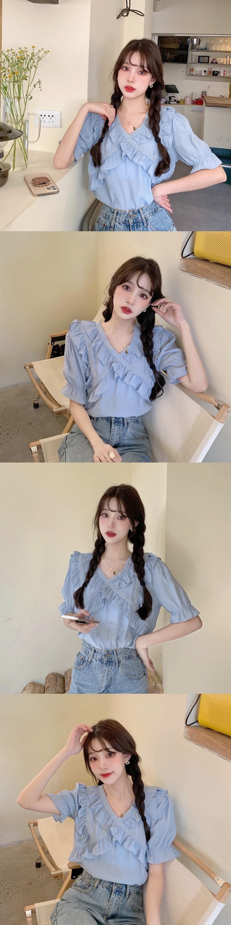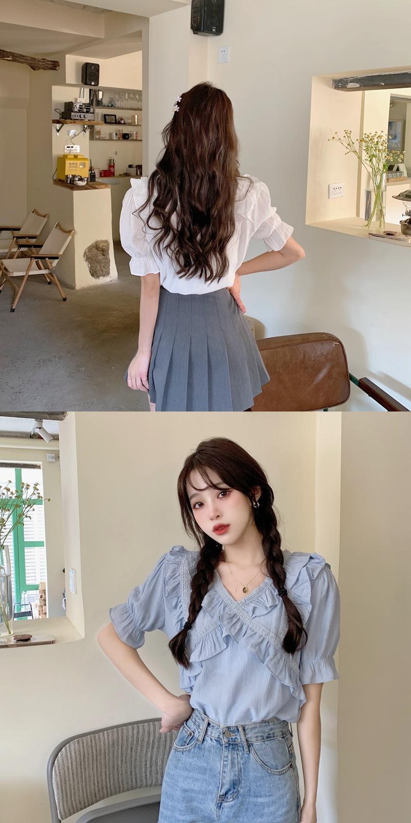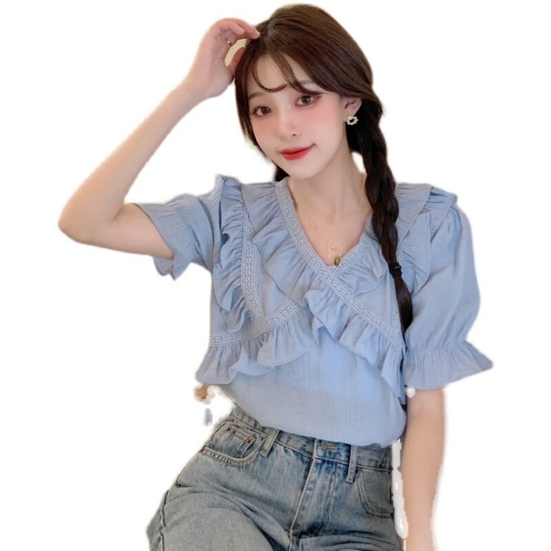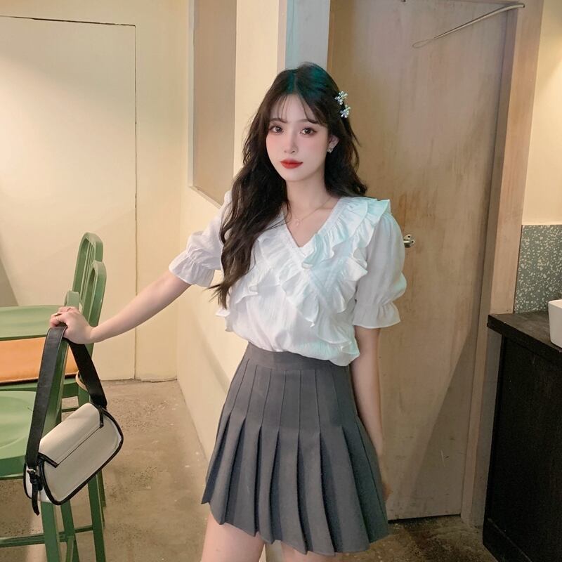 Vネックシフォンシャツレディースデザインセンスニッチサマースウィートでシックなカビエッジ半袖トップススカート付き 大人ガーリー キュート カジュアル 夏物 7460017233753613 | framboise21