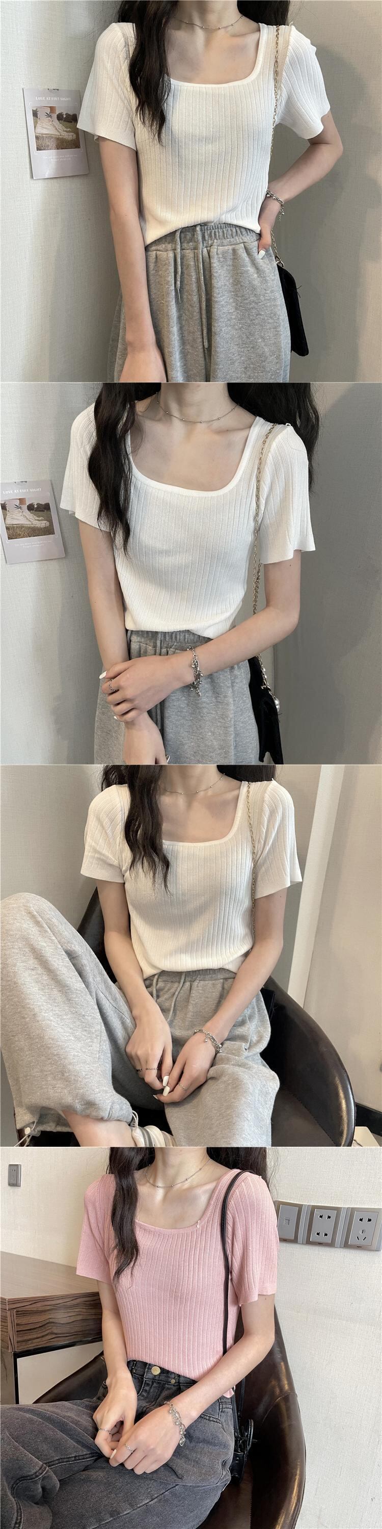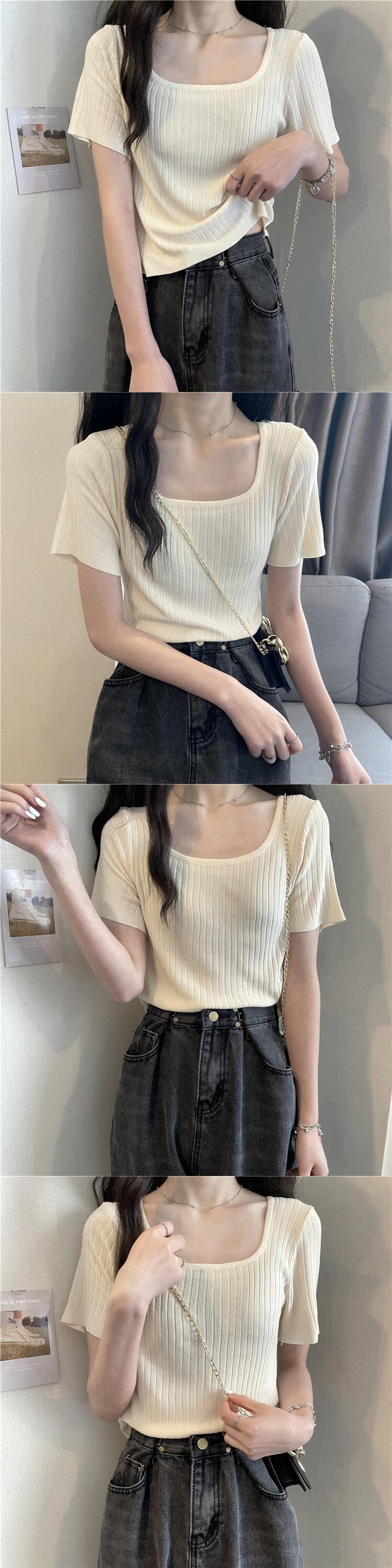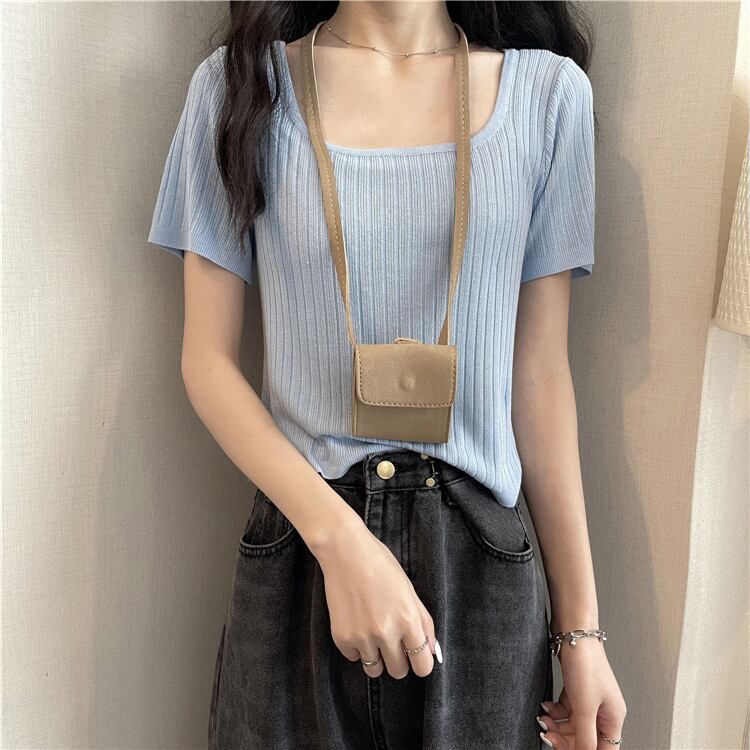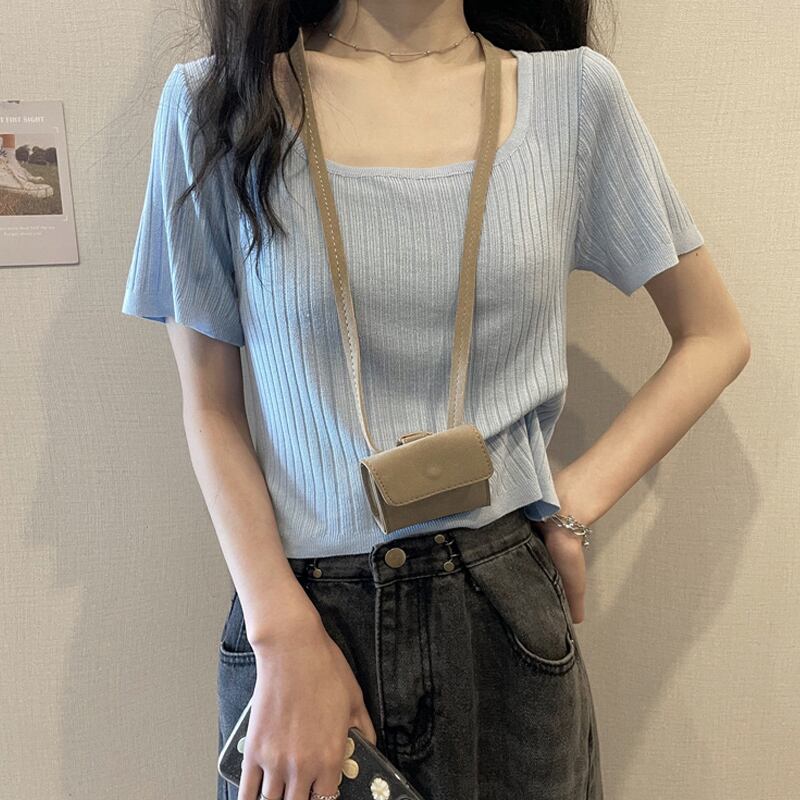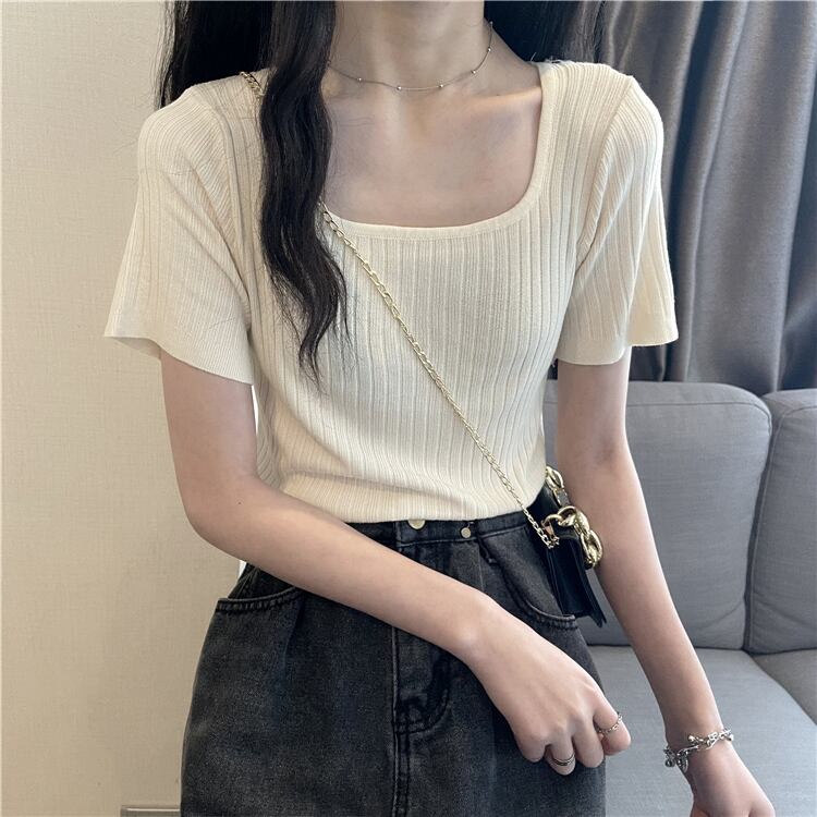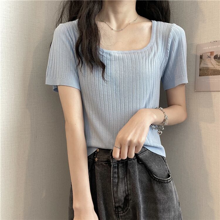 スクエアネックアイスシルクニットショートTシャツレディースイントレンディなデザインセンスニッチハイウエスト半袖トップ2022年夏新作 ハイウェスト サマー 夏物 スクウェア 7460076084446792 | framboise21