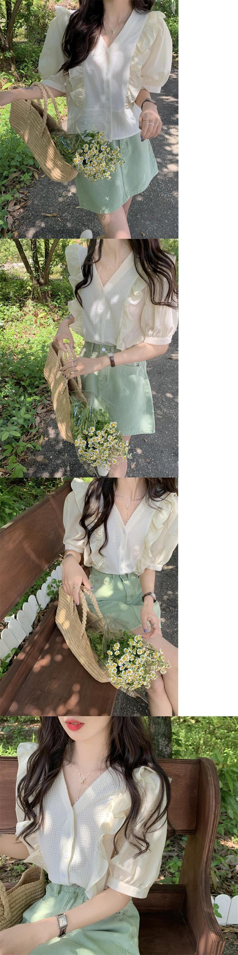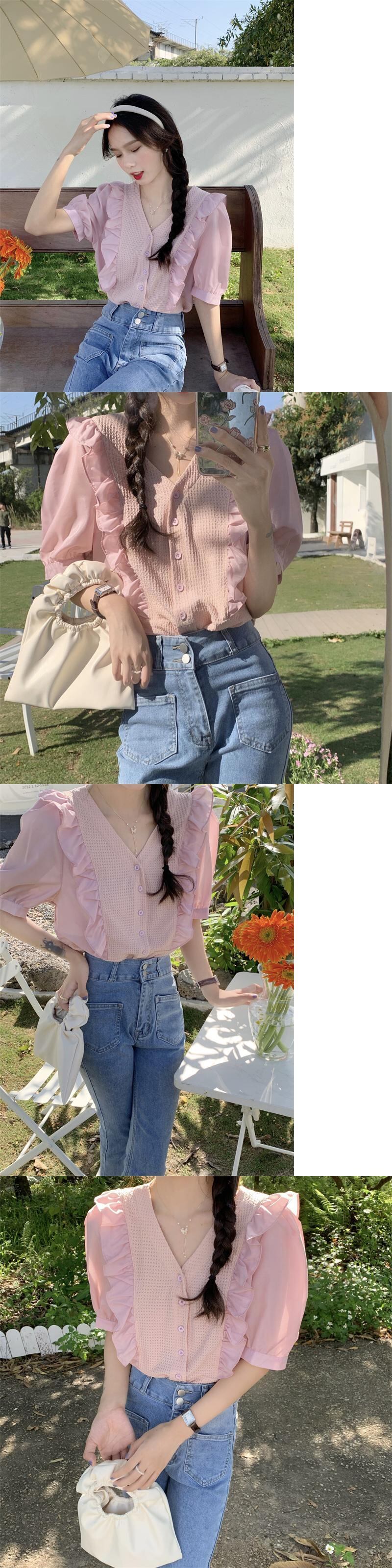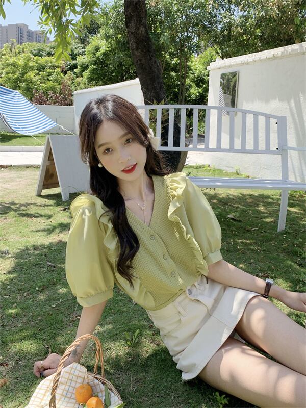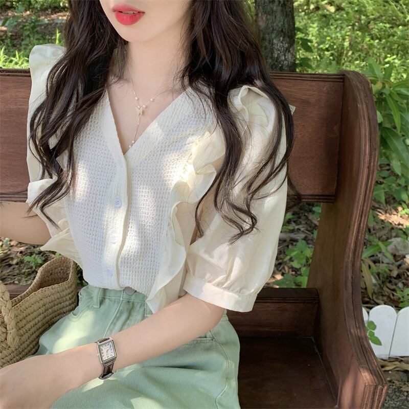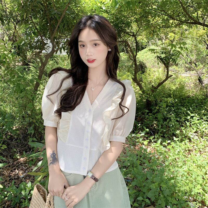 2022年夏の新しいスリムなVネックシャツ気質デザインセンスニッチシンプルインスイートパフスリーブトップ女性 大人ガーリー スウィート キュート カジュアル サマー 夏物 7460072775539041 | framboise21