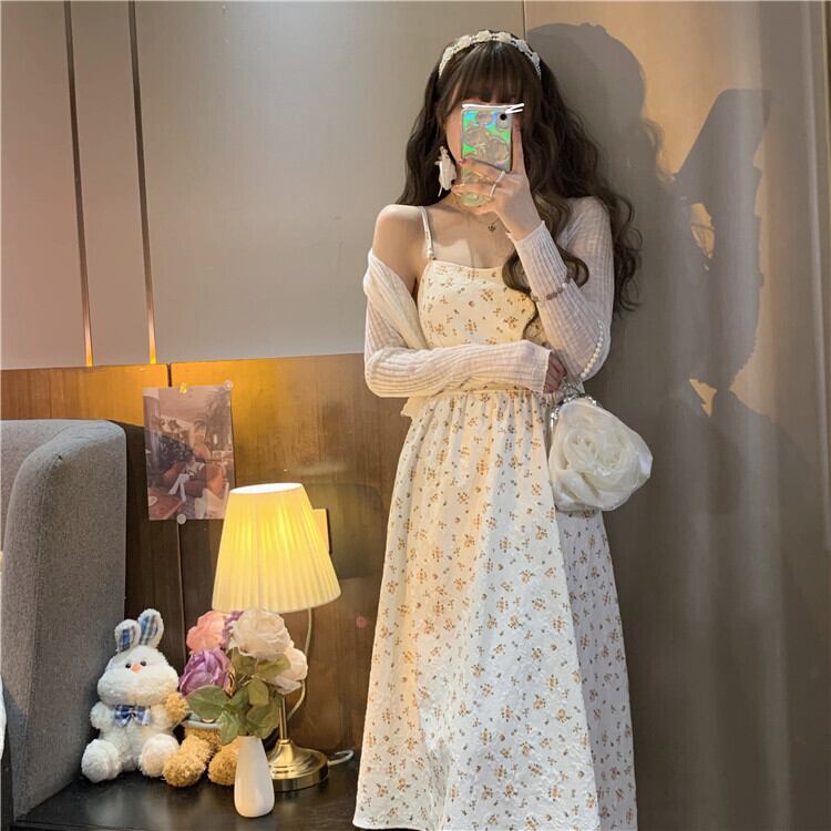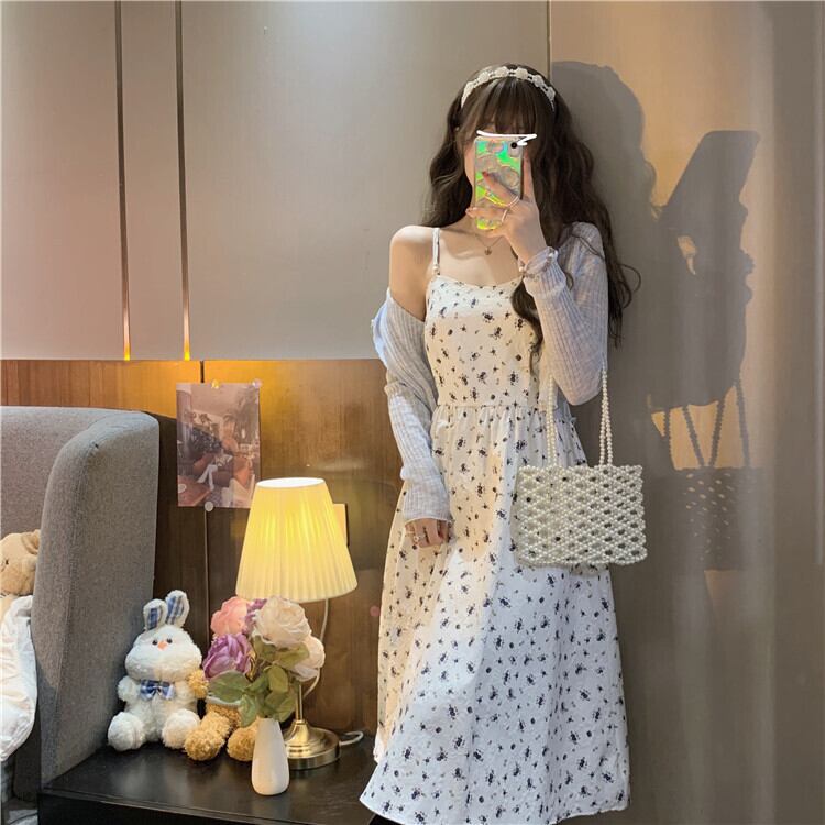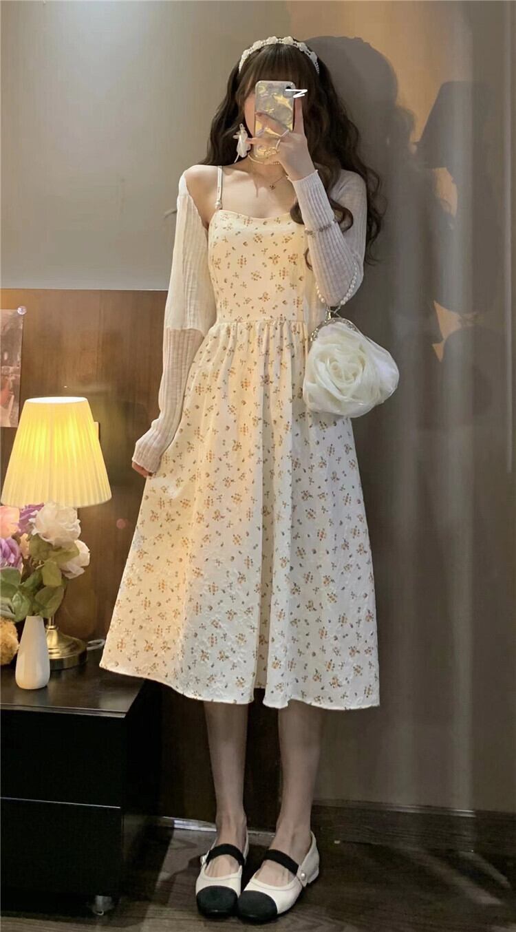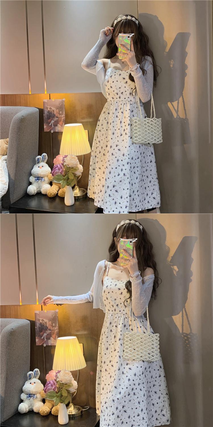 色:白いカーディガン,ブルーカーディガン,ブルーフラワードレス,オレンジ色の花のドレス