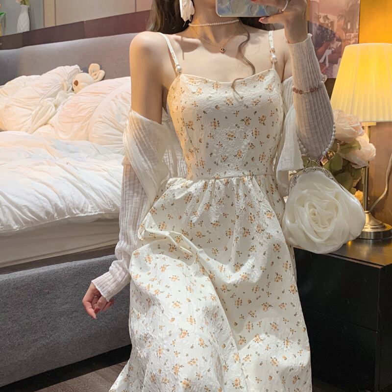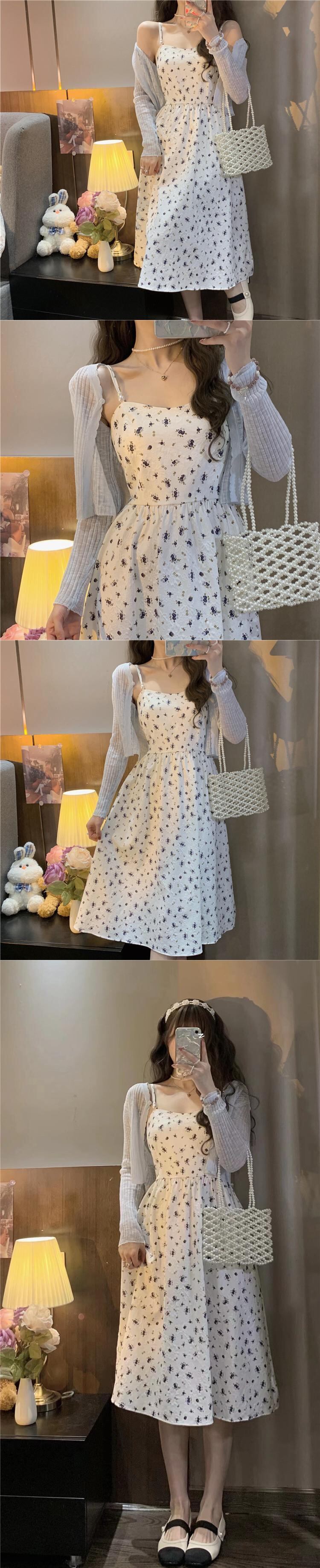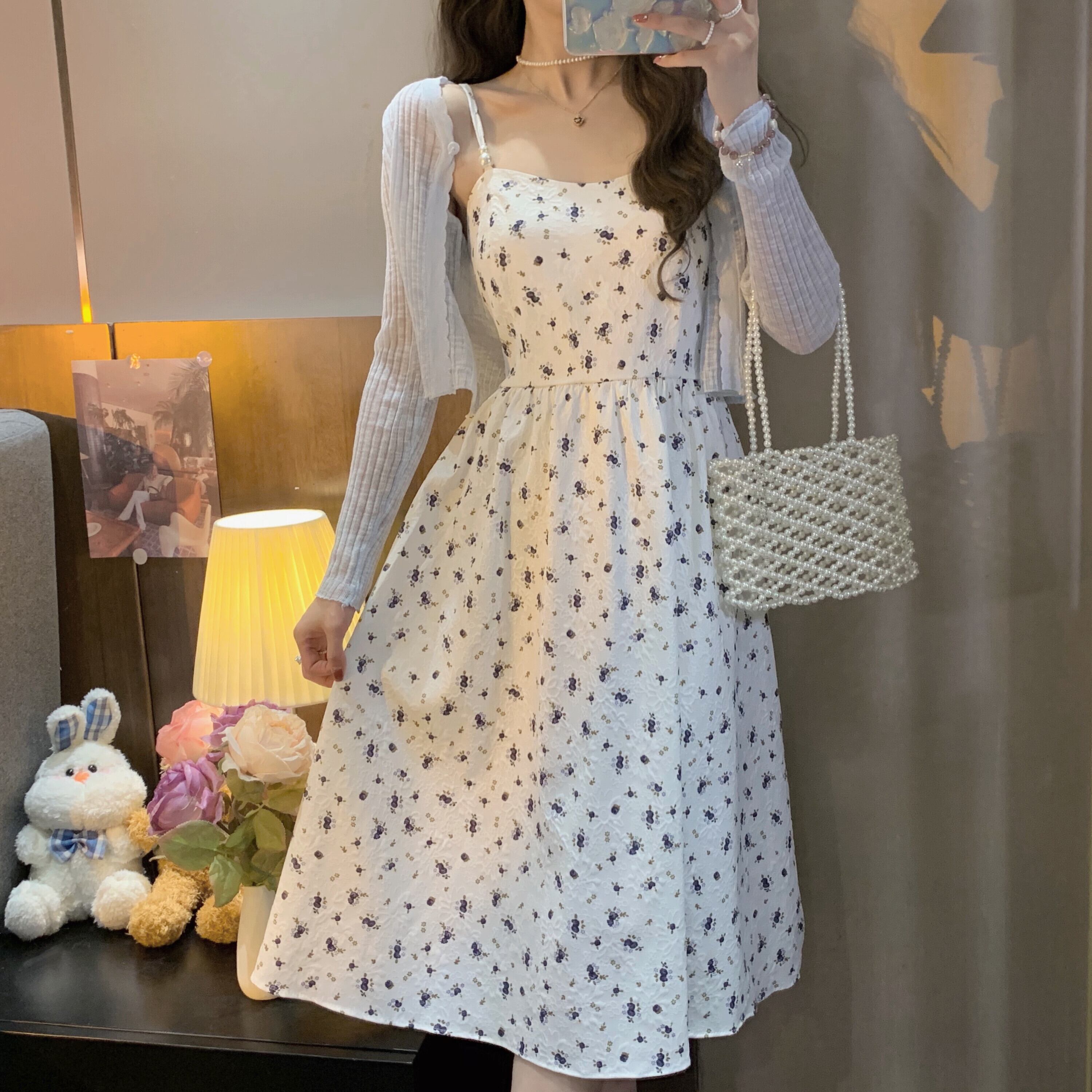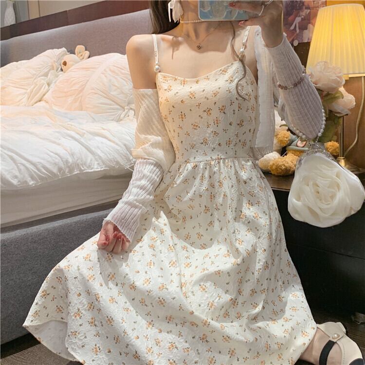 色:白いカーディガン,ブルーカーディガン,ブルーフラワードレス,オレンジ色の花のドレス