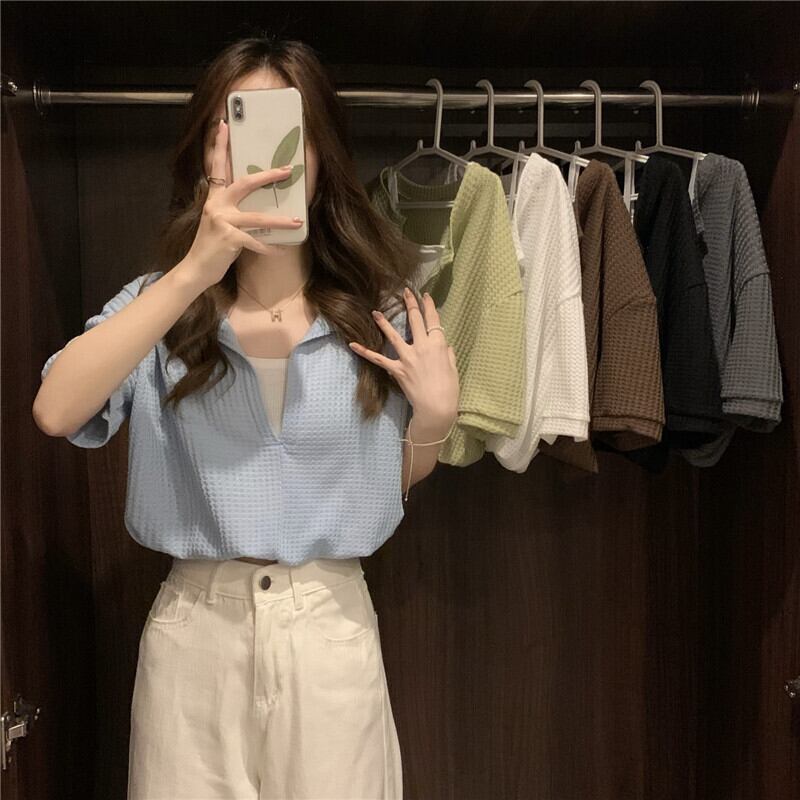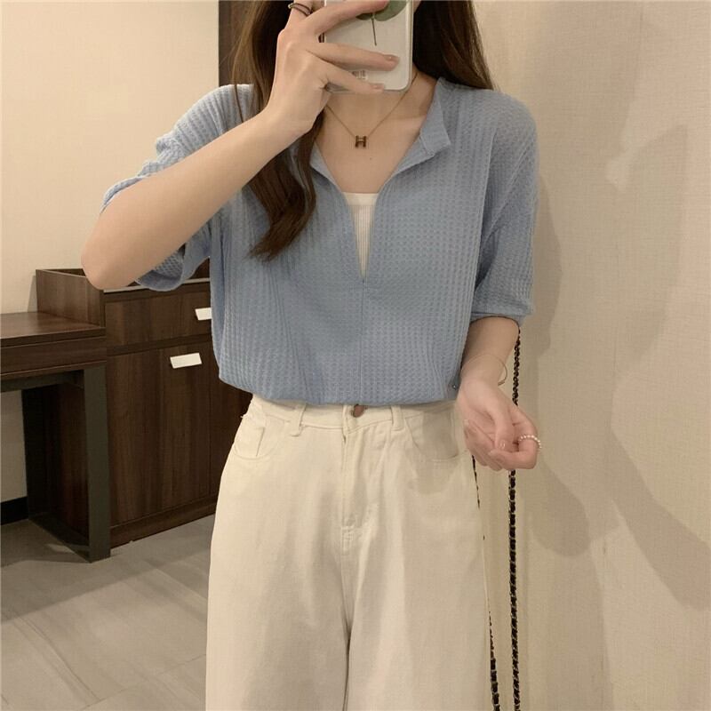 Vネックフェイクツーピースワッフル半袖Tシャツレディースイントレンドデザインセンスニッチサマーショートトップハイウエストパンツ ハイウェスト 夏物 7460023136738174 | framboise21