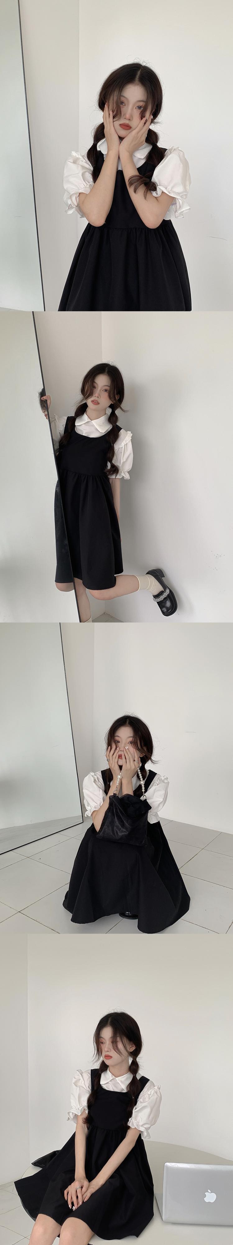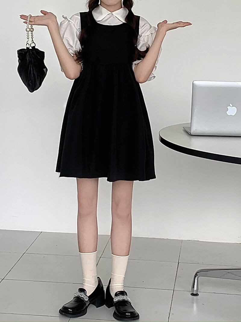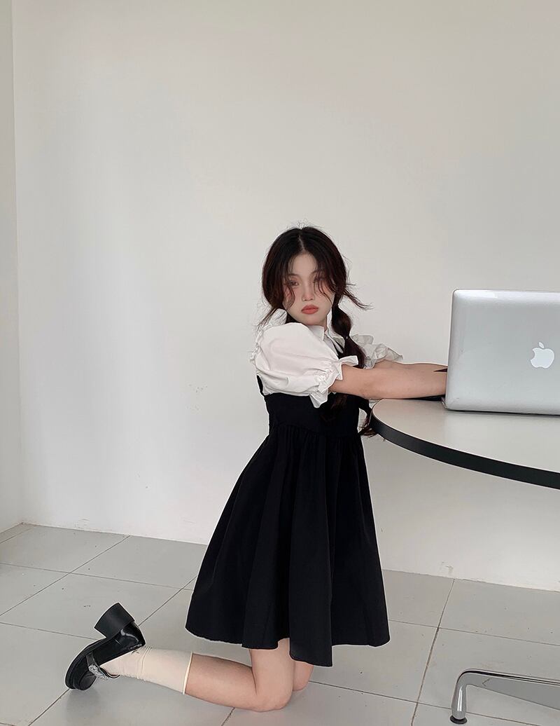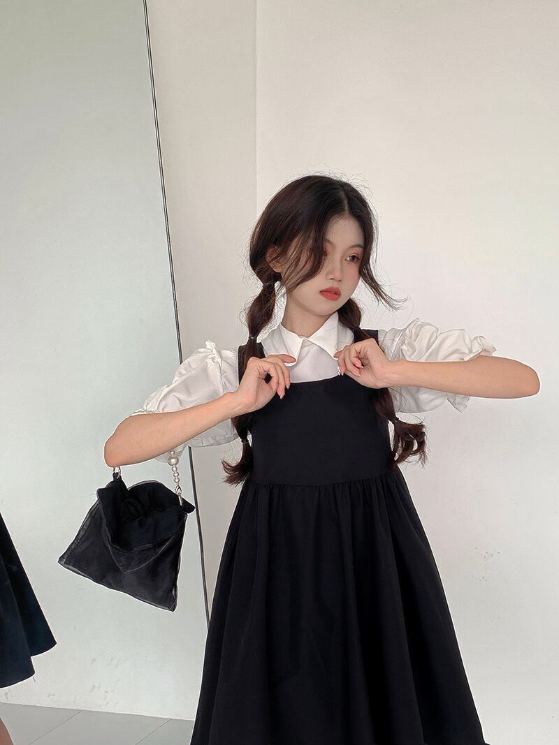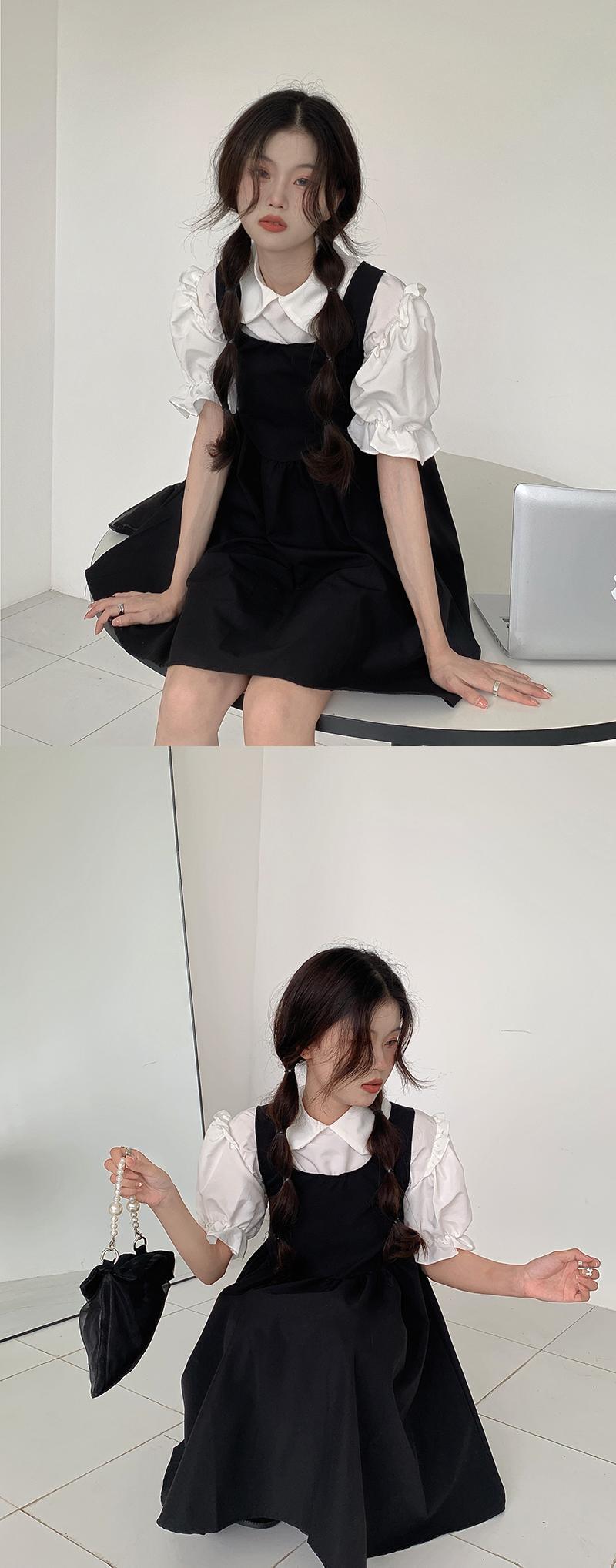 色:ブラックストラップドレス,ホワイトパフ半袖