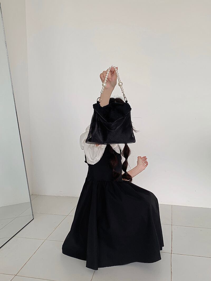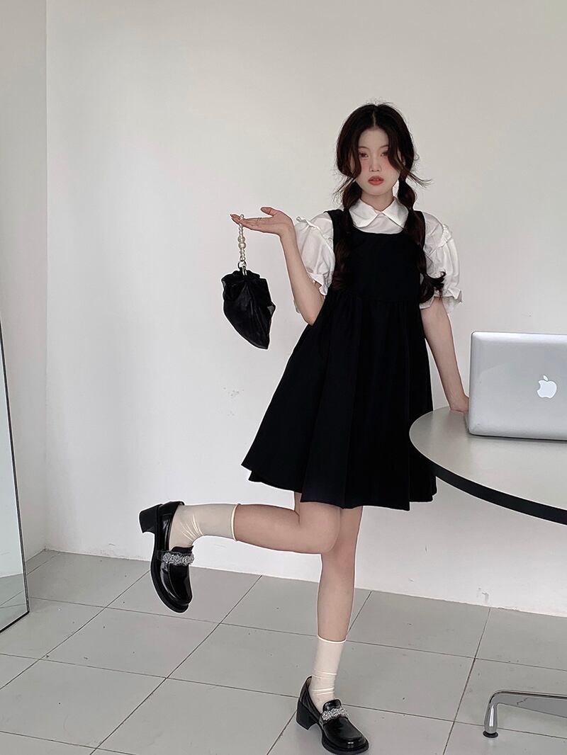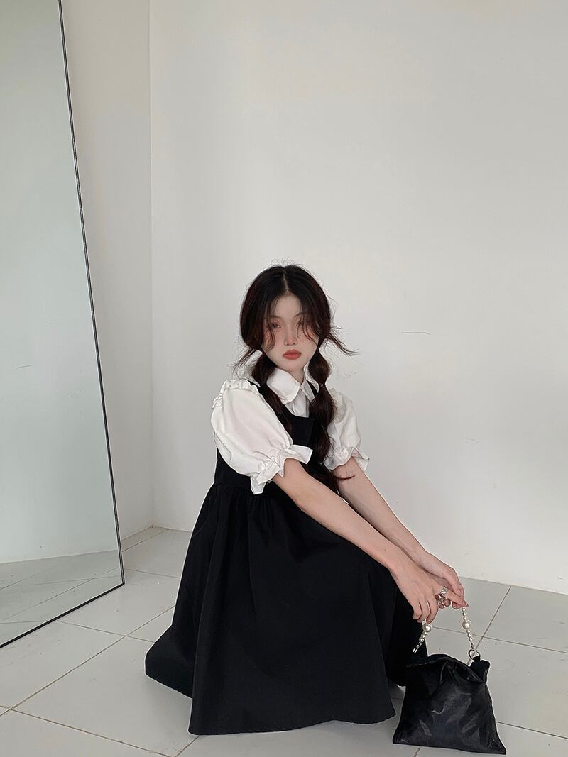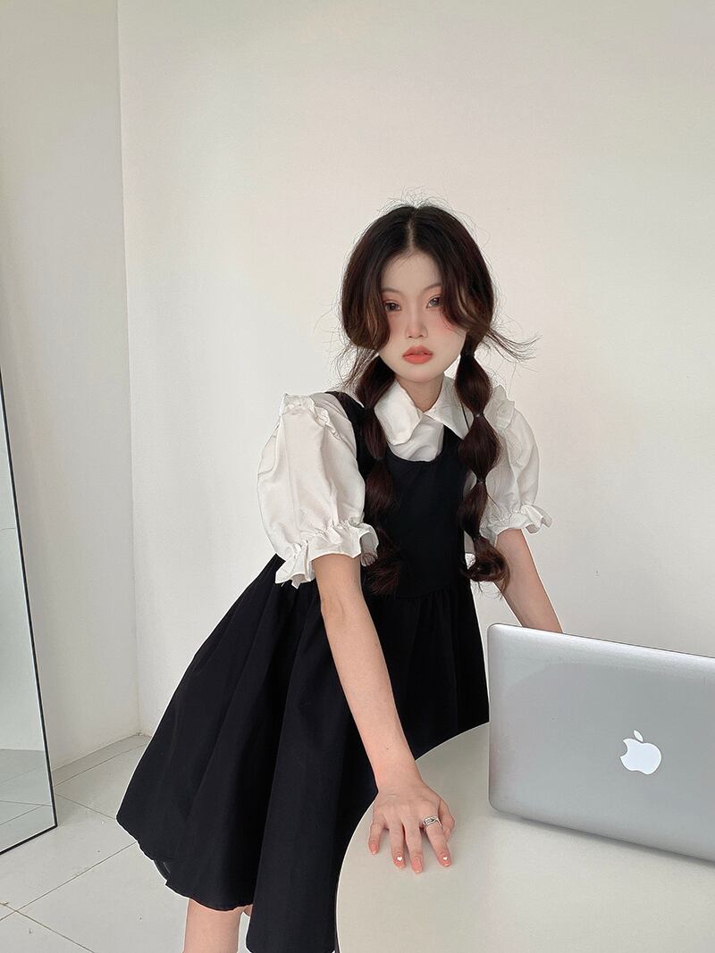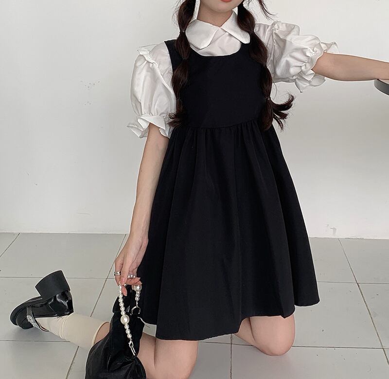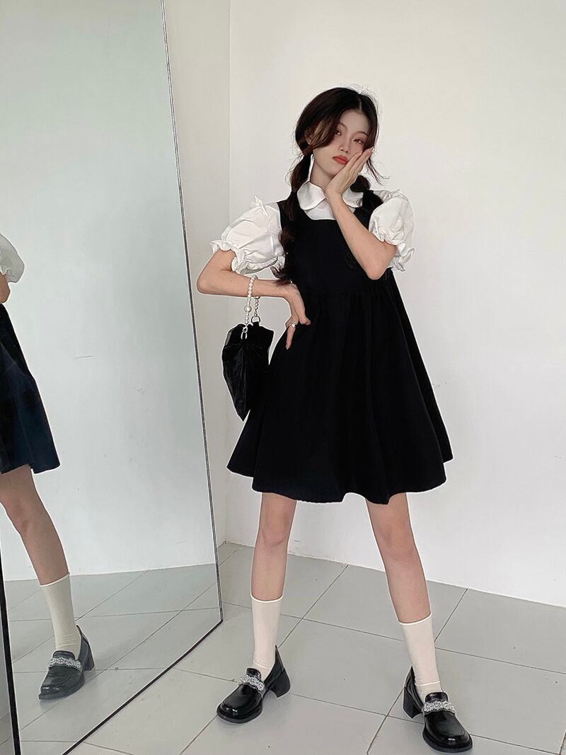 色:ブラックストラップドレス,ホワイトパフ半袖