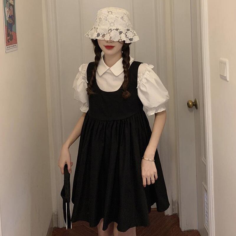 2022年の新しい女性の夏の甘いパフスリーブデザインニッチブラックサスペンダースカートドレススーツ 大人ガーリー スウィート キュート カジュアル サマー 夏物 746004689754531 | framboise21