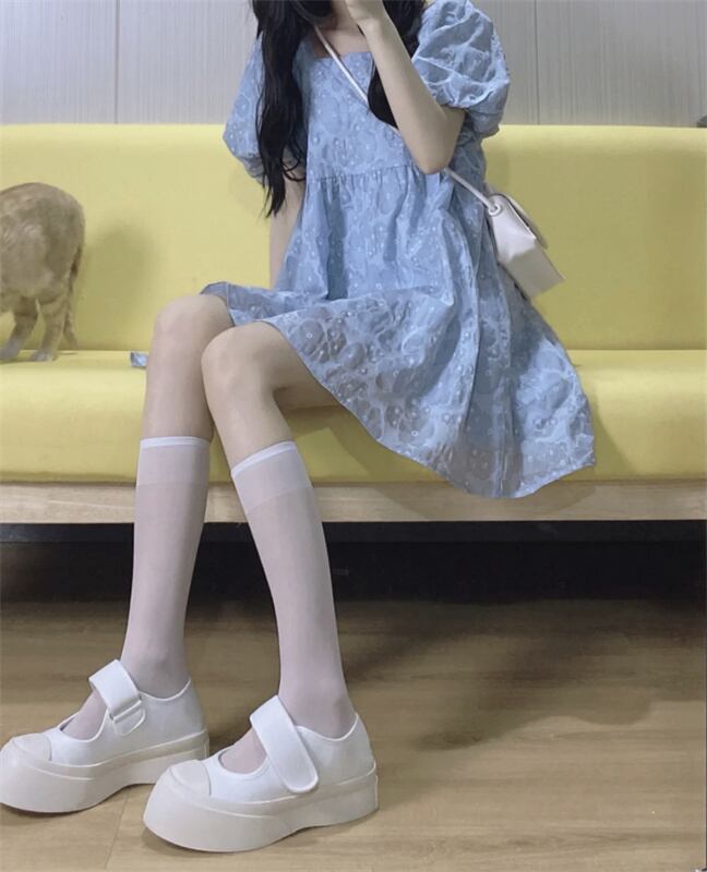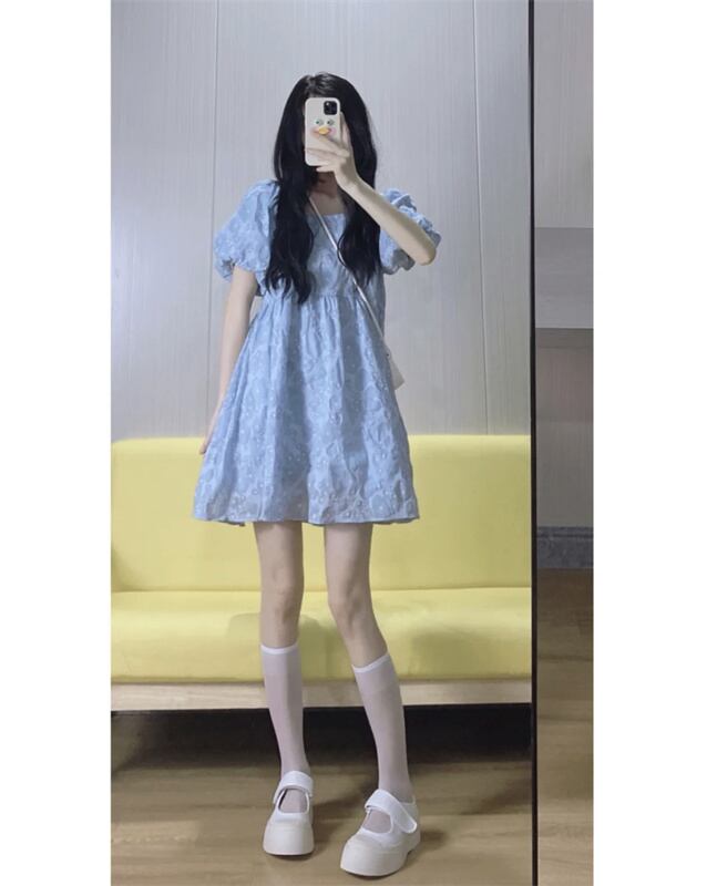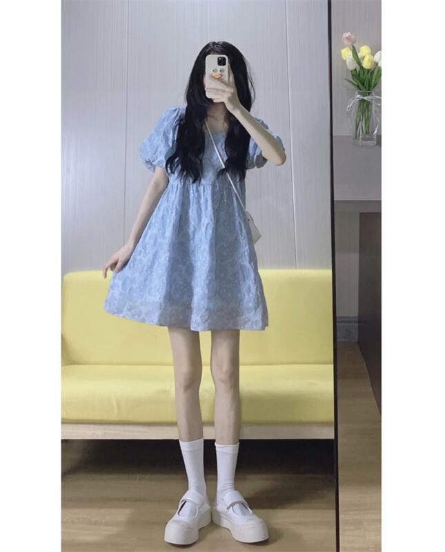 ブルーフローラルドレス女性夏フレンチスウィートデザインセンススモールショートバブル半袖ドールスカート ハーフスリーブ 大人ガーリー キュート カジュアル サマー 夏物 花柄 7460075672126629 | framboise21