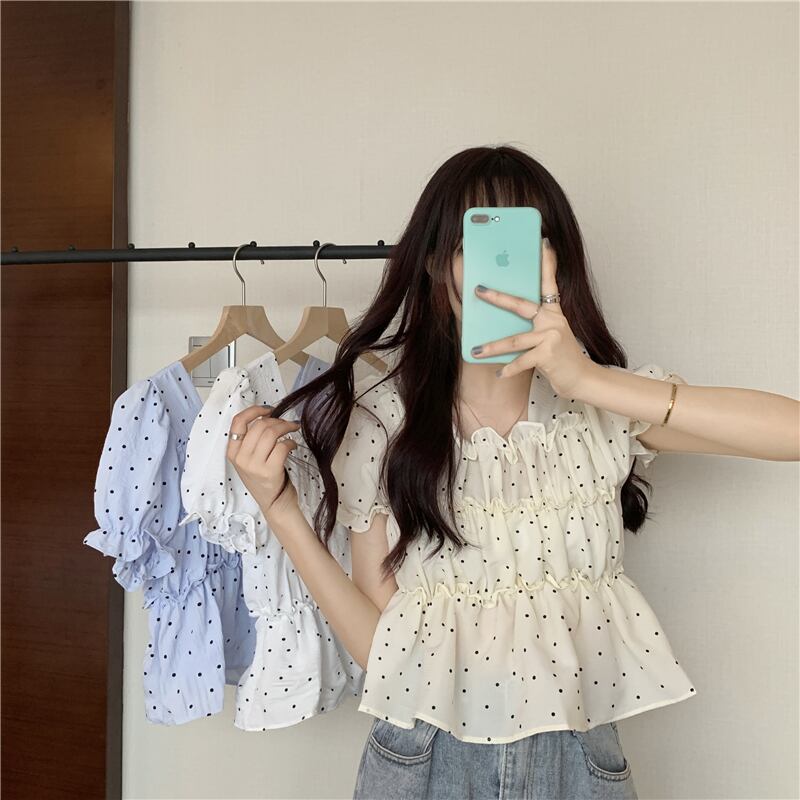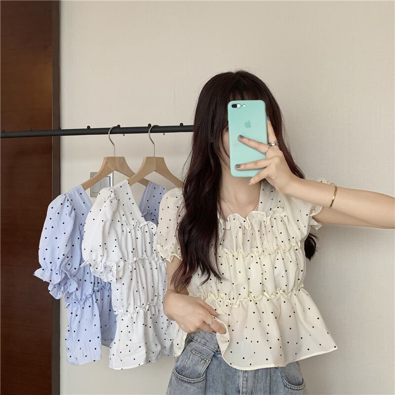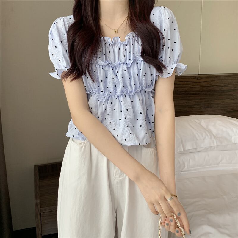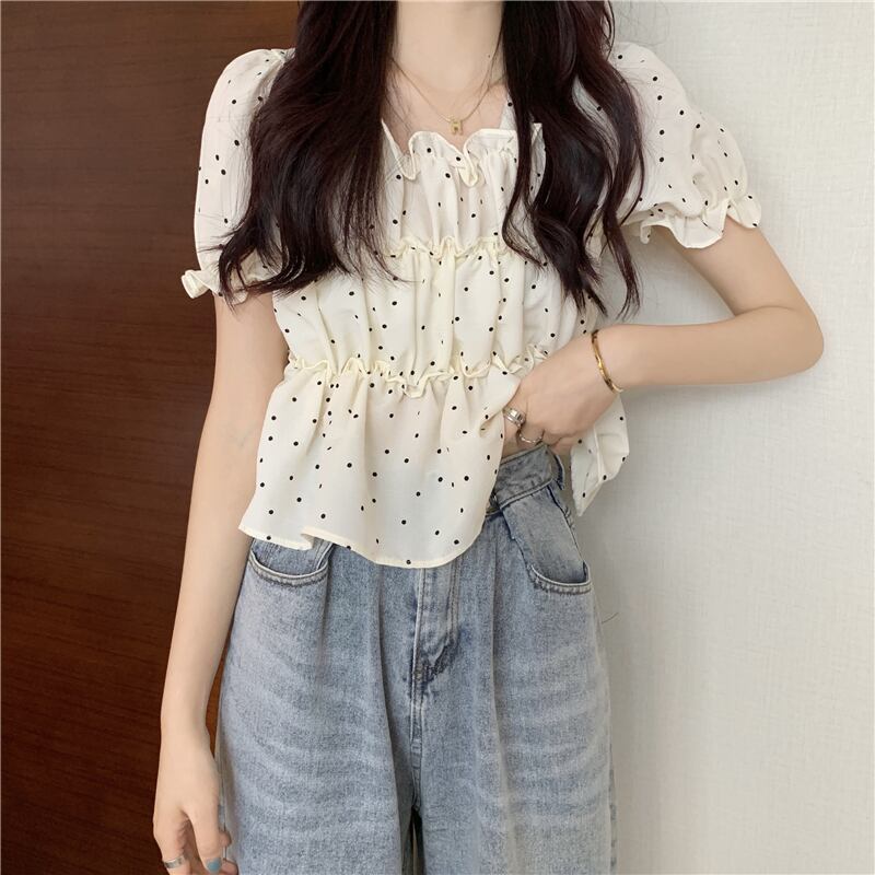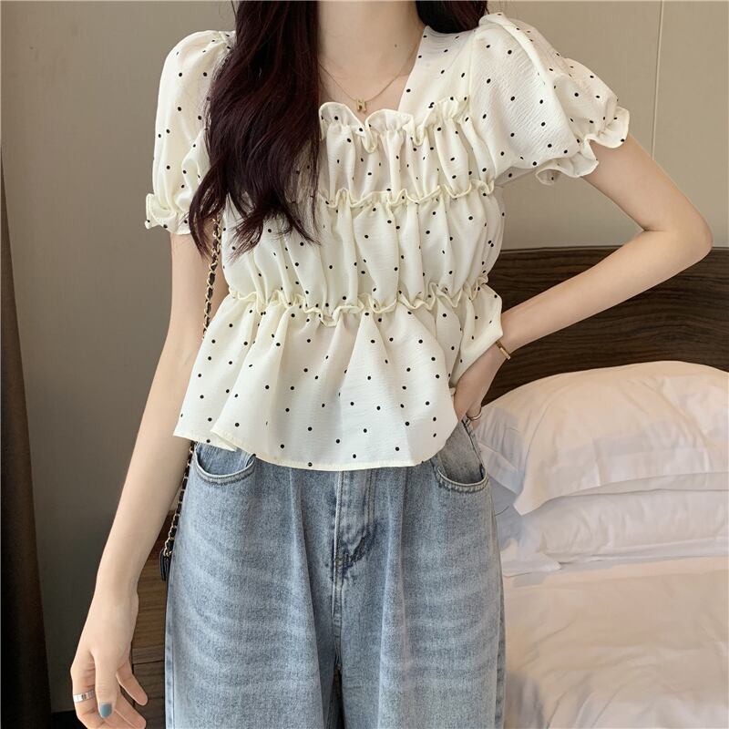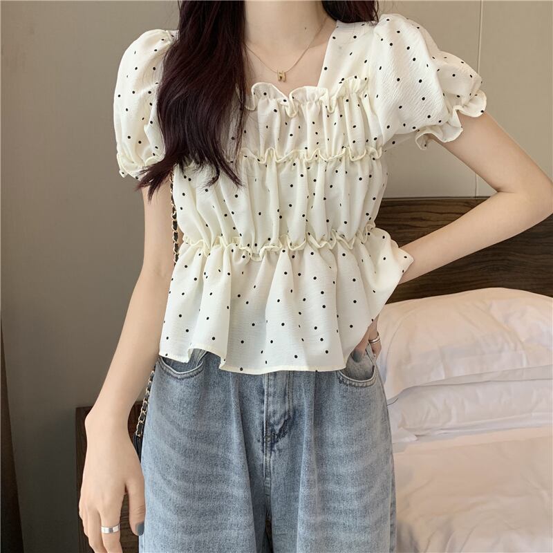 夏の薄い水玉バブル半袖シャツウエストデザインニッチフランスの甘くてシックなプリーツトップの女性 大人ガーリー スウィート キュート カジュアル サマー 夏物 7460053904540880 | framboise21