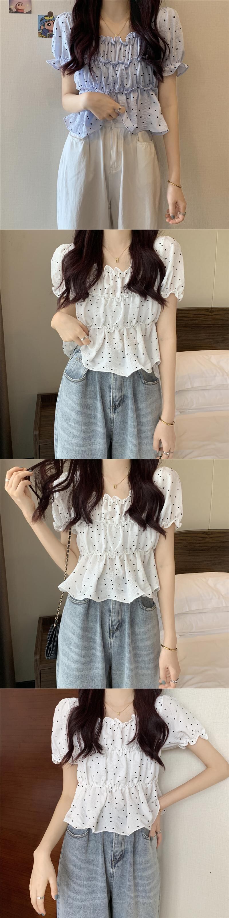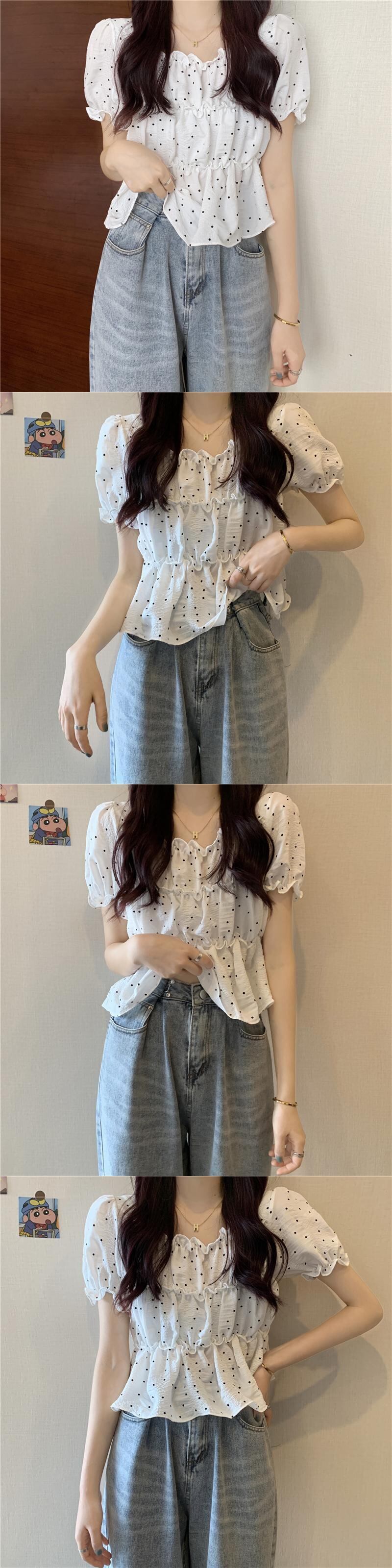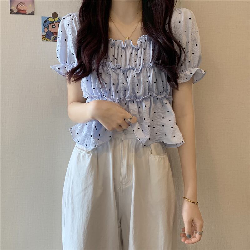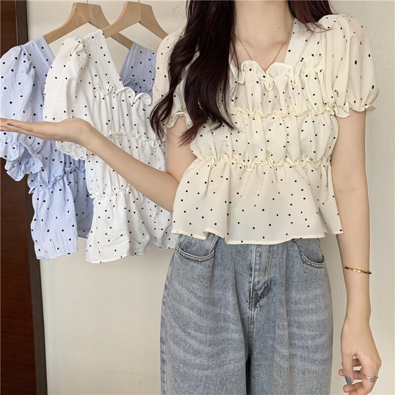 夏の薄い水玉バブル半袖シャツウエストデザインニッチフランスの甘くてシックなプリーツトップの女性 大人ガーリー スウィート キュート カジュアル サマー 夏物 7460053904540880 | framboise21