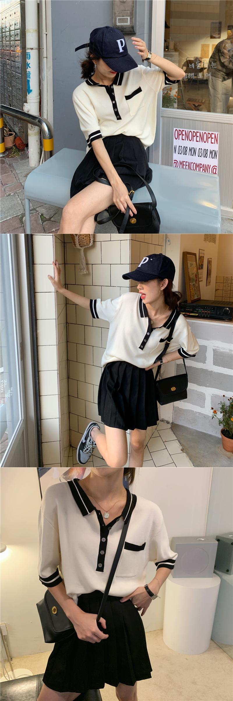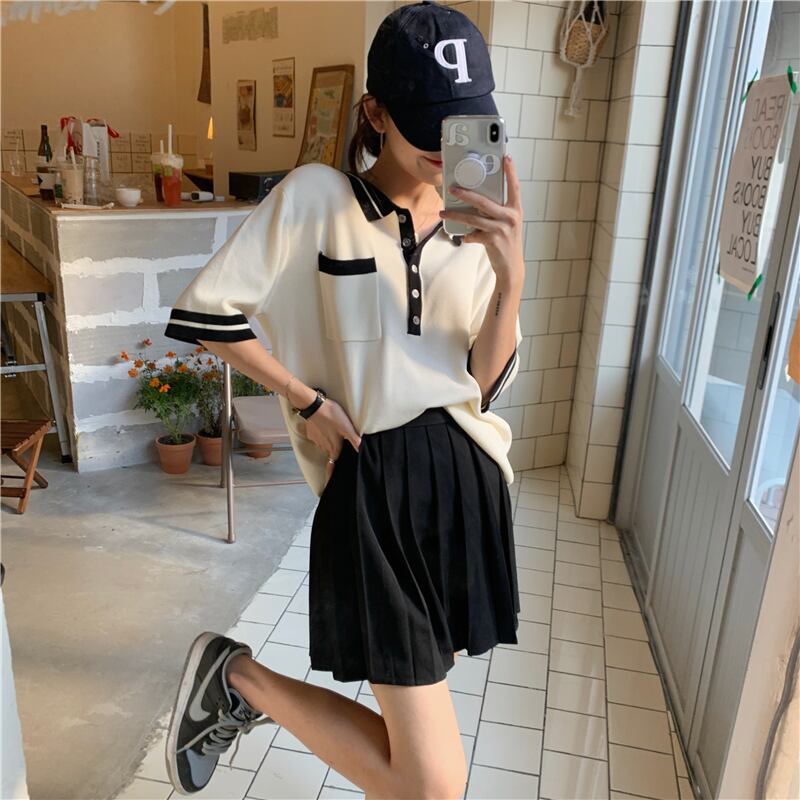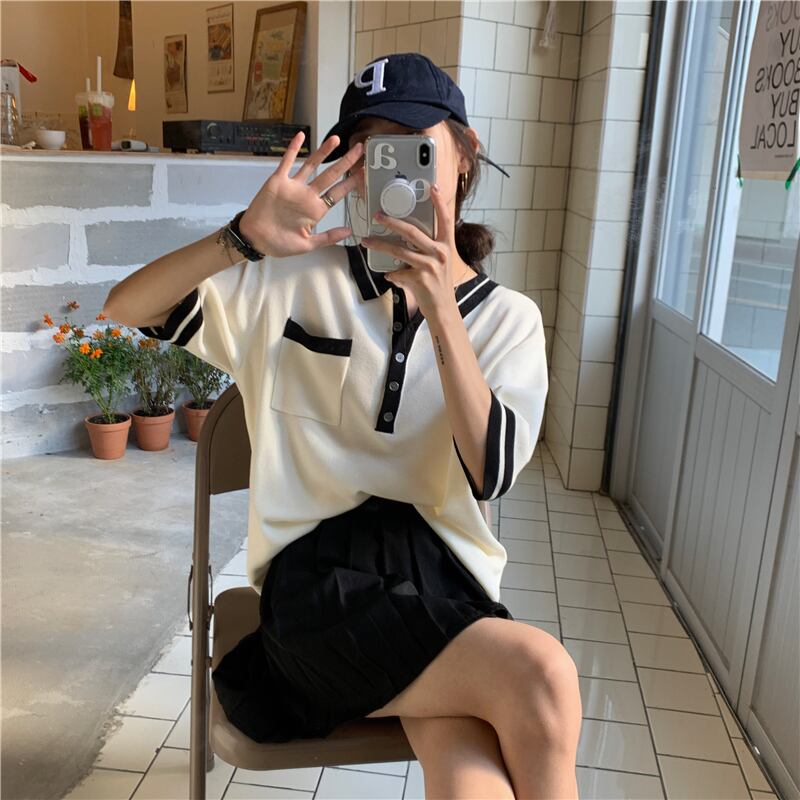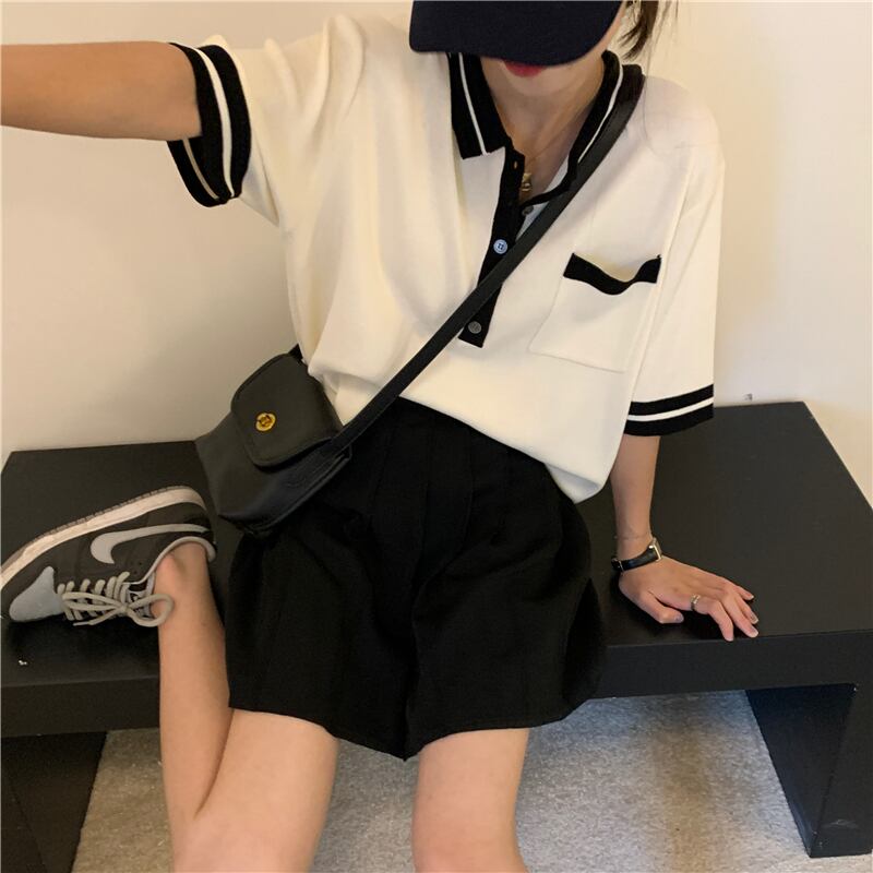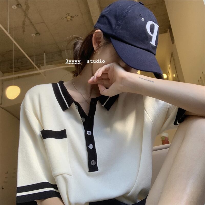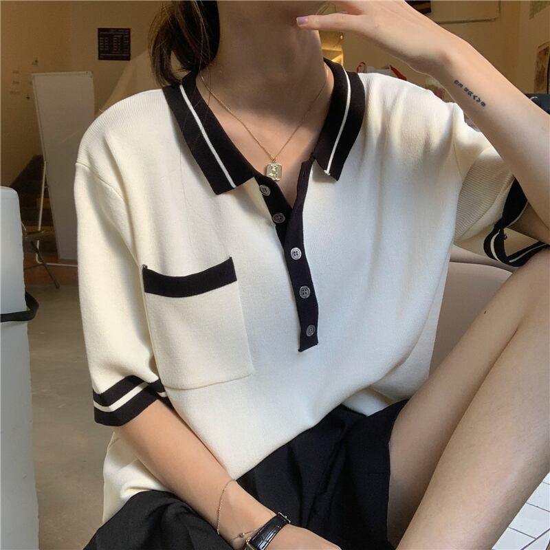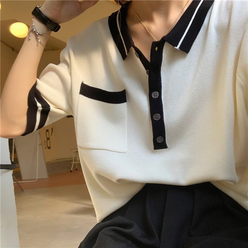 アメリカンハイストリートスタイルのコントラストカラーポロカラーフロントショルダー半袖Tシャツレディースサマーシンルースシンニットセータートップ 夏物 74600499550345 | framboise21