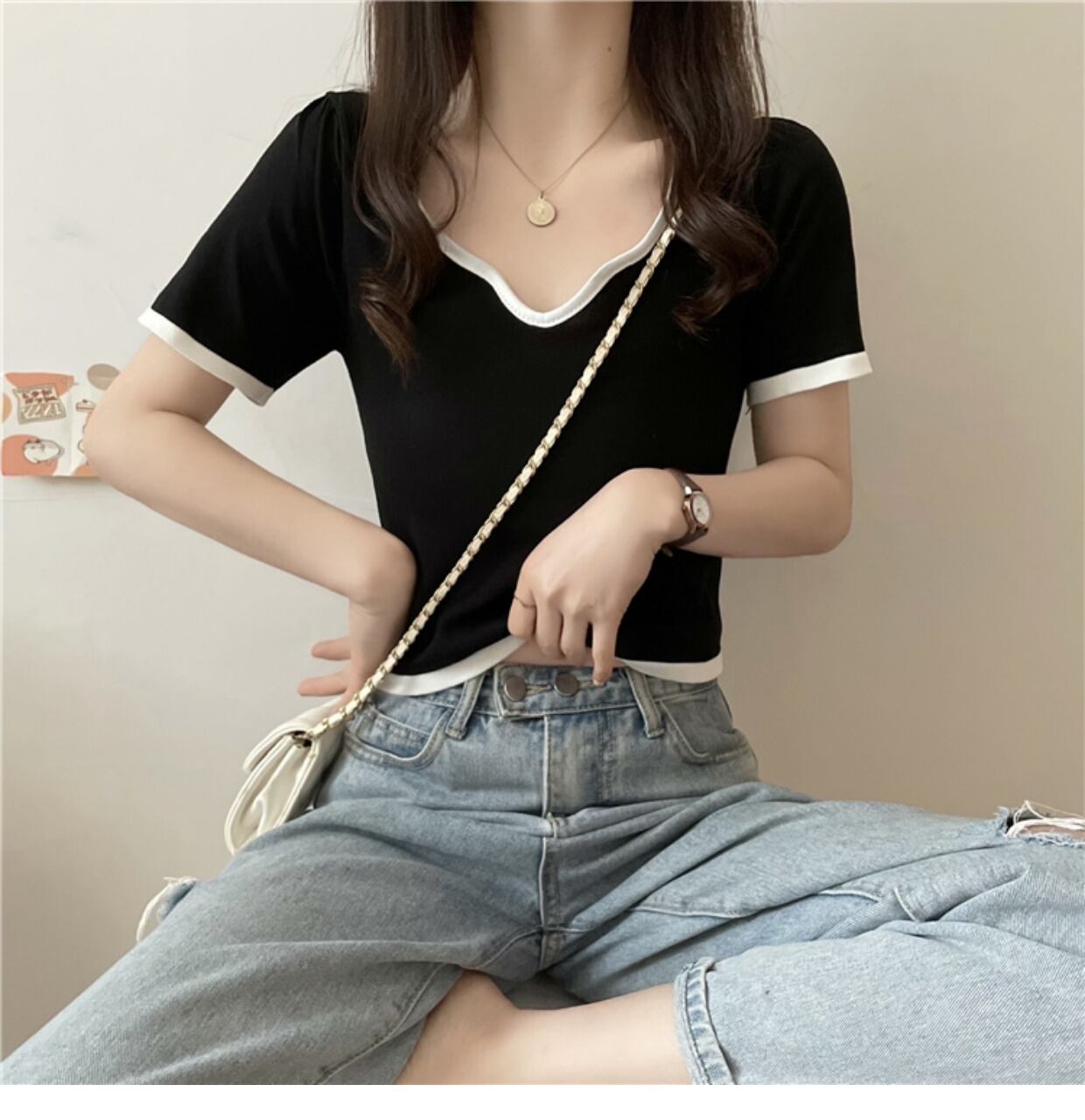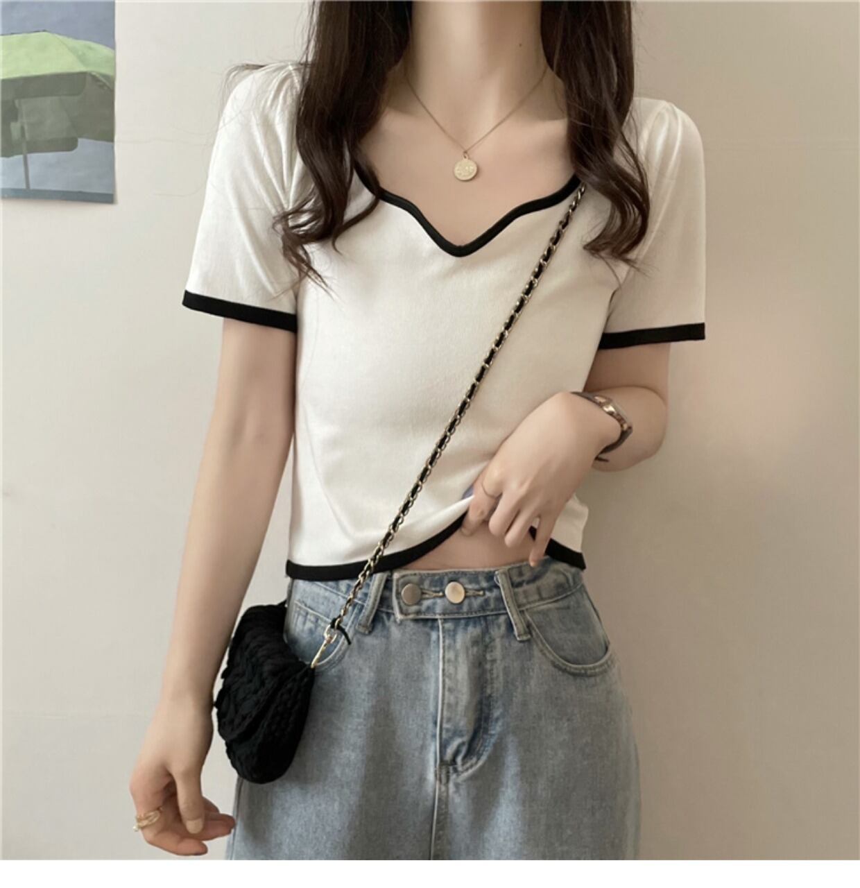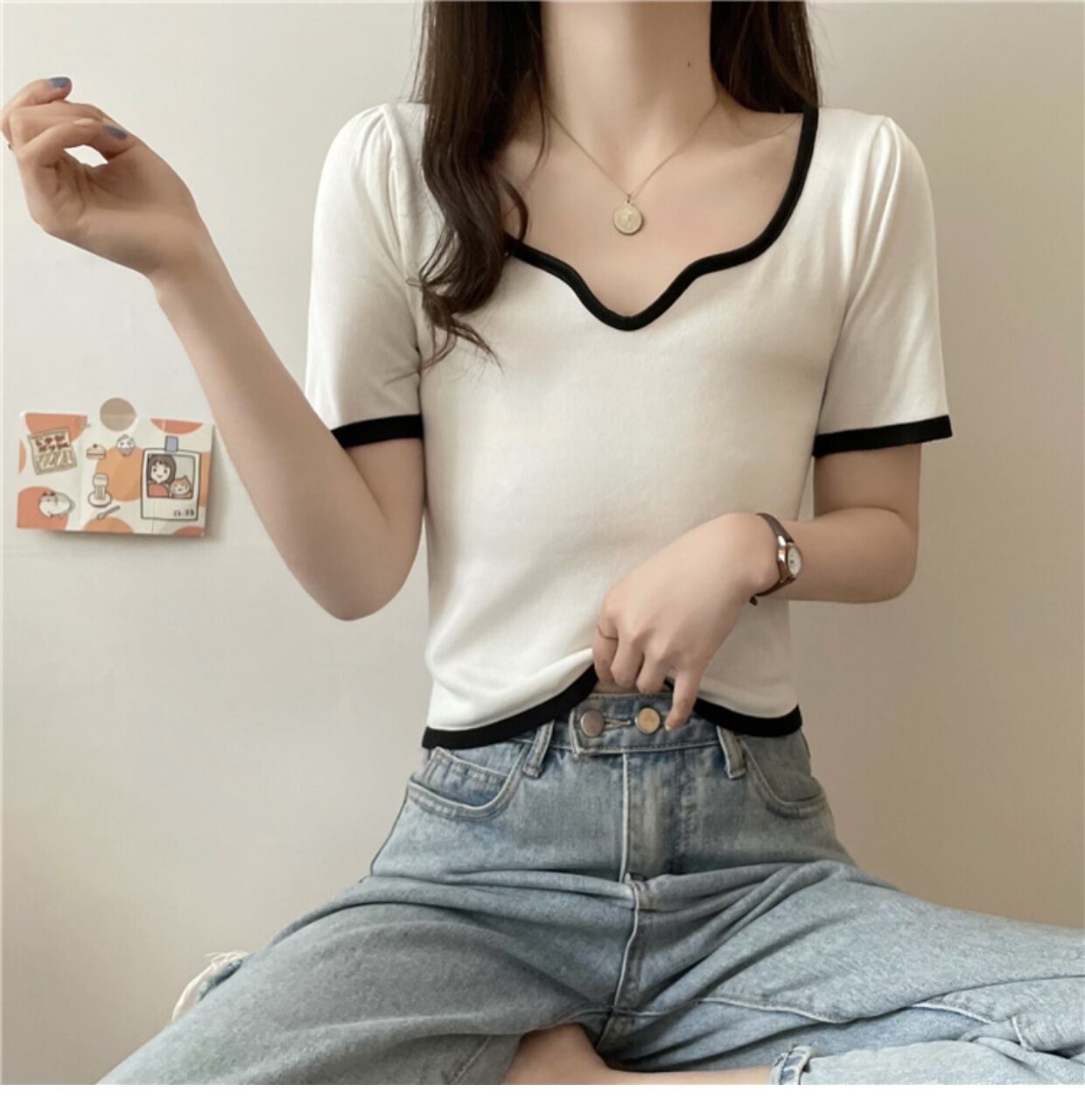 アイスシルク半袖フロントショルダーTシャツレディースサマーフレンチ鎖骨スクエアカラーウエスタンスタイルユニークパフスリーブショートトップ 夏物 スクウェア 7460074560117172 | framboise21