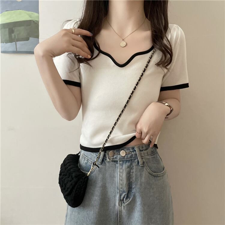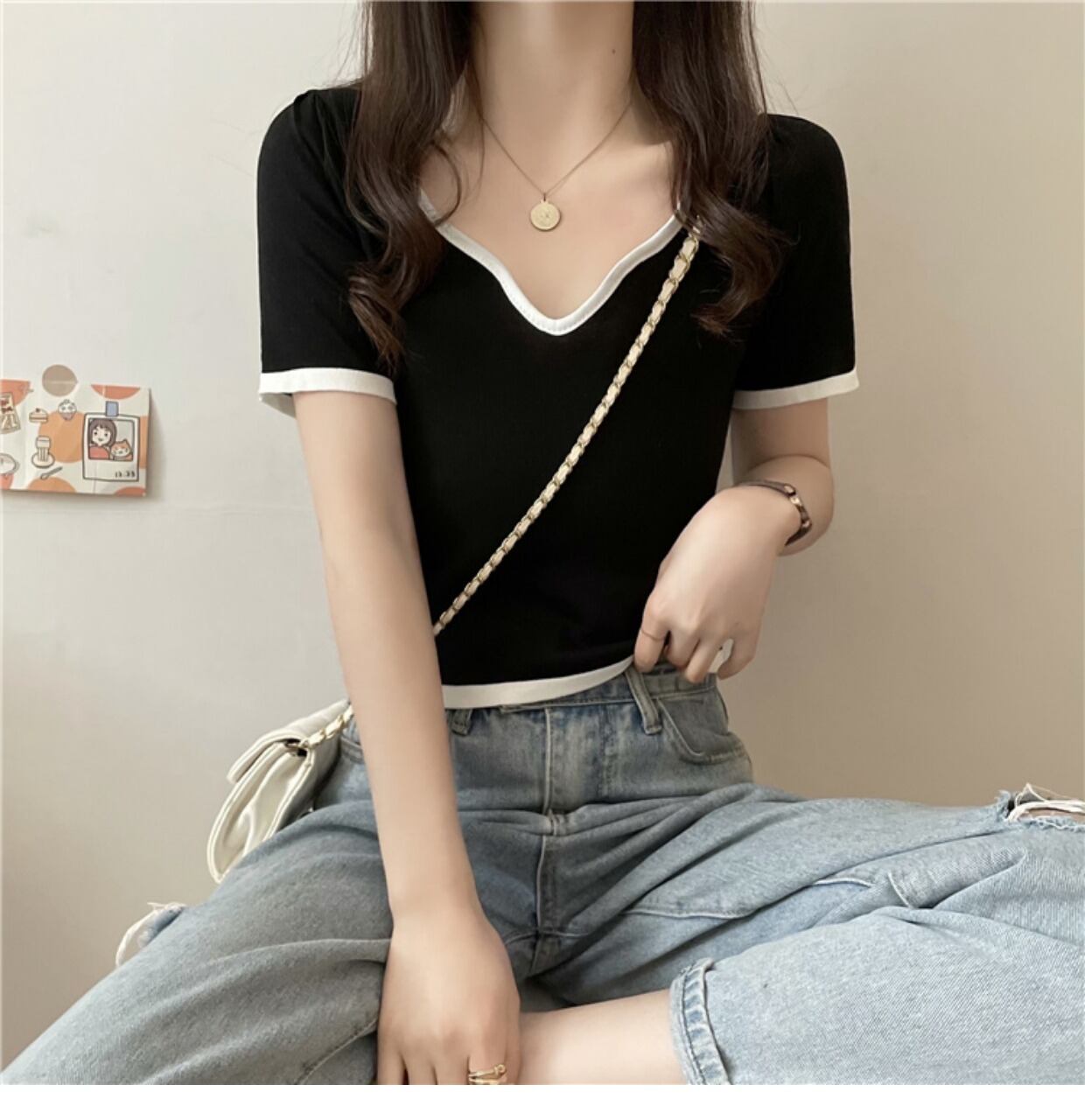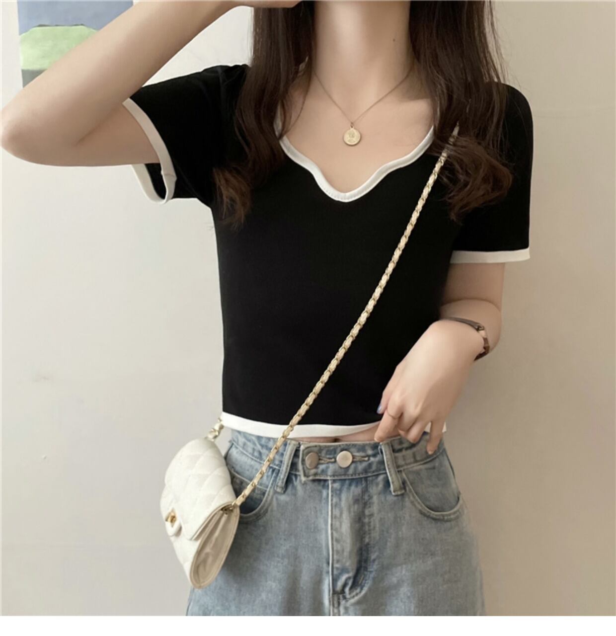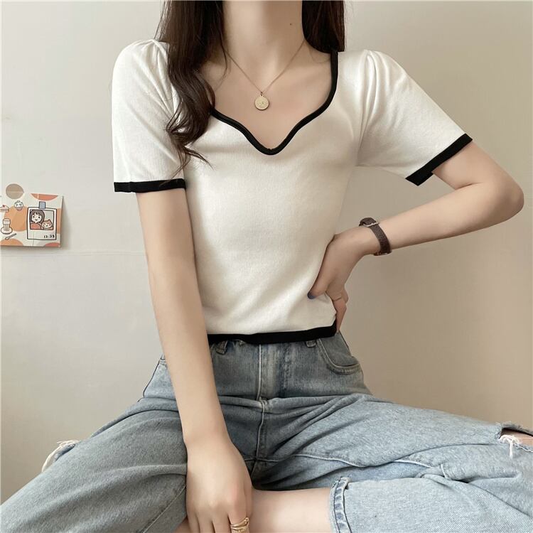 アイスシルク半袖フロントショルダーTシャツレディースサマーフレンチ鎖骨スクエアカラーウエスタンスタイルユニークパフスリーブショートトップ 夏物 スクウェア 7460074560117172 | framboise21
