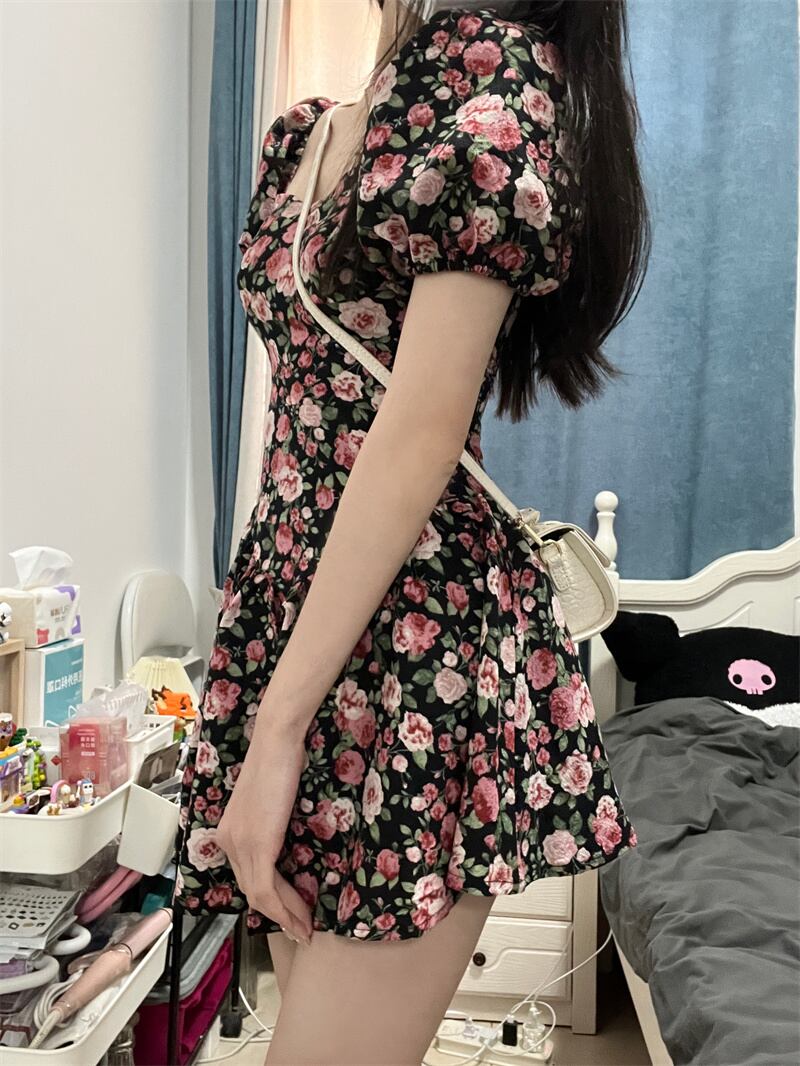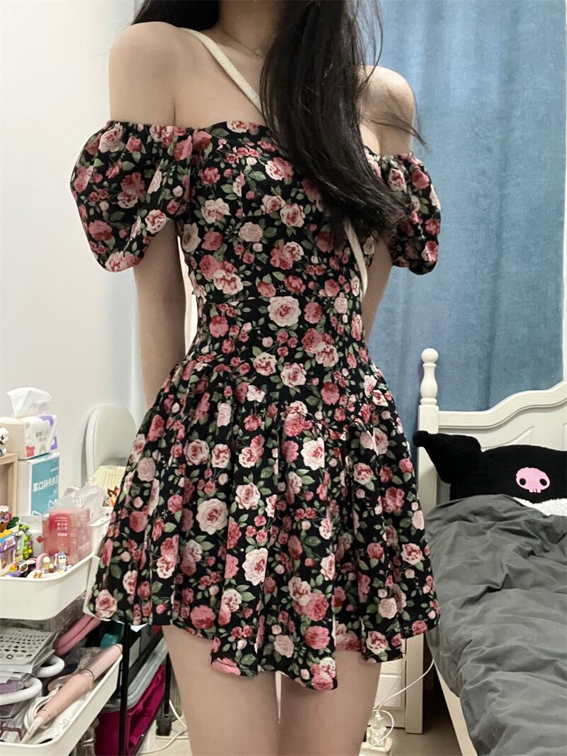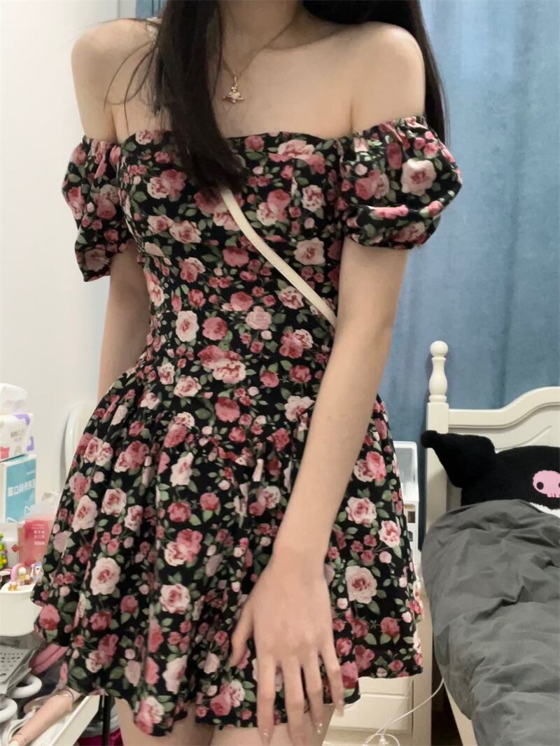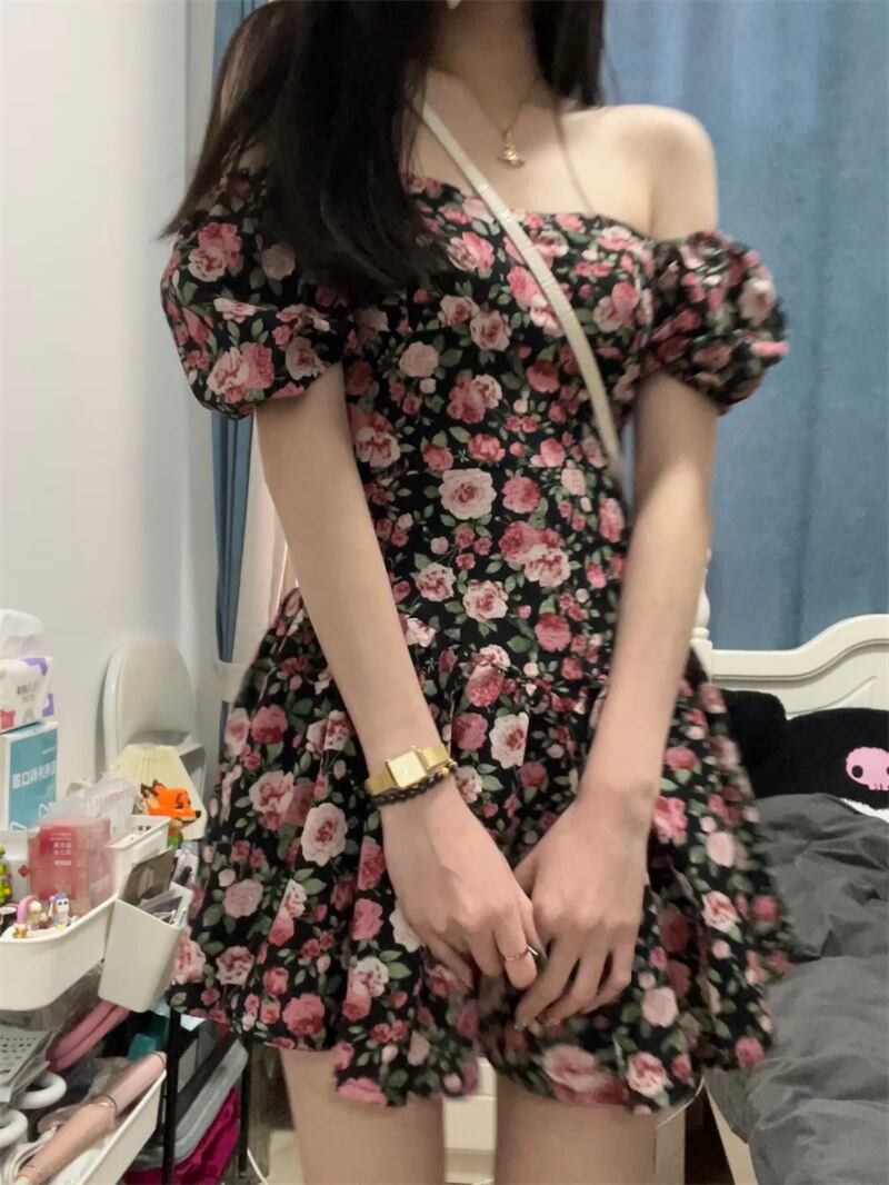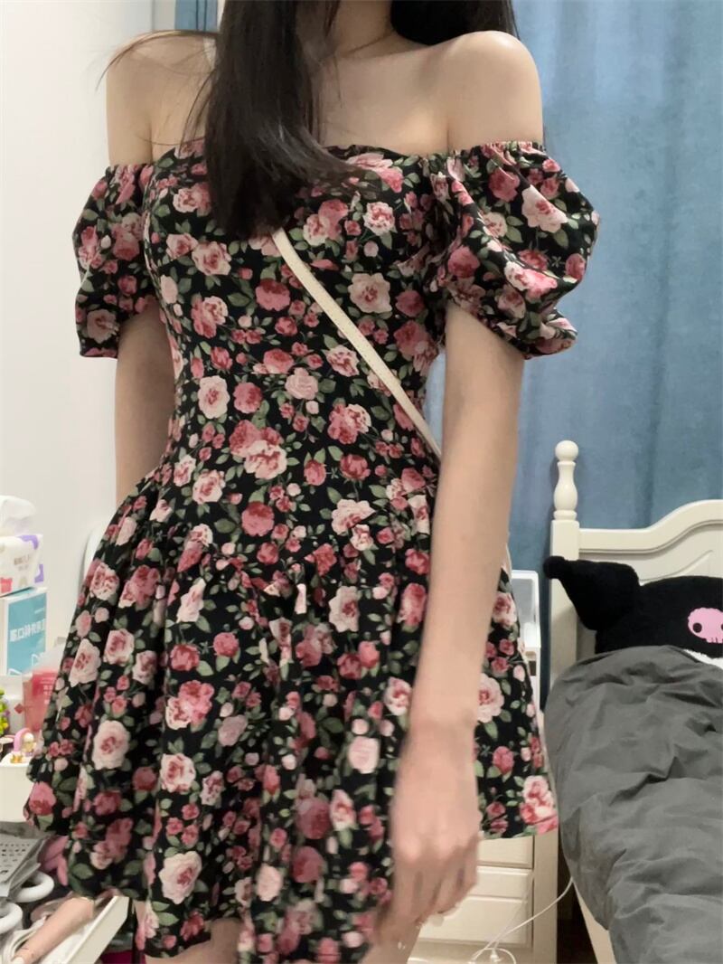 花柄ドレス女性の2022年夏新しいフランスの純粋な欲望スタイルのデザインパフスリーブワンショルダーティーブレイクスカート サマー 夏物 ピュア 7460087887448504 | framboise21