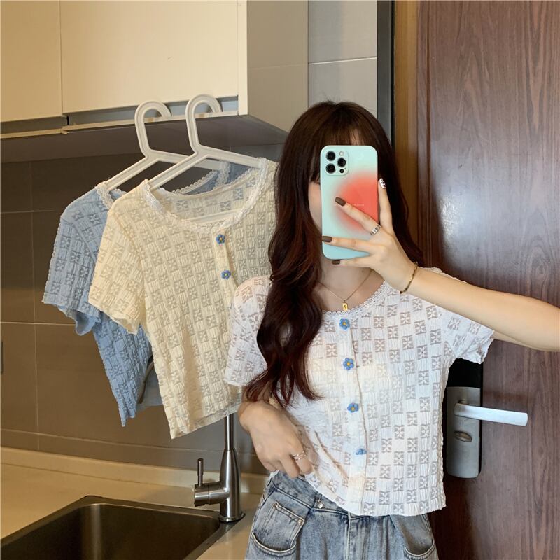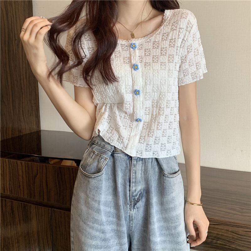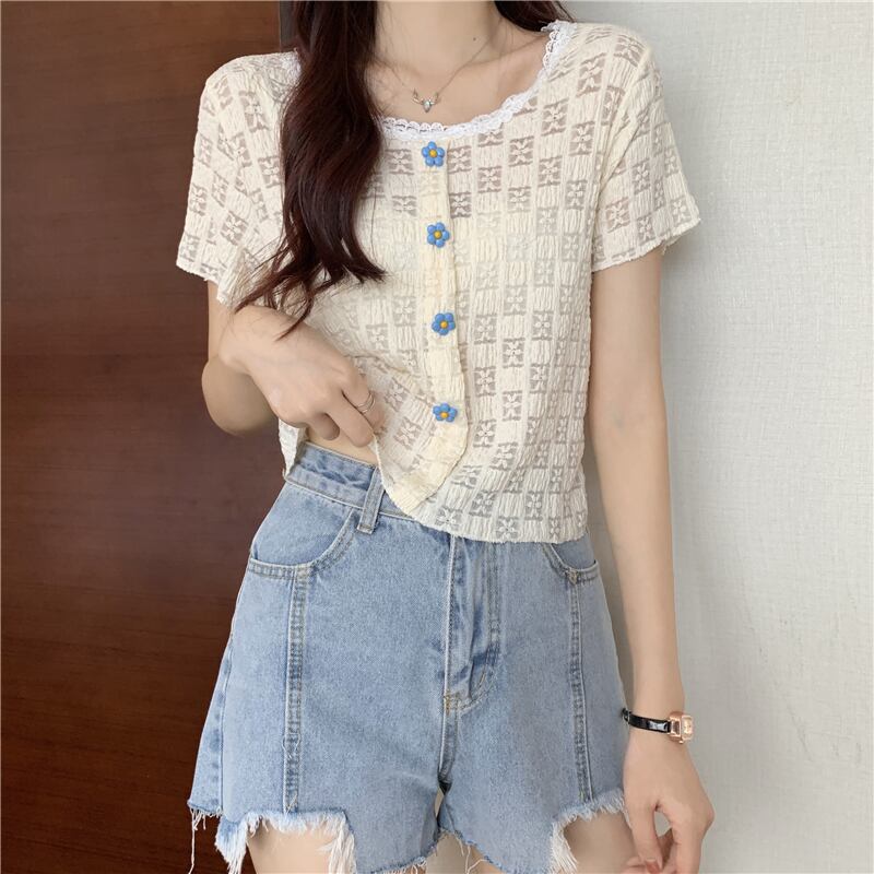 半袖フロントショルダーTシャツレディースサマーフレンチカラーボーンシャツ、エインスタイル、ユニークでスリム、ショートハーフスリーブシフォントップ 夏物 7460047535852166 | framboise21