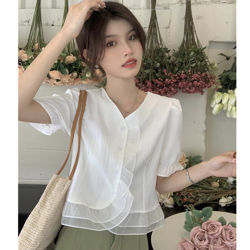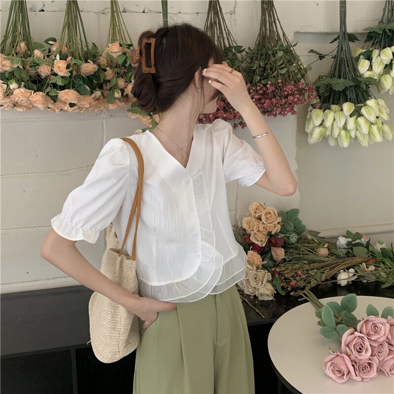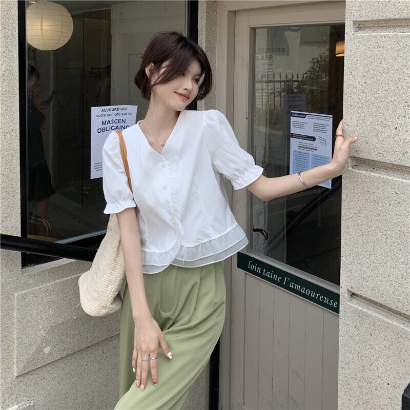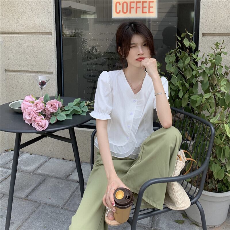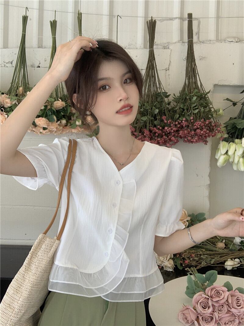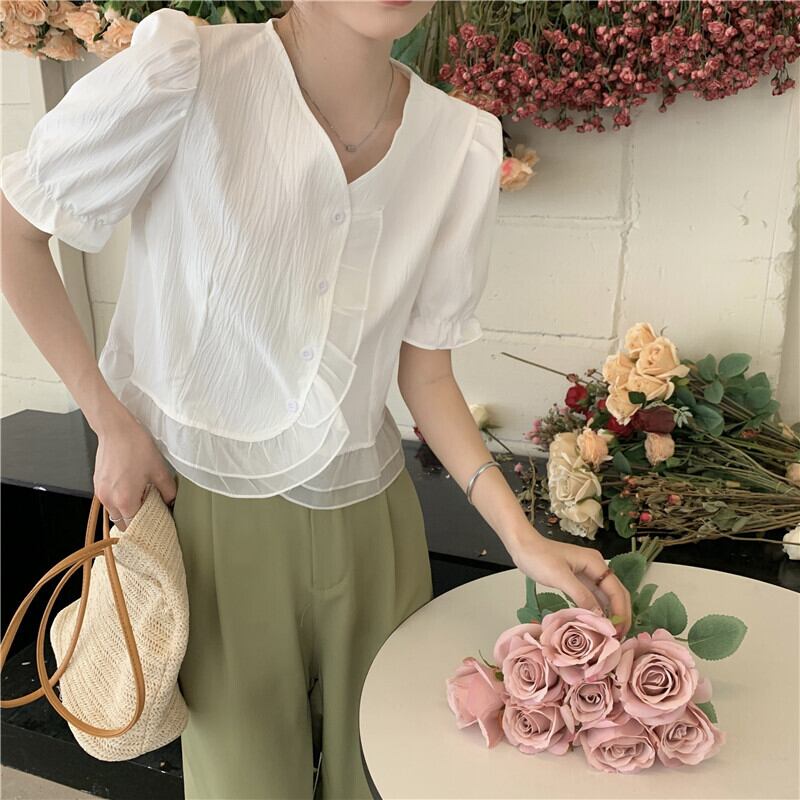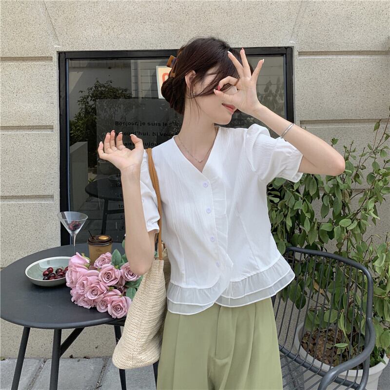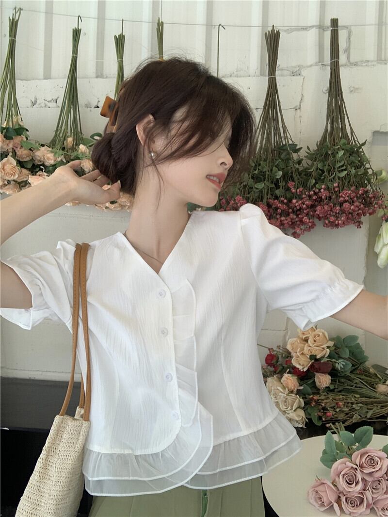 Vネック気質バブル半袖シャツレディースサマーフレンチシックレディピュアスウィートウィンドトップデザインセンスが小さい 大人ガーリー キュート カジュアル 夏物 7460041143102626 | framboise21