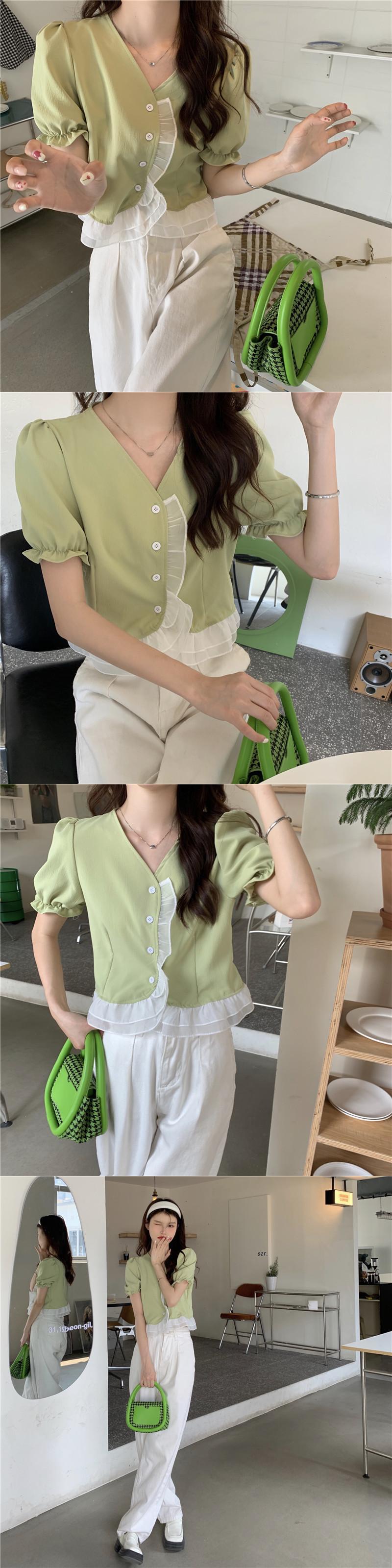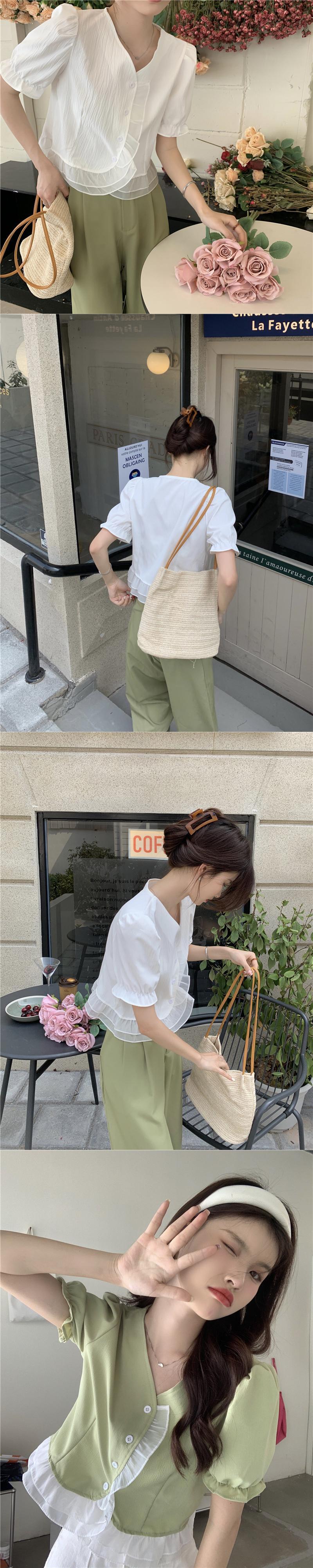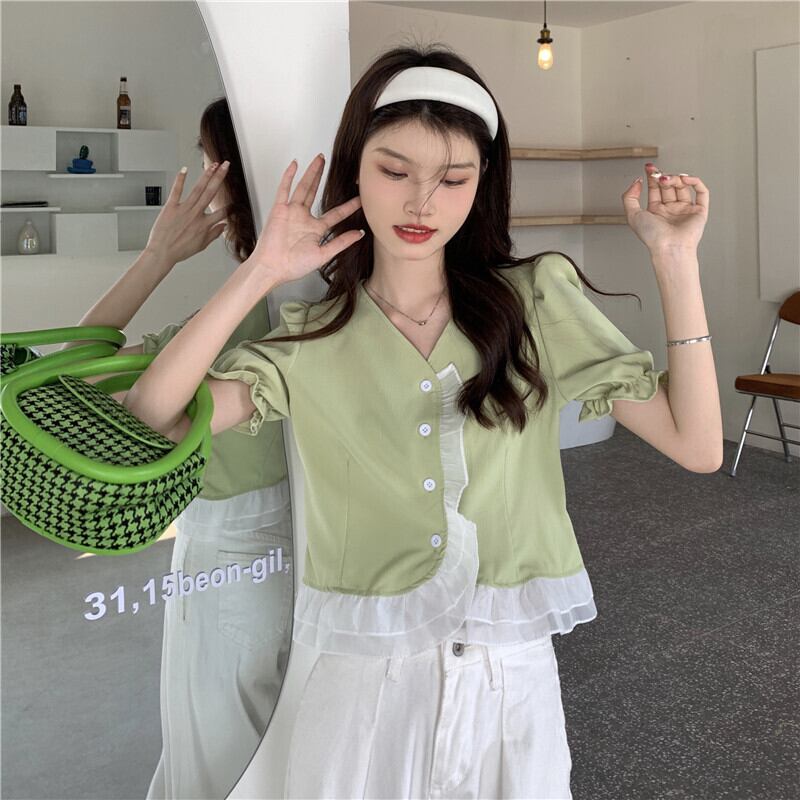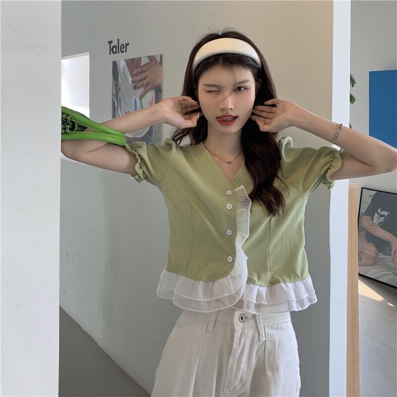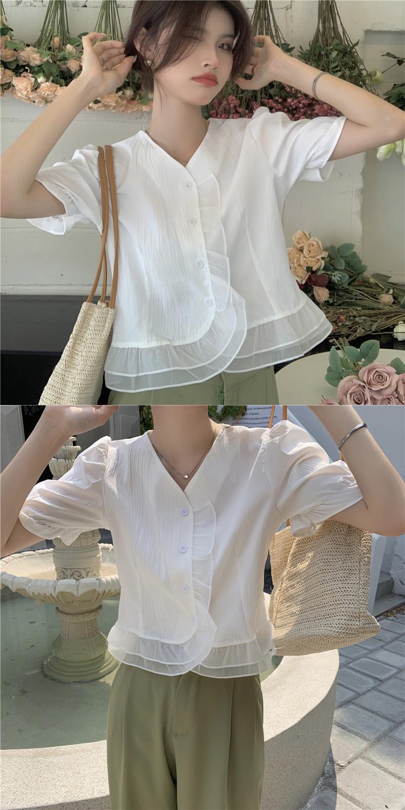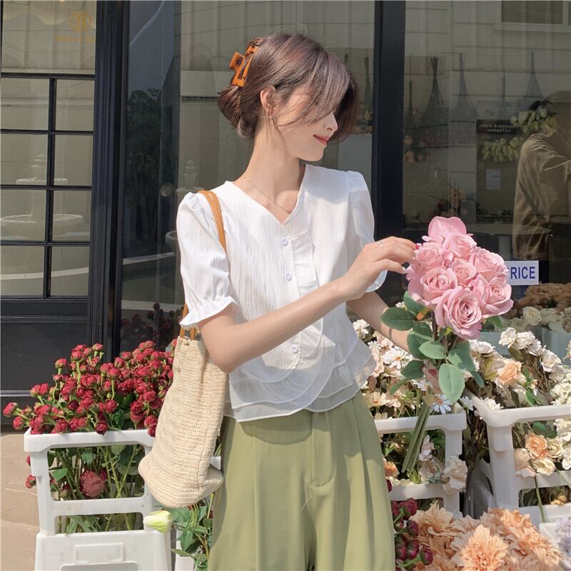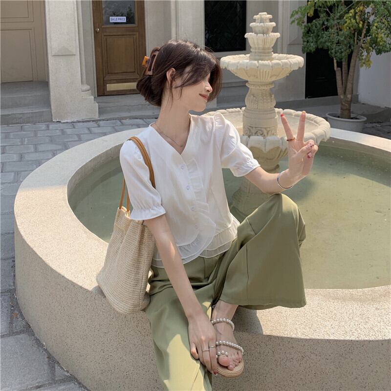 Vネック気質バブル半袖シャツレディースサマーフレンチシックレディピュアスウィートウィンドトップデザインセンスが小さい 大人ガーリー キュート カジュアル 夏物 7460041143102626 | framboise21