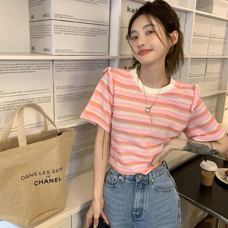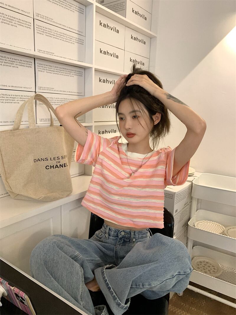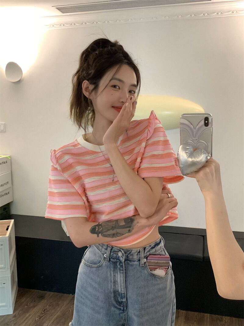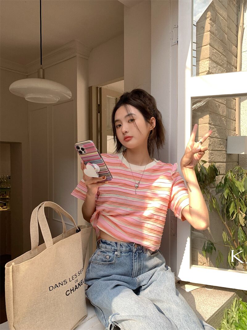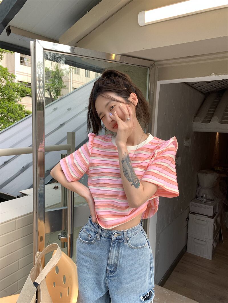 コントラストカラーのストライプ半袖フロントショルダーTシャツレディースニッチスリミングデザインスウィートスモールショートトップサマー 大人ガーリー キュート カジュアル 夏物 7460073251618426 | framboise21