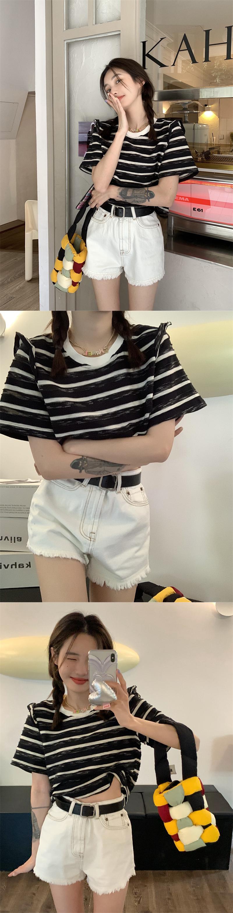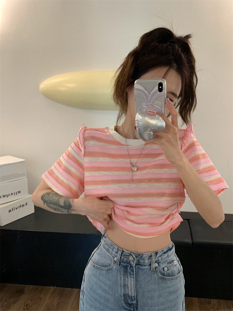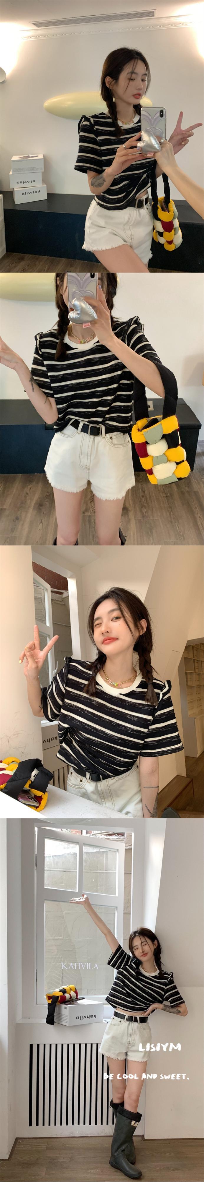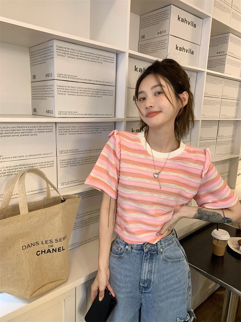 コントラストカラーのストライプ半袖フロントショルダーTシャツレディースニッチスリミングデザインスウィートスモールショートトップサマー 大人ガーリー キュート カジュアル 夏物 7460073251618426 | framboise21