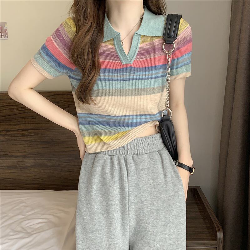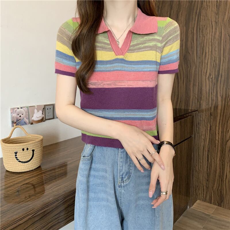 レインボーストライプポロシャツフロントショルダー半袖Tシャツレディース2022夏新作アイスシルクニットトップスリントレンディ ショート ハーフスリーブ サマー 夏物 7460057423055778 | framboise21