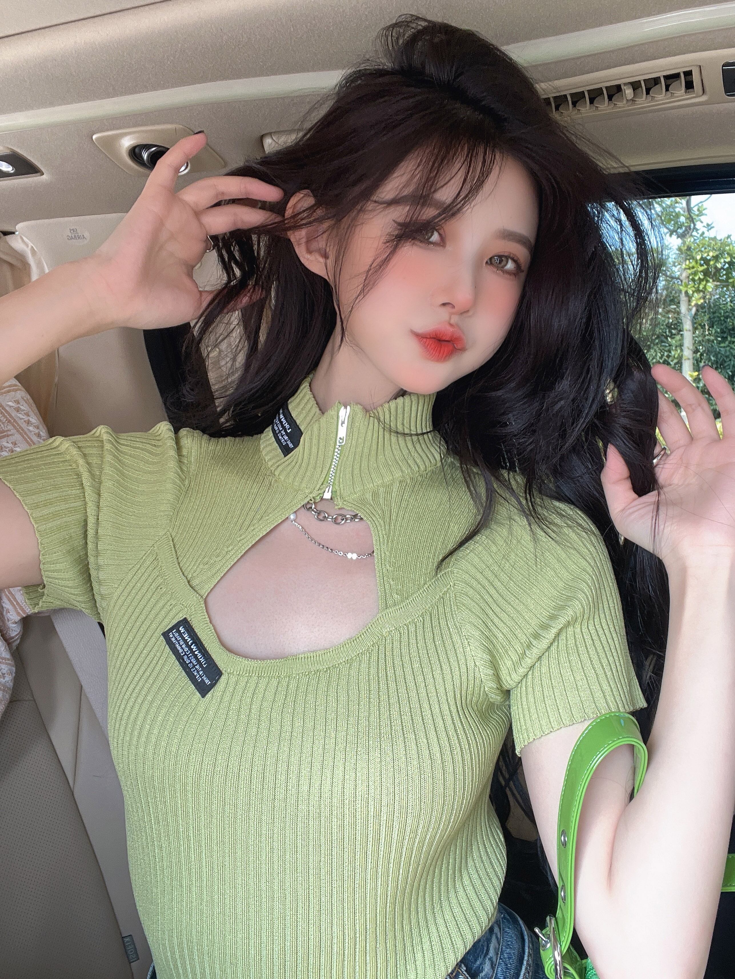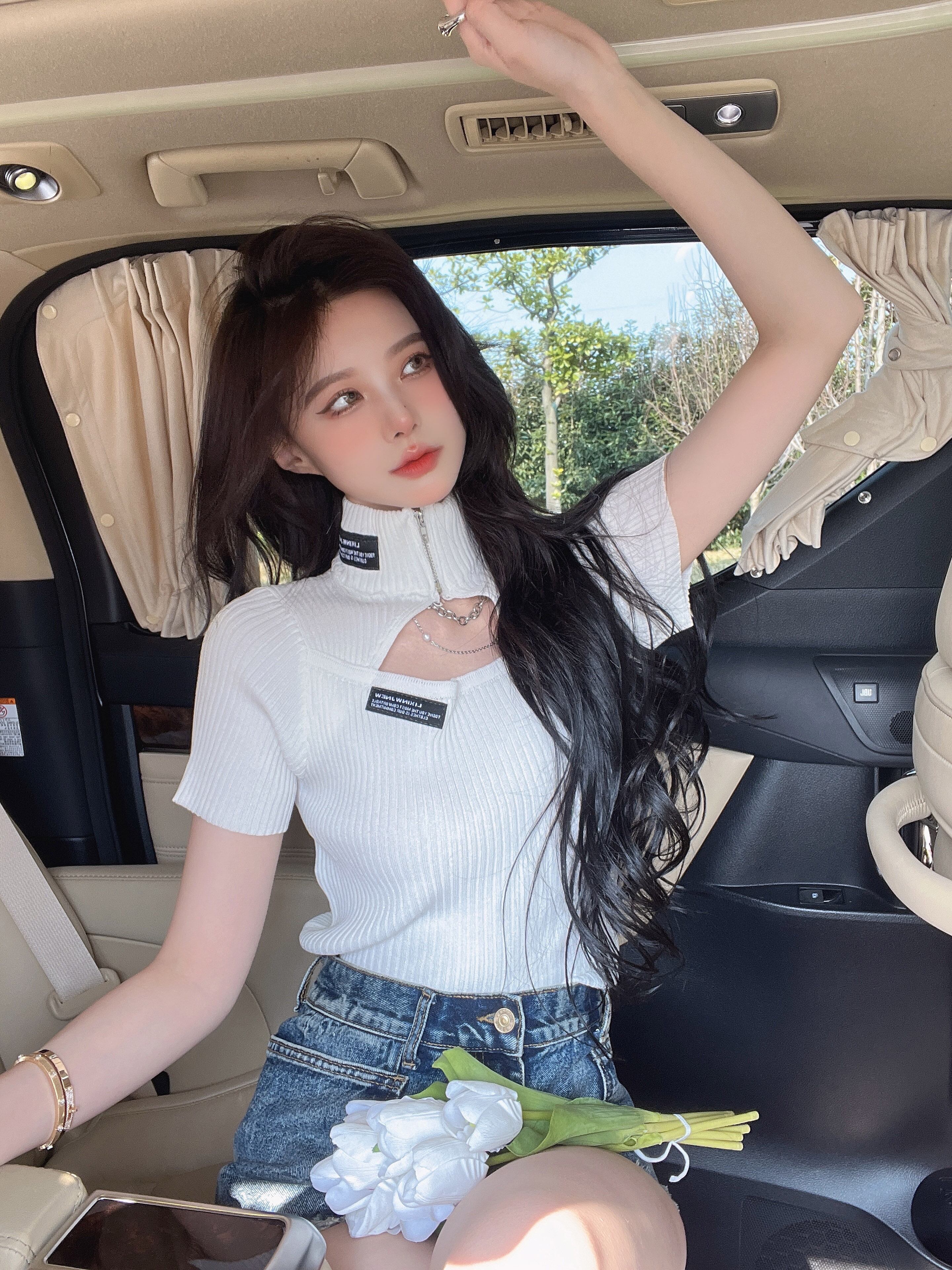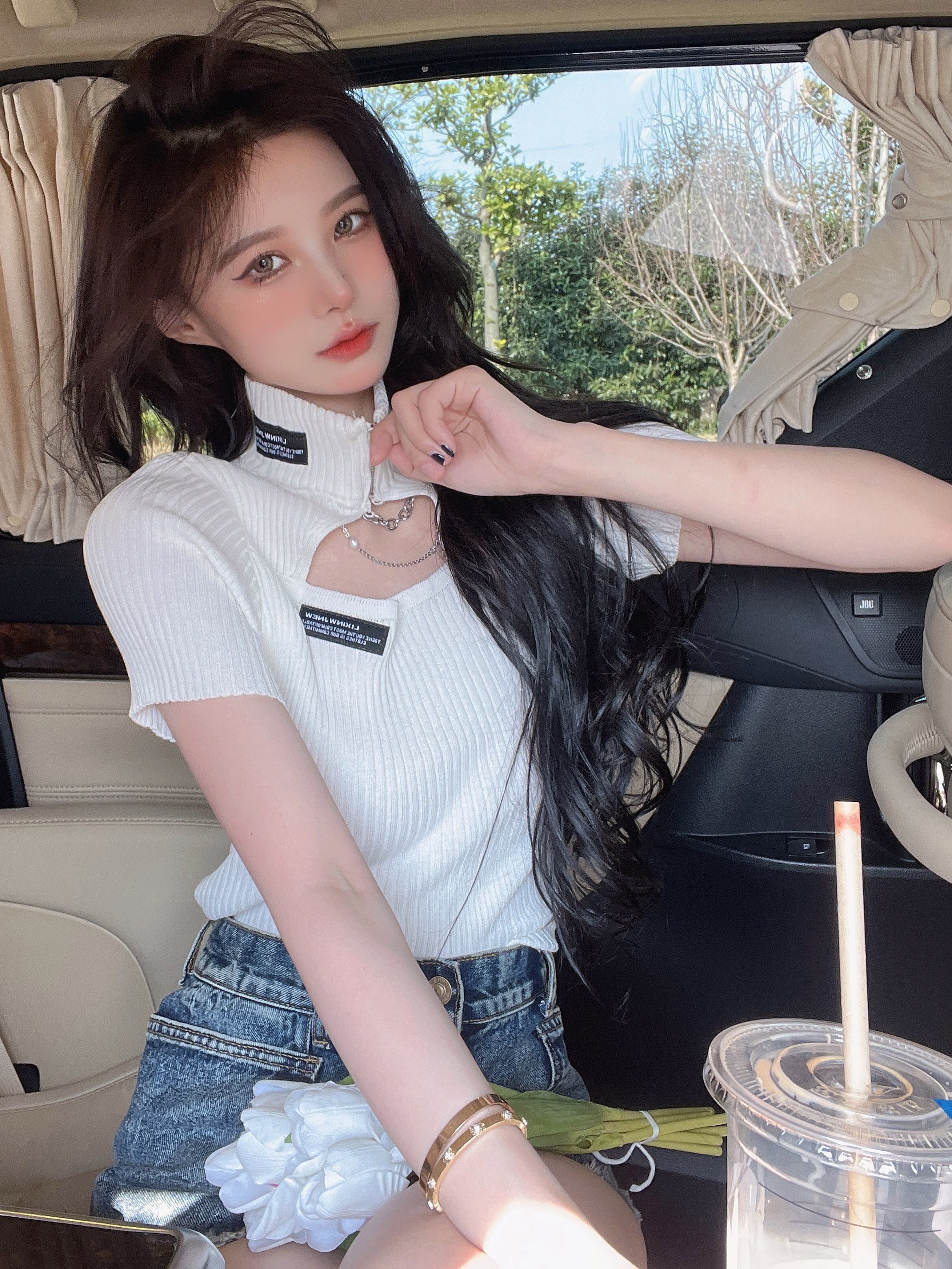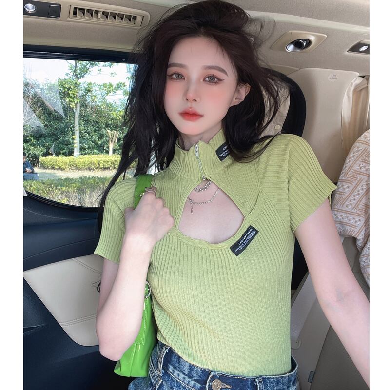 ニット半袖Tシャツ女性の2022年夏新しいファッションスモールシャツデザインセンスニッチ純粋な欲望中空タートルネックトップ サマー 夏物 ピュア 7460039589370563 | framboise21