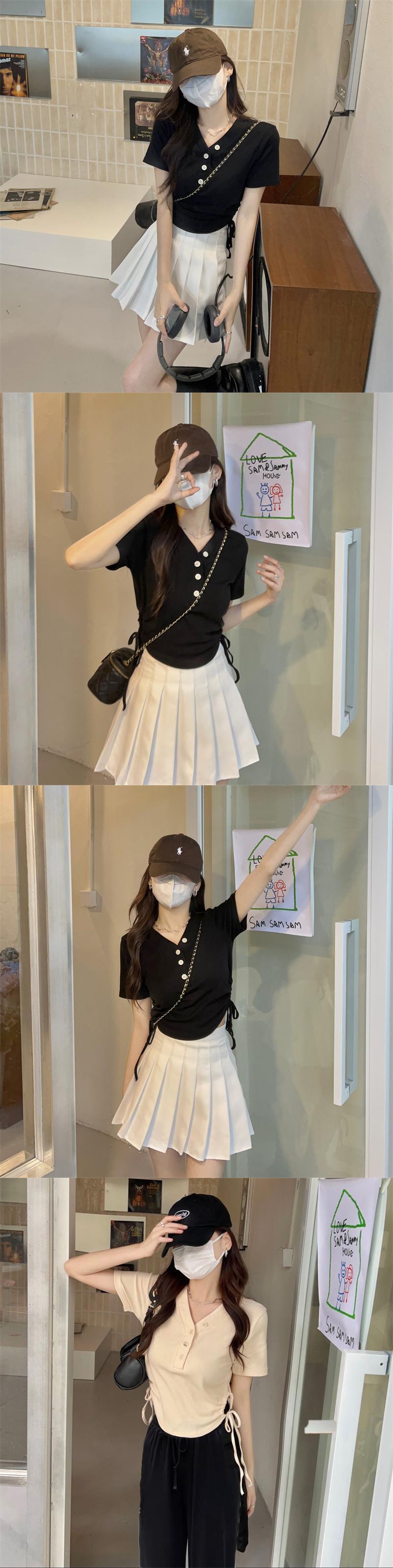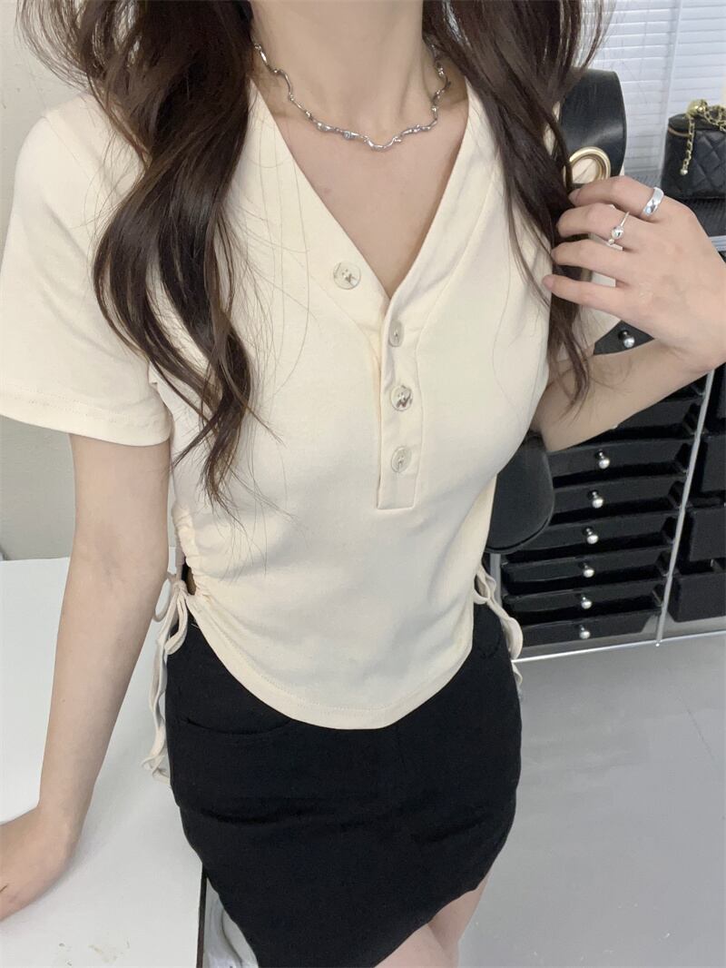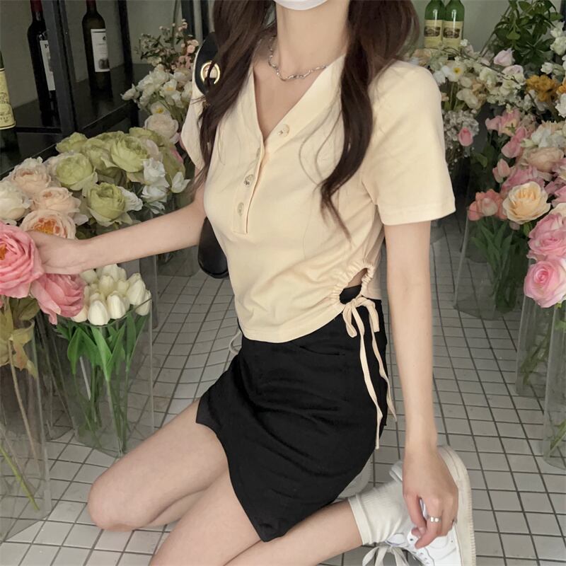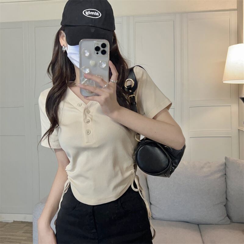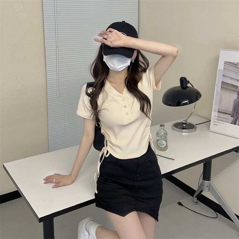 アメリカンVネックドローストリングフロントショルダー半袖Tシャツレディースサマーデザインニッチスリムフィットと薄い不規則なショートトップ 夏物 74600814510547 | framboise21
