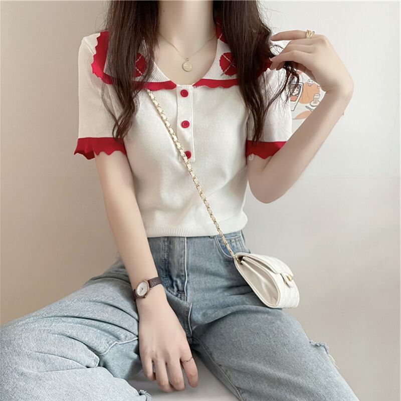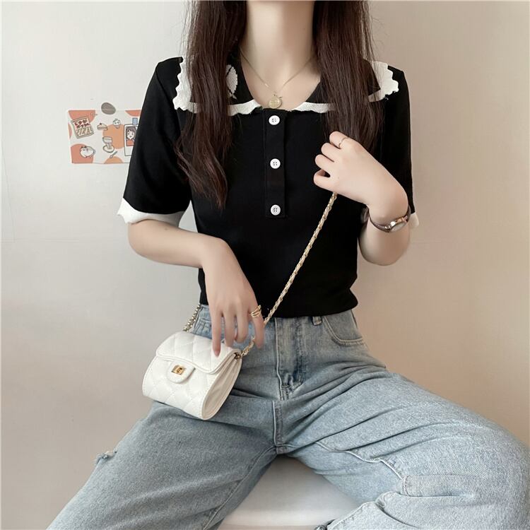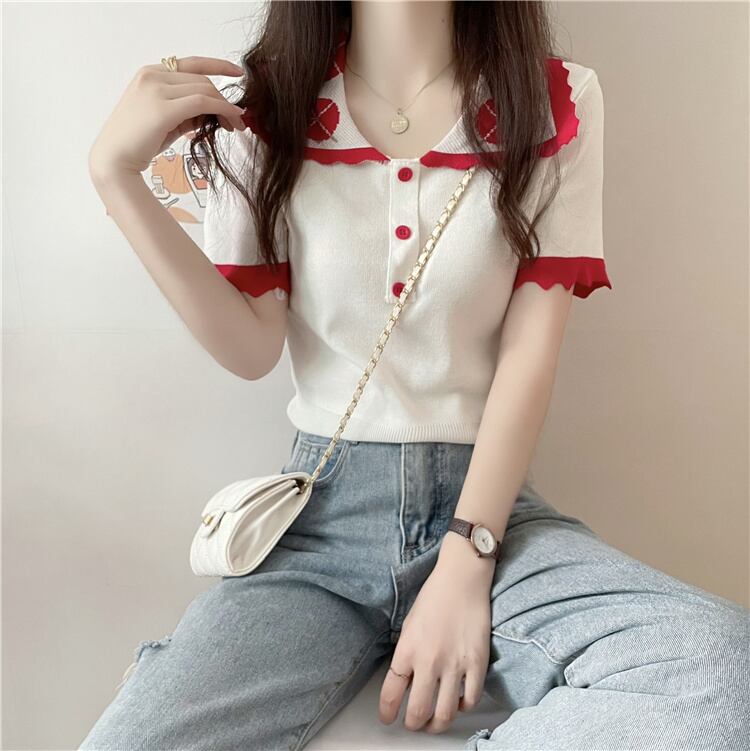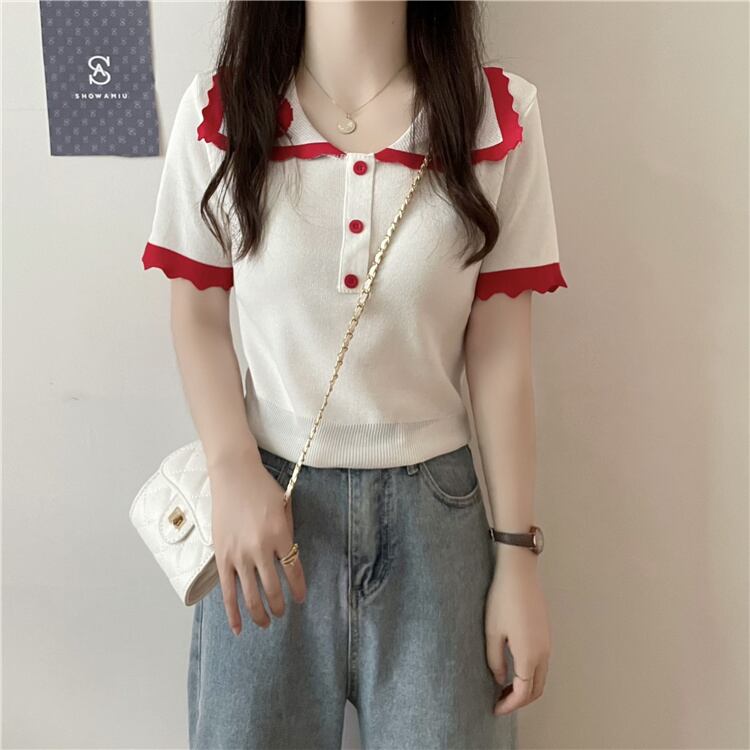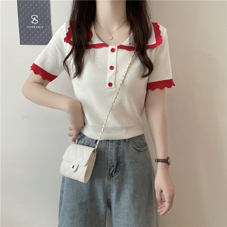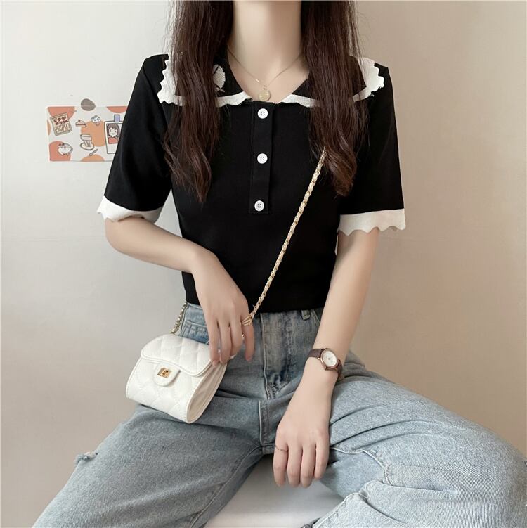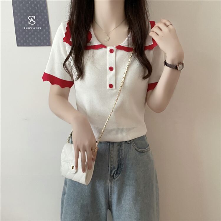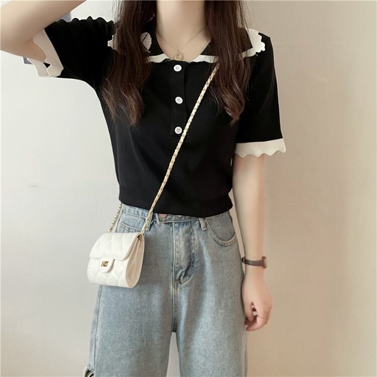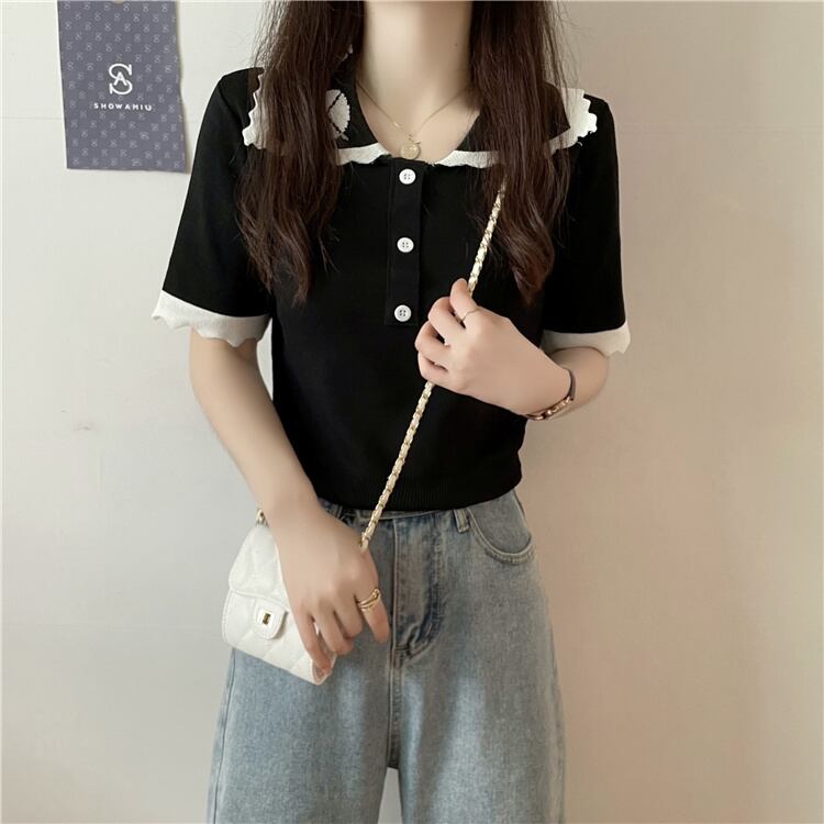 ドールカラーコントラストカラーアイスシルク薄手ニットカーディガンレディースデザインセンスニッチ2022年夏新バージョン半袖 ショート ハーフスリーブ サマー 夏物 7460042963753373 | framboise21
