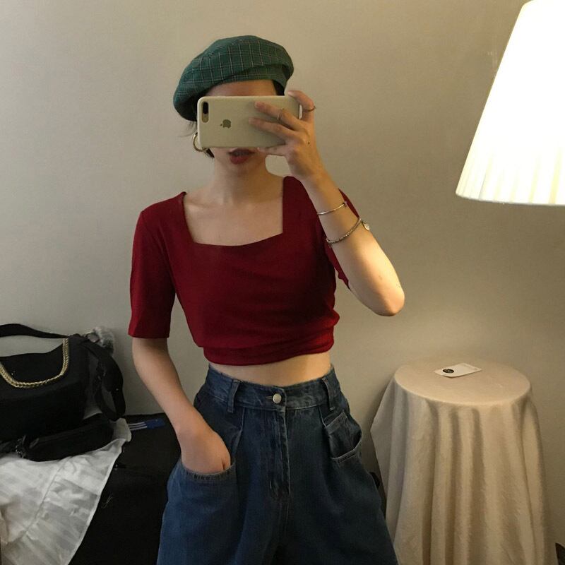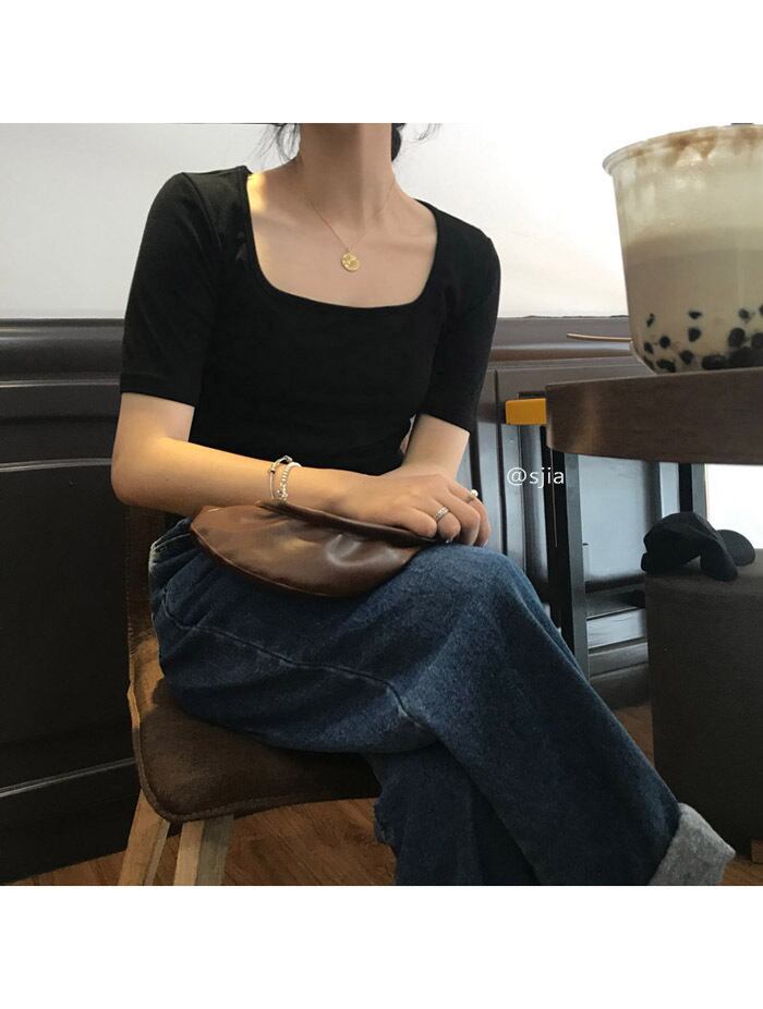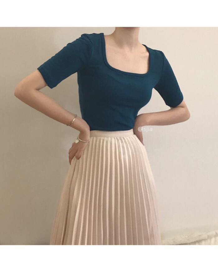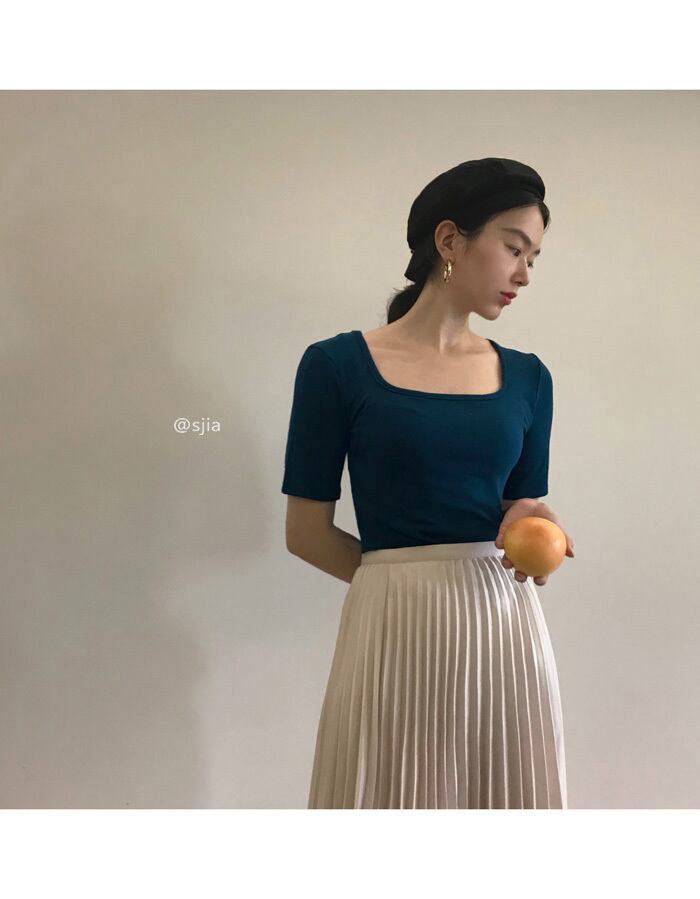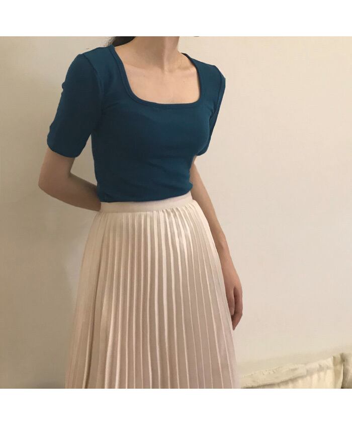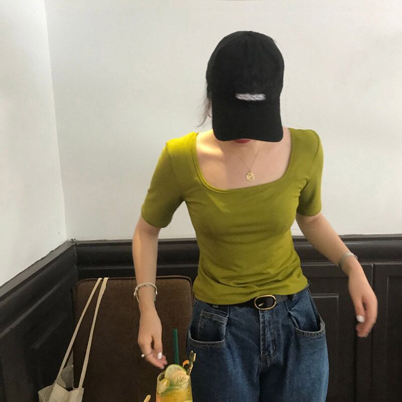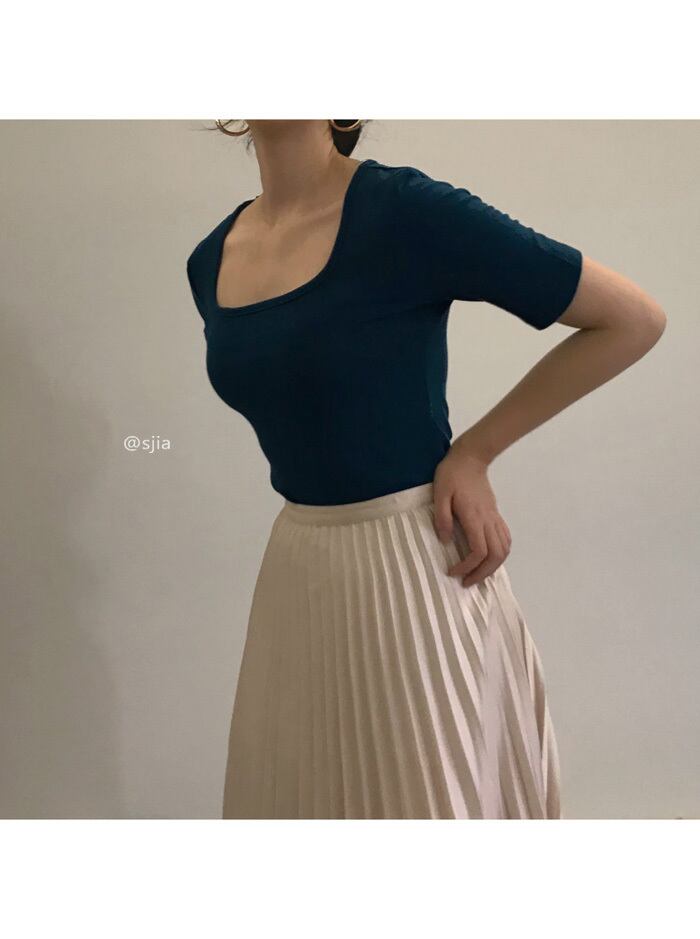 スクエアカラーカラーボーントップ半袖Tシャツレディースレトロフレンチサマースリムフィットデザインスモールピーコックブルーニットセーター 夏物 スクウェア 7460067861596286 | framboise21