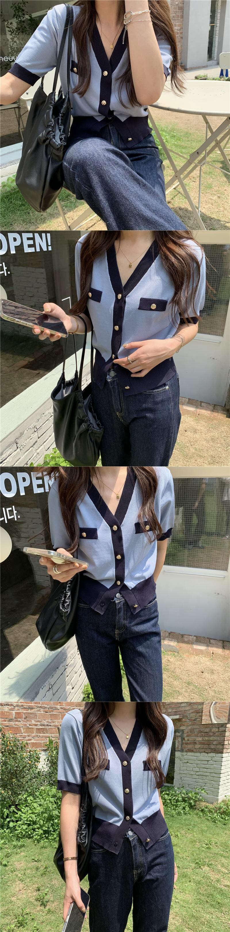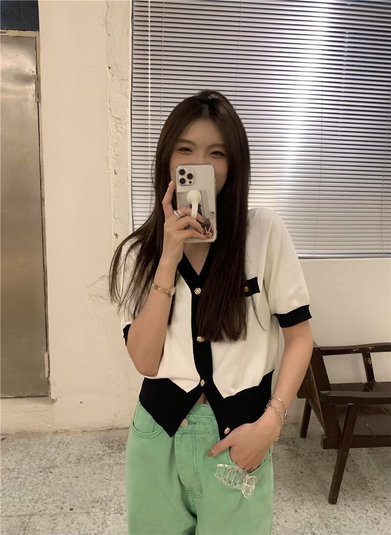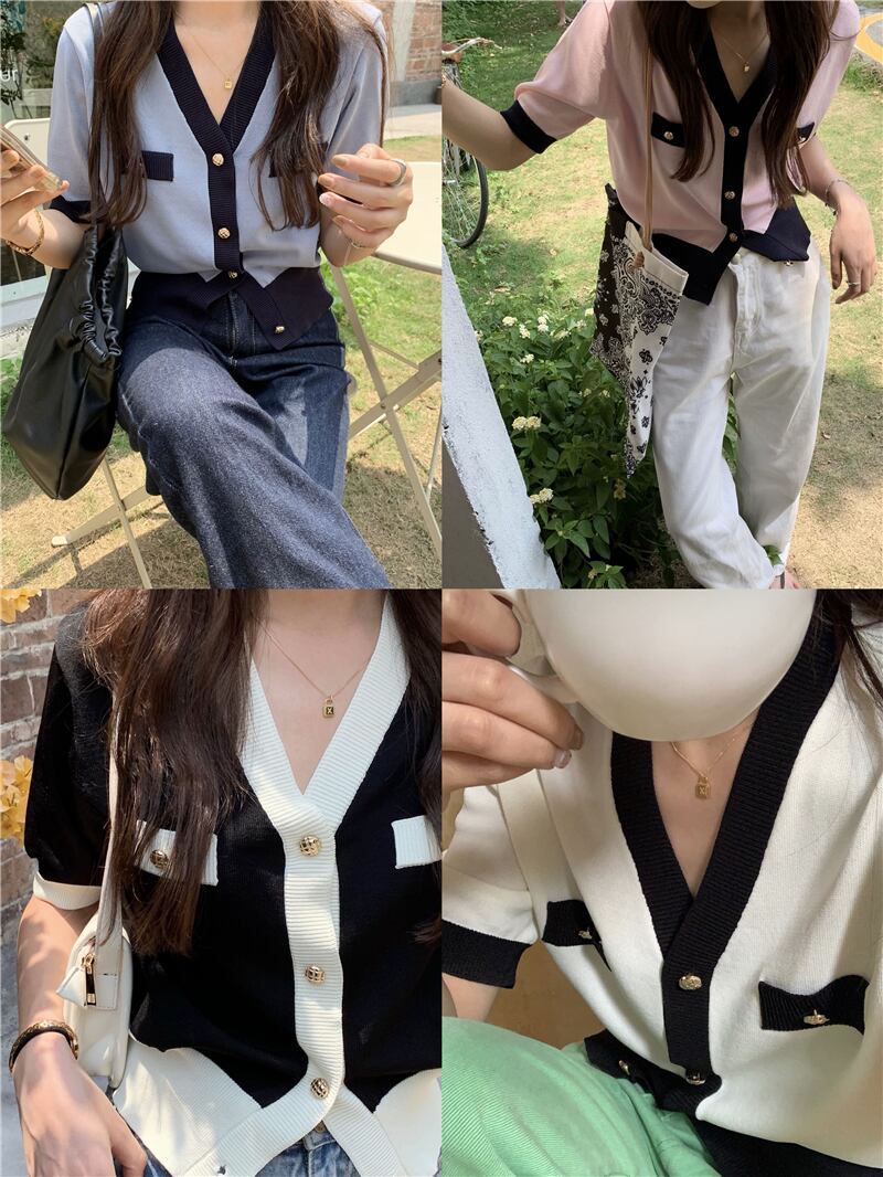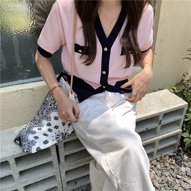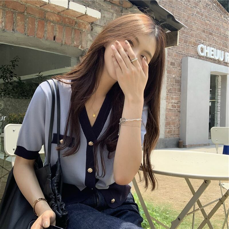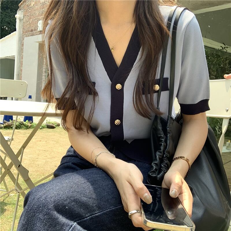 2022年夏の新作スタイルのスモールフレグランスストライプニットカーディガンVネック半袖Tシャツレディースオールマッチトップデザインセンスニッチ サマー 夏物 7460049893224532 | framboise21