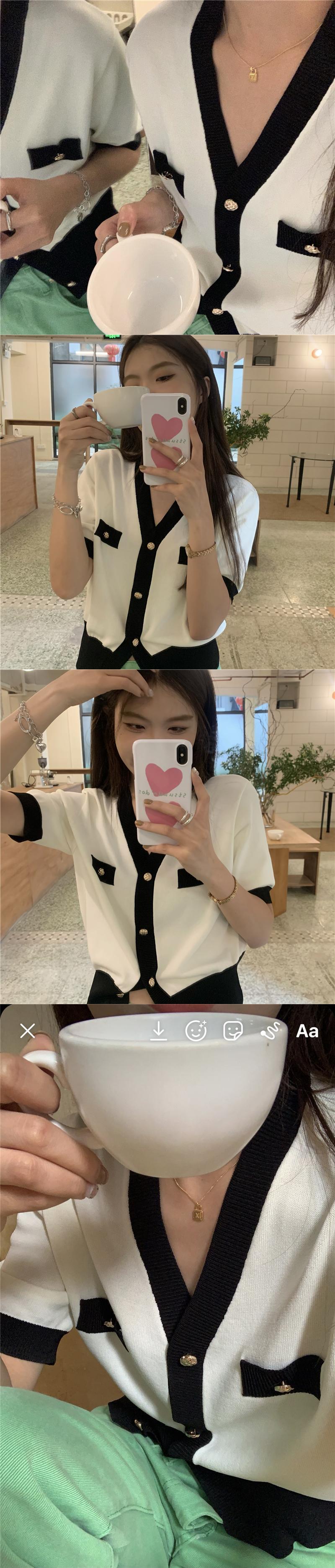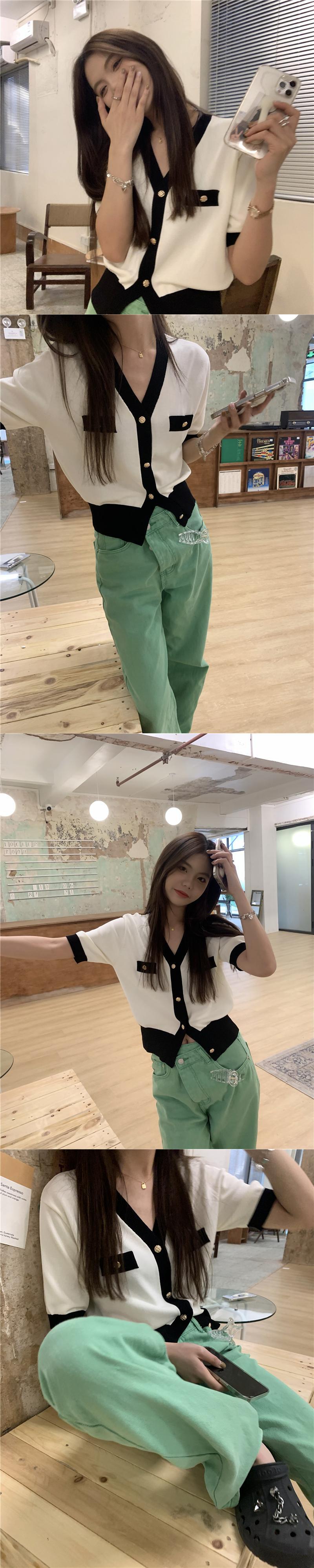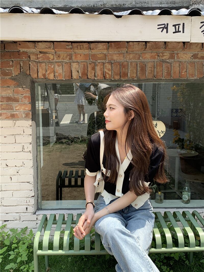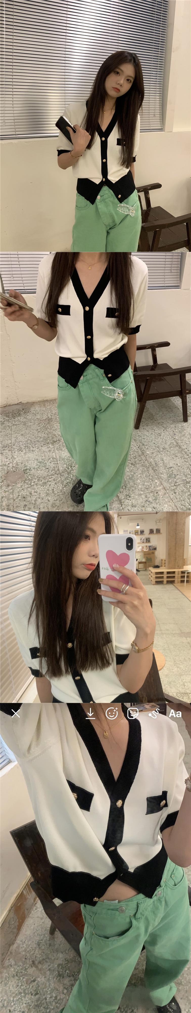 2022年夏の新作スタイルのスモールフレグランスストライプニットカーディガンVネック半袖Tシャツレディースオールマッチトップデザインセンスニッチ サマー 夏物 7460049893224532 | framboise21