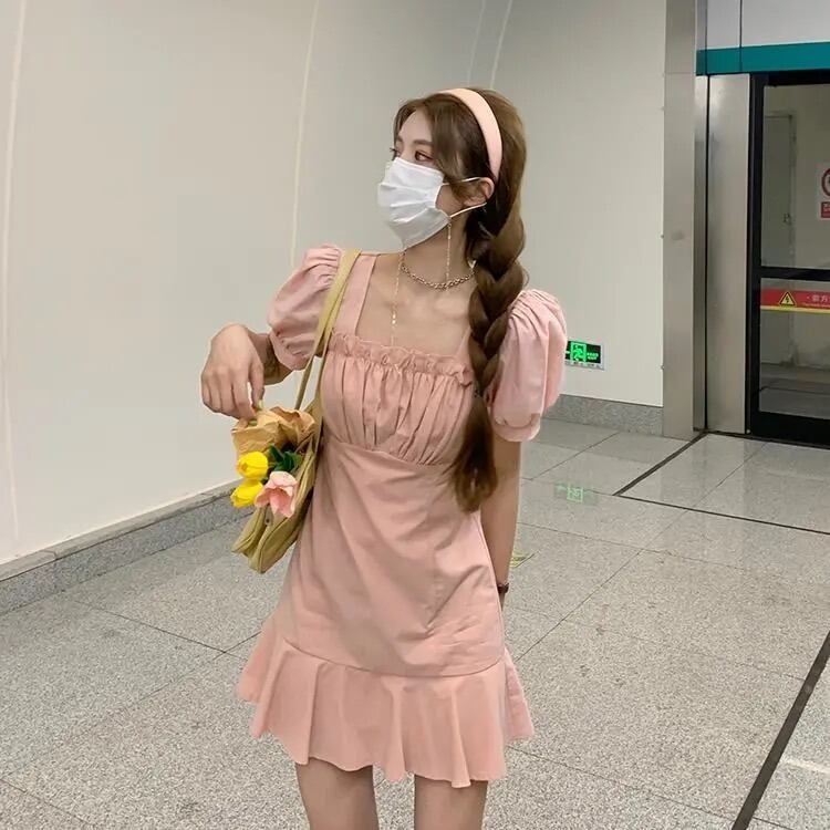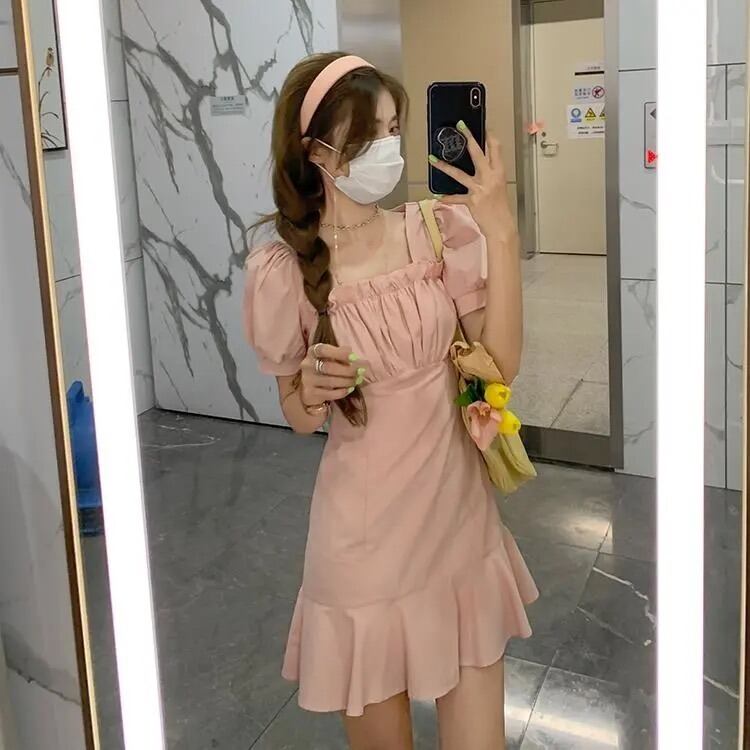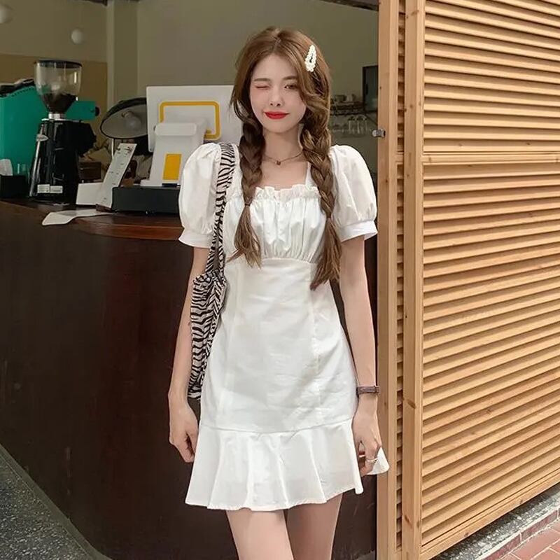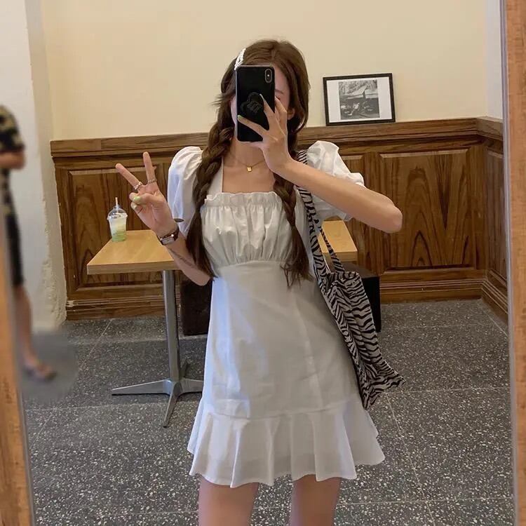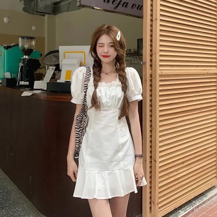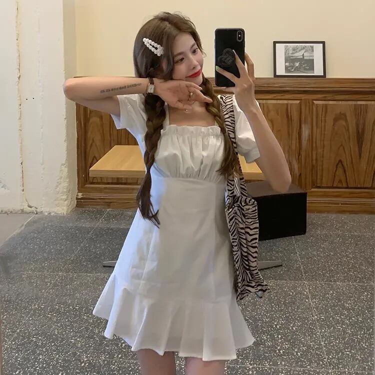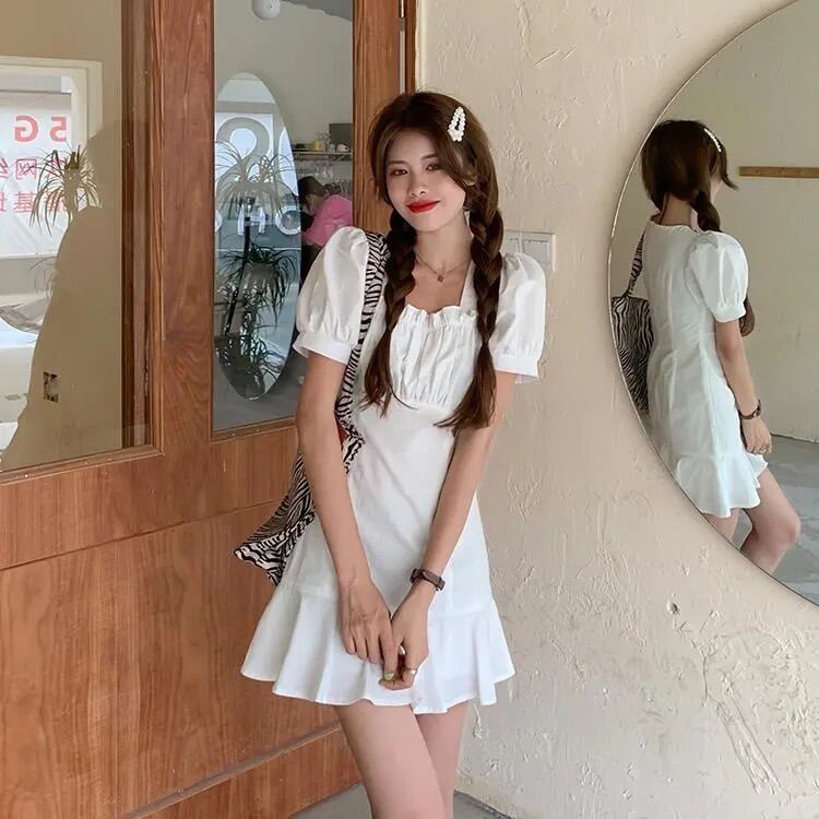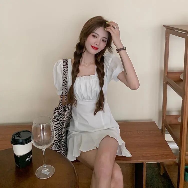 ホワイト半袖ワンピースレディースサマー薄手のスクエアネックシャツスカートデザインセンスウエストと薄手のパフスリーブショートスカート 夏物 スクウェア 7460022405275084 | framboise21